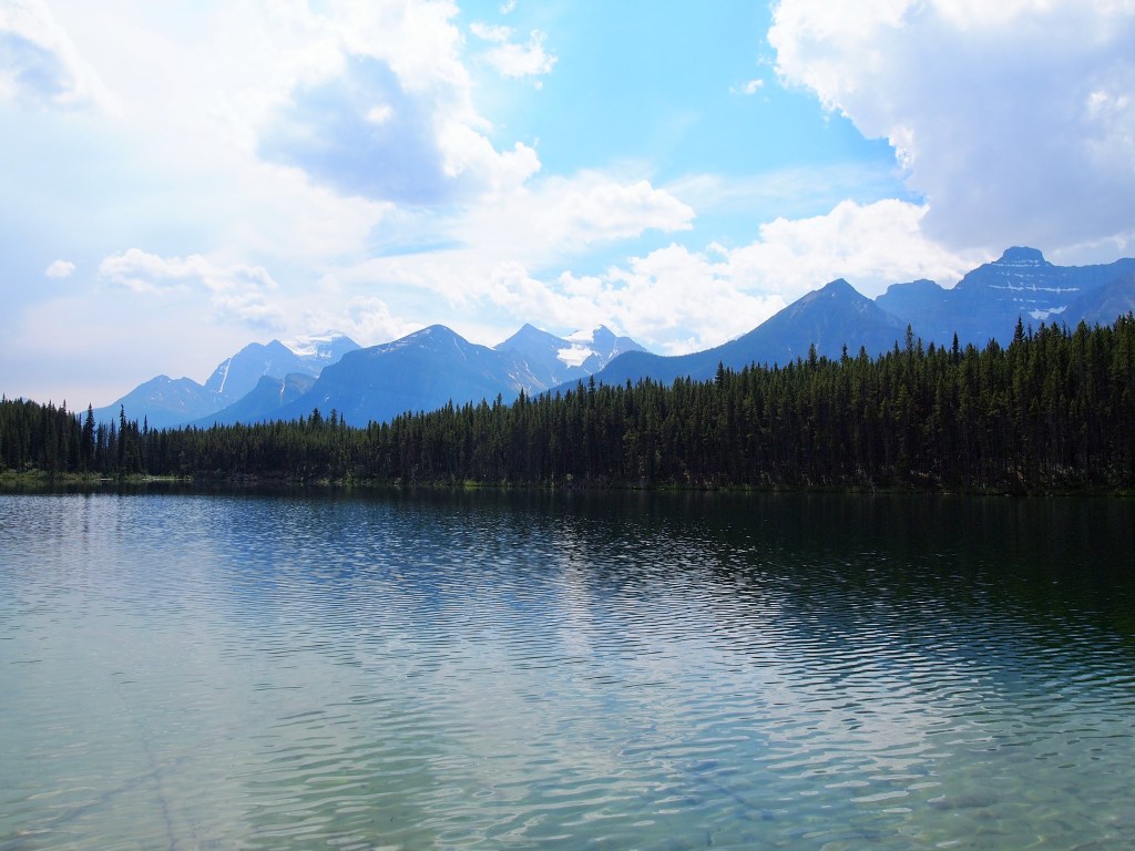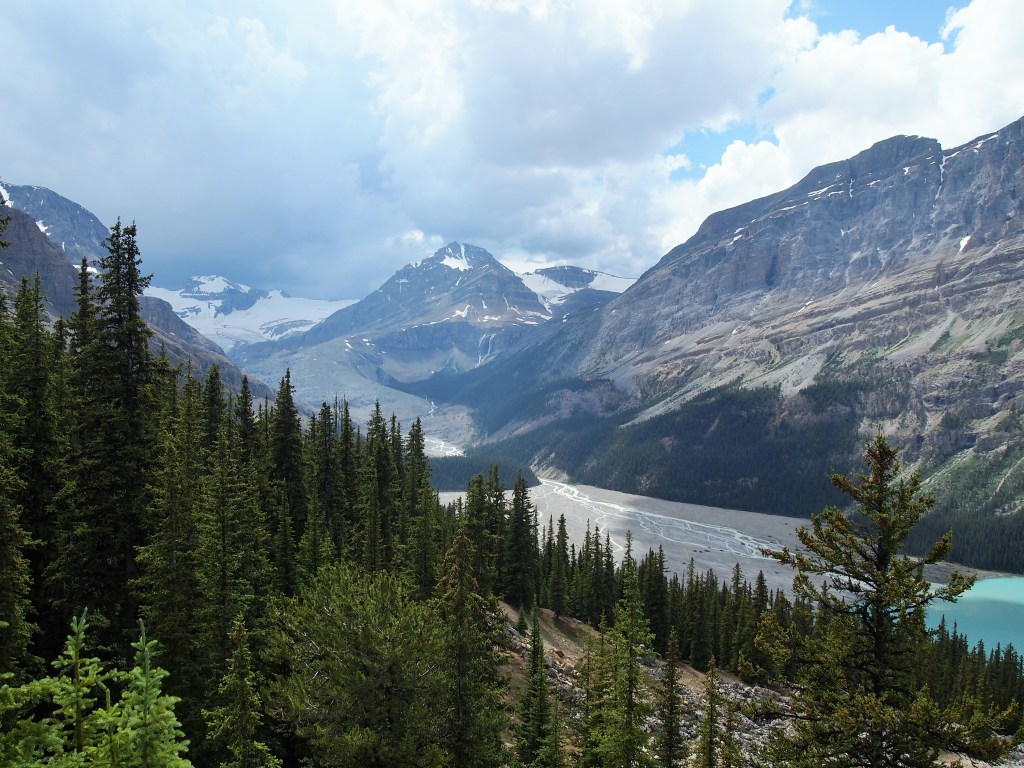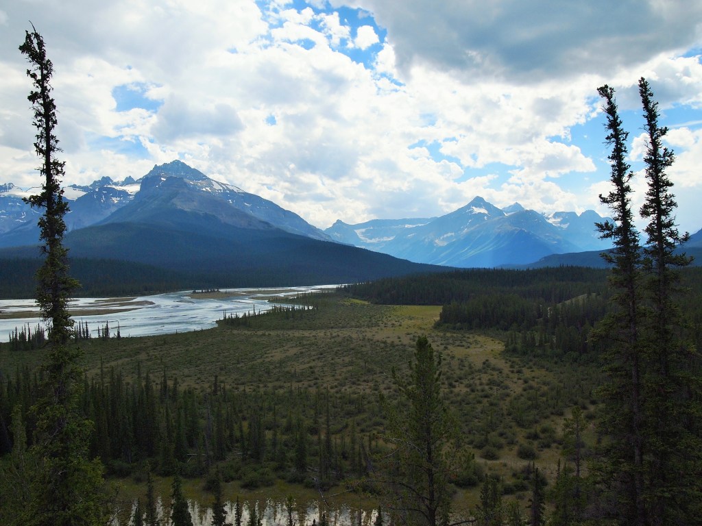 The weather began to shift as we walked back to our car and soon a dark sky brought thunder, lightning, and rain to our scenic drive. We re-joined the Trans-Canada Highway at Castle Mountain and by-passed Lake Louise (we would visit on our return from Jasper). The downpour was brief; by the time we reached our next stop it was over, and we had hope for a mostly sunny passage.