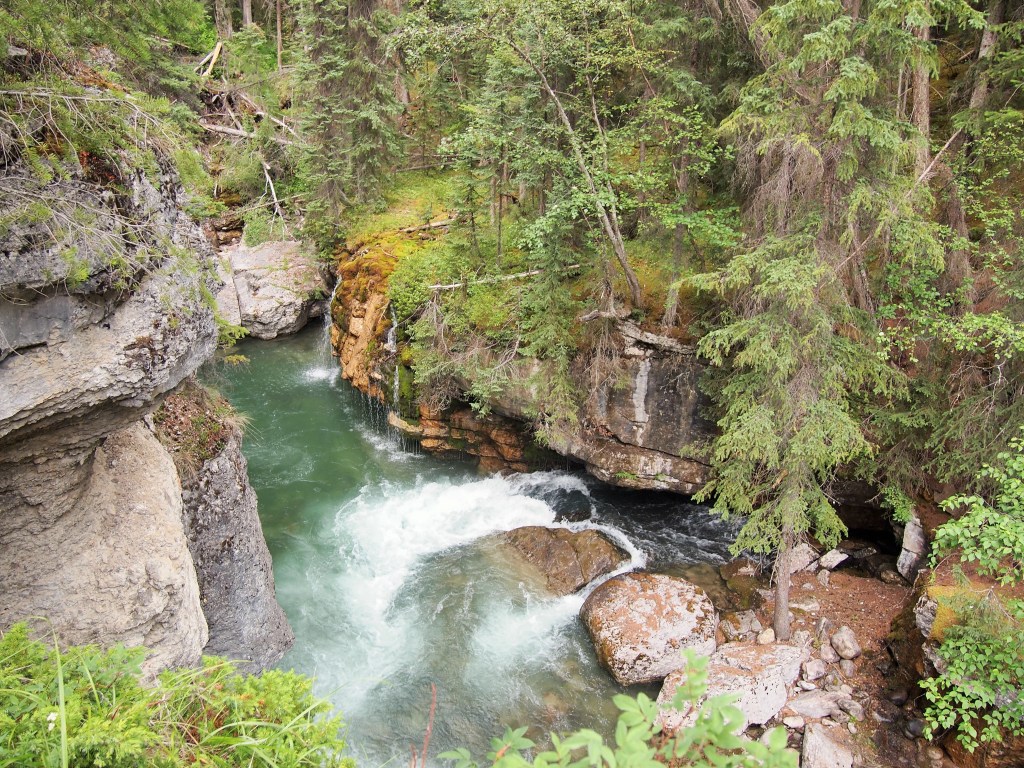 Maligne Canyon is one of the top sights in Jasper NP. Carved by the fast-flowing waters of the Maligne River, the canyon is 165 feet at its deepest point. The top of the canyon remains so narrow in places that it would be simple to hop across. A series of six bridges crisscross the canyon and river. Most people begin at the top of the canyon, where a teahouse operates in the summer months, and walk down to the first and second bridges. However, a trail leads from the parking lot down to the sixth bridge at the confluence of the Maligne and Athabasca Rivers. For a more comprehensive visit, we opted to start at Sixth Bridge, walk up the canyon, and loop back down.