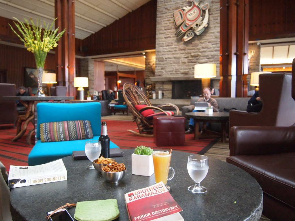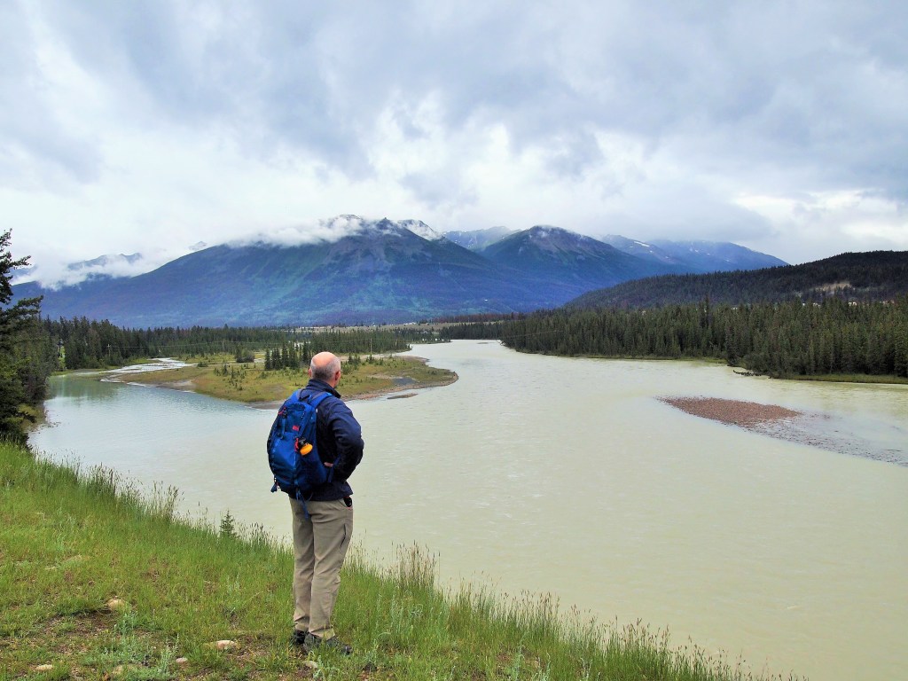We had a pleasant walk to the lodge without rain. We were both chilled though, and it was wonderful to arrive at the lodge for a warm drink and a snack. We plopped down in the lodge’s cozy sitting area, ordered a couple drinks and a snack, and stayed for almost two hours. While we were there it started to rain again – a steady, cold rain. I didn’t look forward to going back out. Instead of following the same trail back, I used my GPS to locate another trail, so we could turn our journey into a loop. It wasn’t perfect, but it did give us nice views of the Athabasca River.