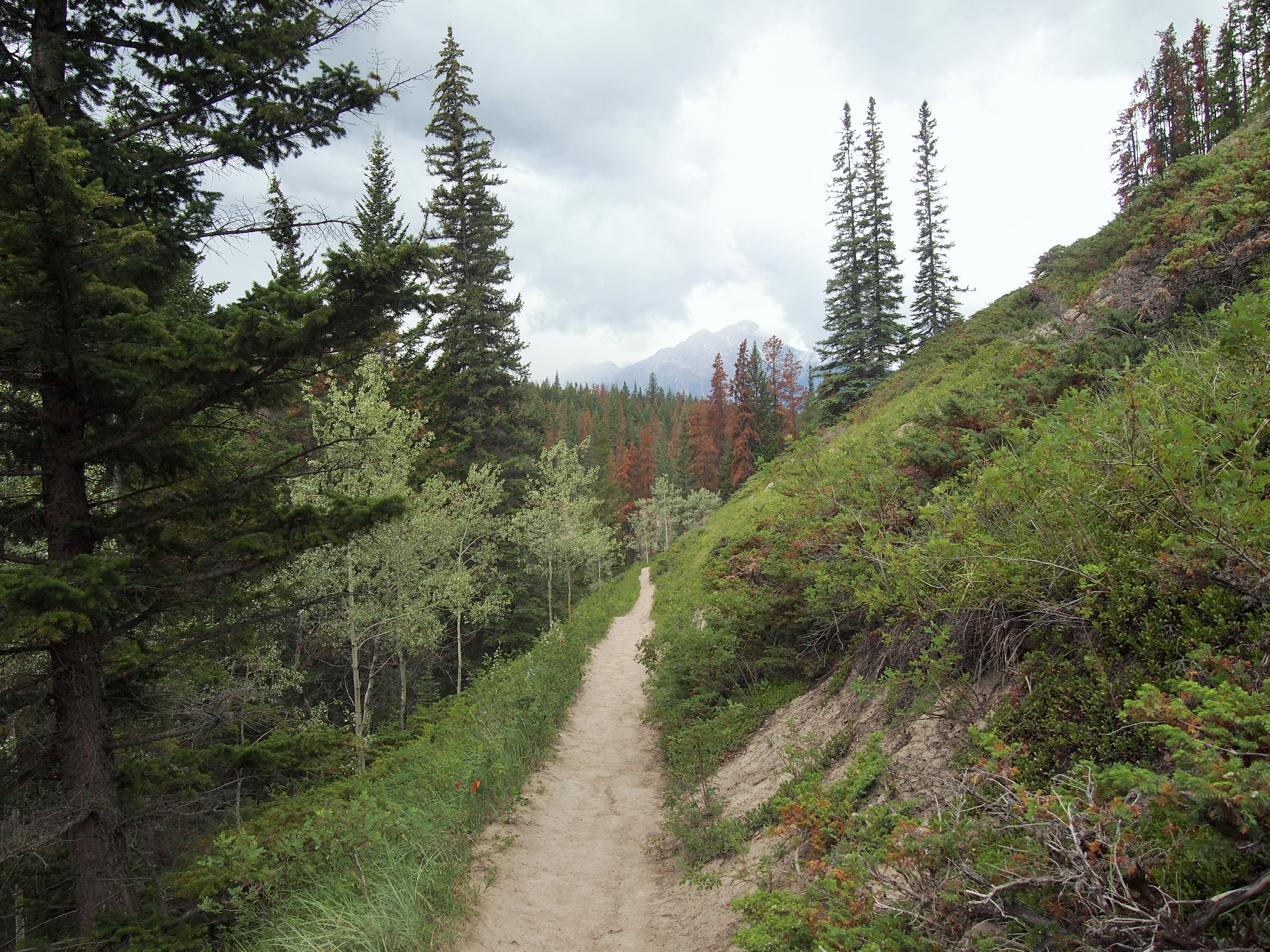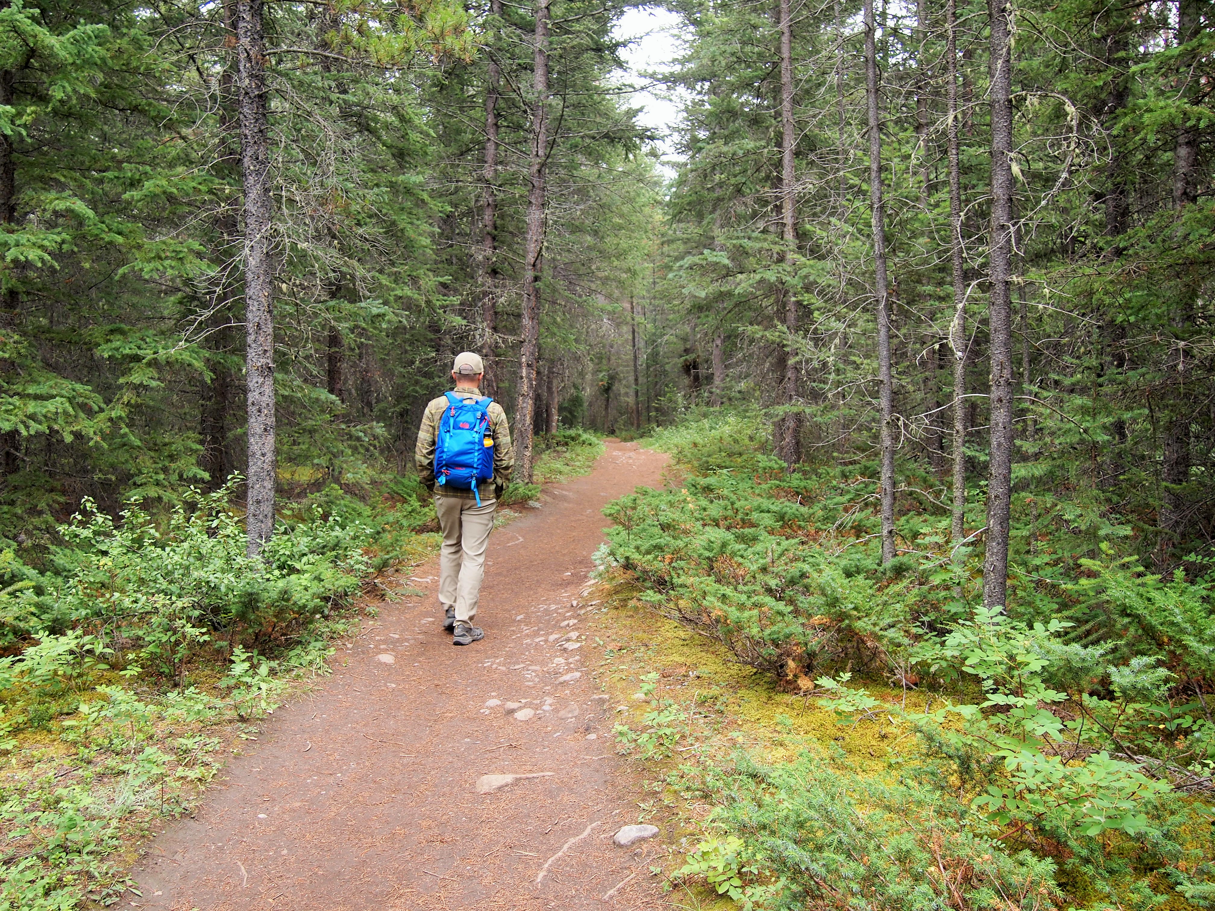 We went back into town to re-group and figure out our next move. The rain had stopped, so we popped into the visitor center in town to grab a hiking map and ask for a recommendation. Since it was snowing at higher elevations and it was already late afternoon, the park ranger suggested we do a hike from Lake Annette to the Jasper Park Lodge where we could stop for a drink before going back to our car. That sounded pretty enticing. So, we hopped in the car and drove to Lake Annette. One of the other trails had recently been closed due to a grizzly attack on two mountain bikers. We were the only people out, so we kept our eyes peeled and made plenty of noise.