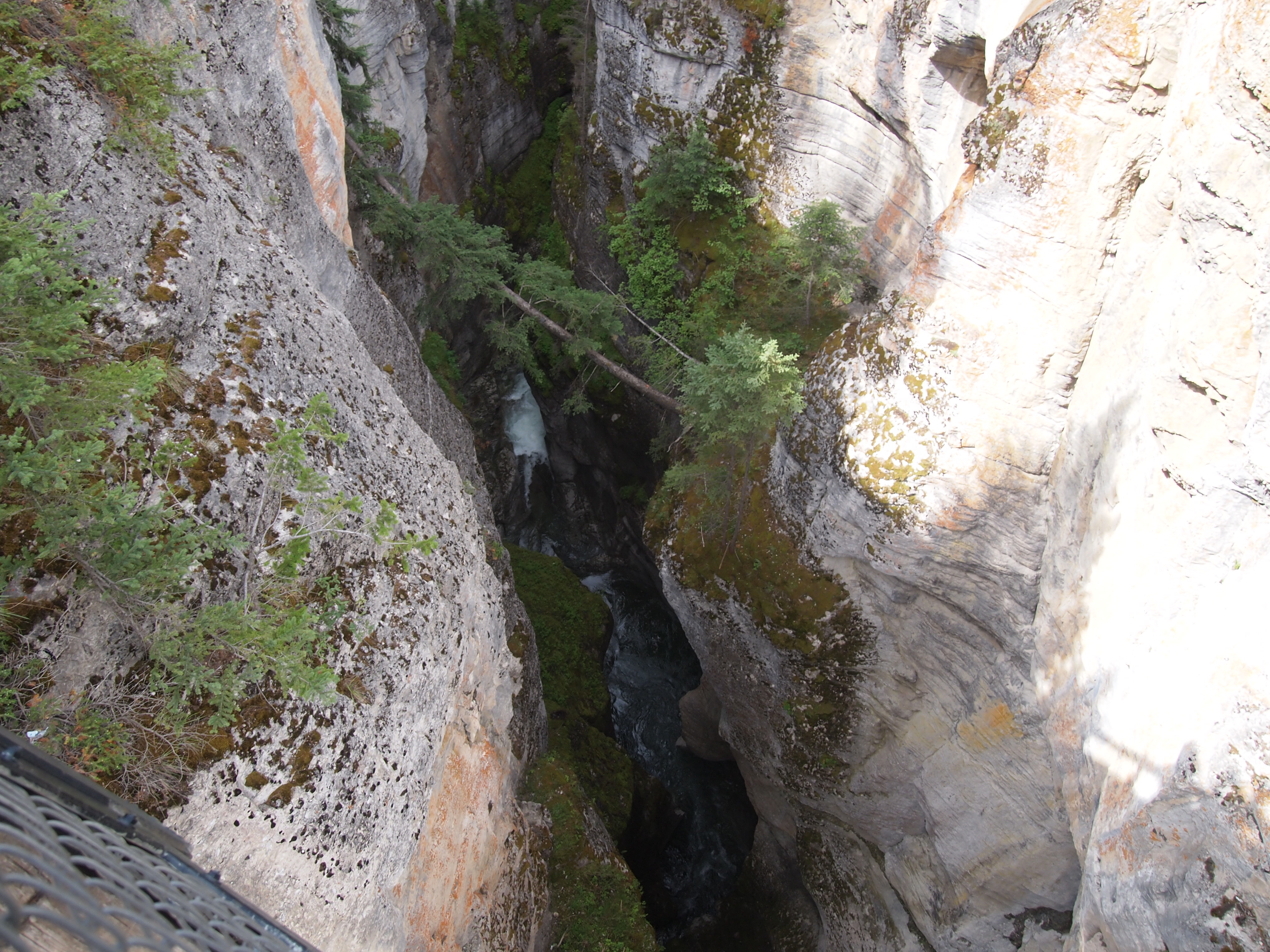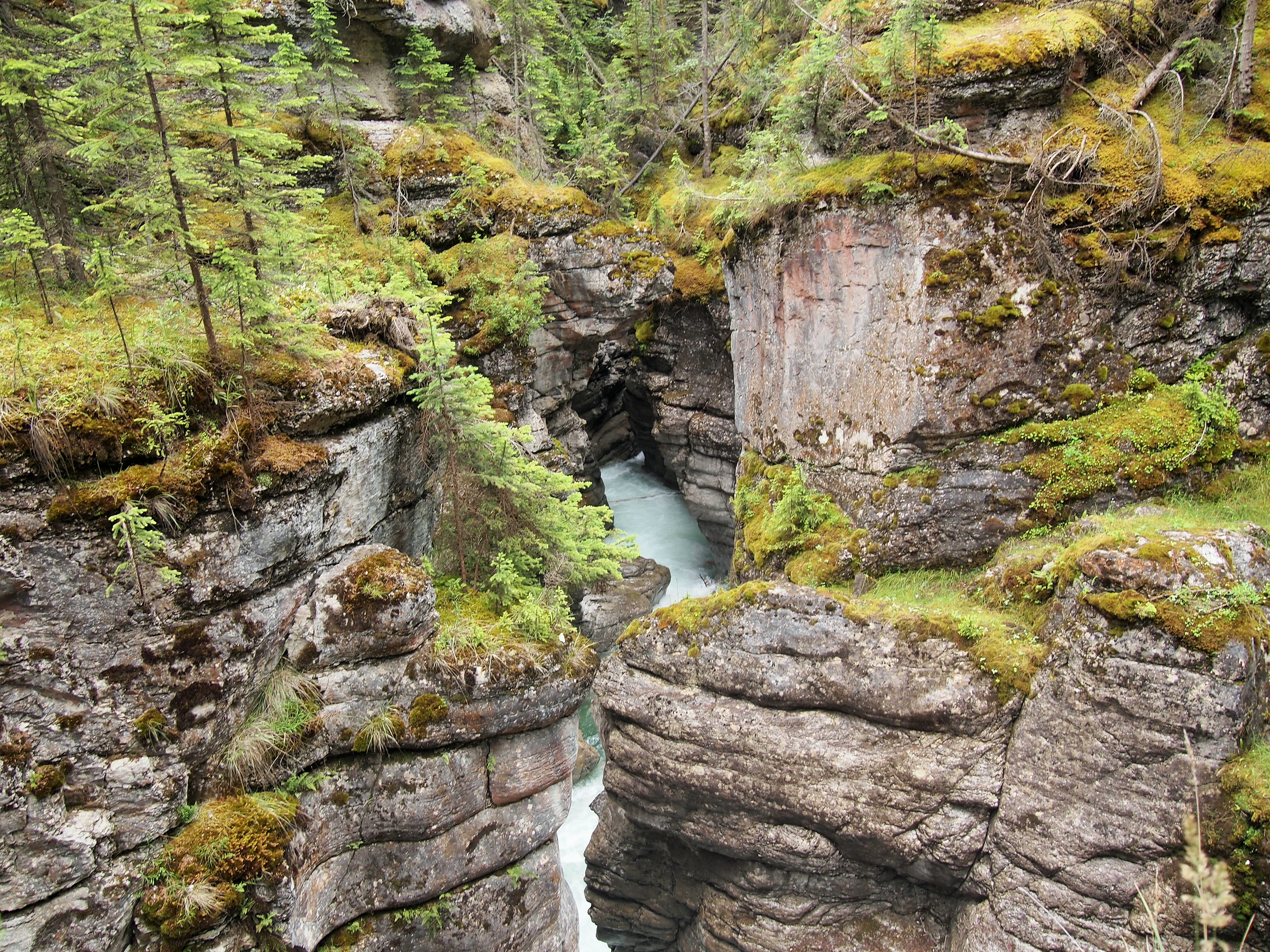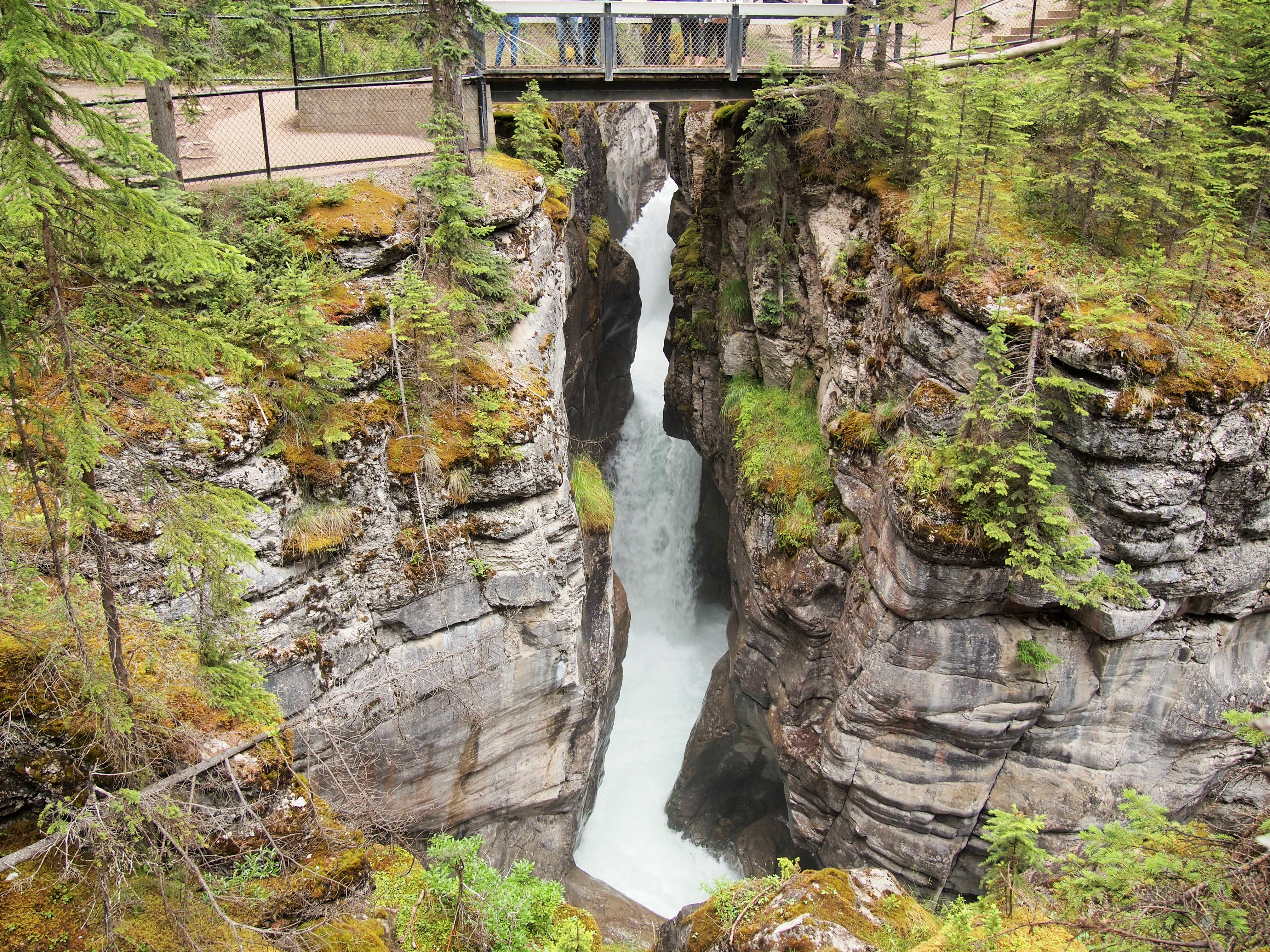 Maligne Canyon is one of the top sights in Jasper NP. Carved by the fast-flowing waters of the Maligne River, the canyon is 165 feet at its deepest point. The top of the canyon remains so narrow in places that it would be simple to hop across. A series of six bridges crisscross the canyon and river. Most people begin at the top of the canyon, where a teahouse operates in the summer months, and walk down to the first and second bridges. However, a trail leads from the parking lot down to the sixth bridge at the confluence of the Maligne and Athabasca Rivers. For a more comprehensive visit, we opted to start at Sixth Bridge, walk up the canyon, and loop back down.