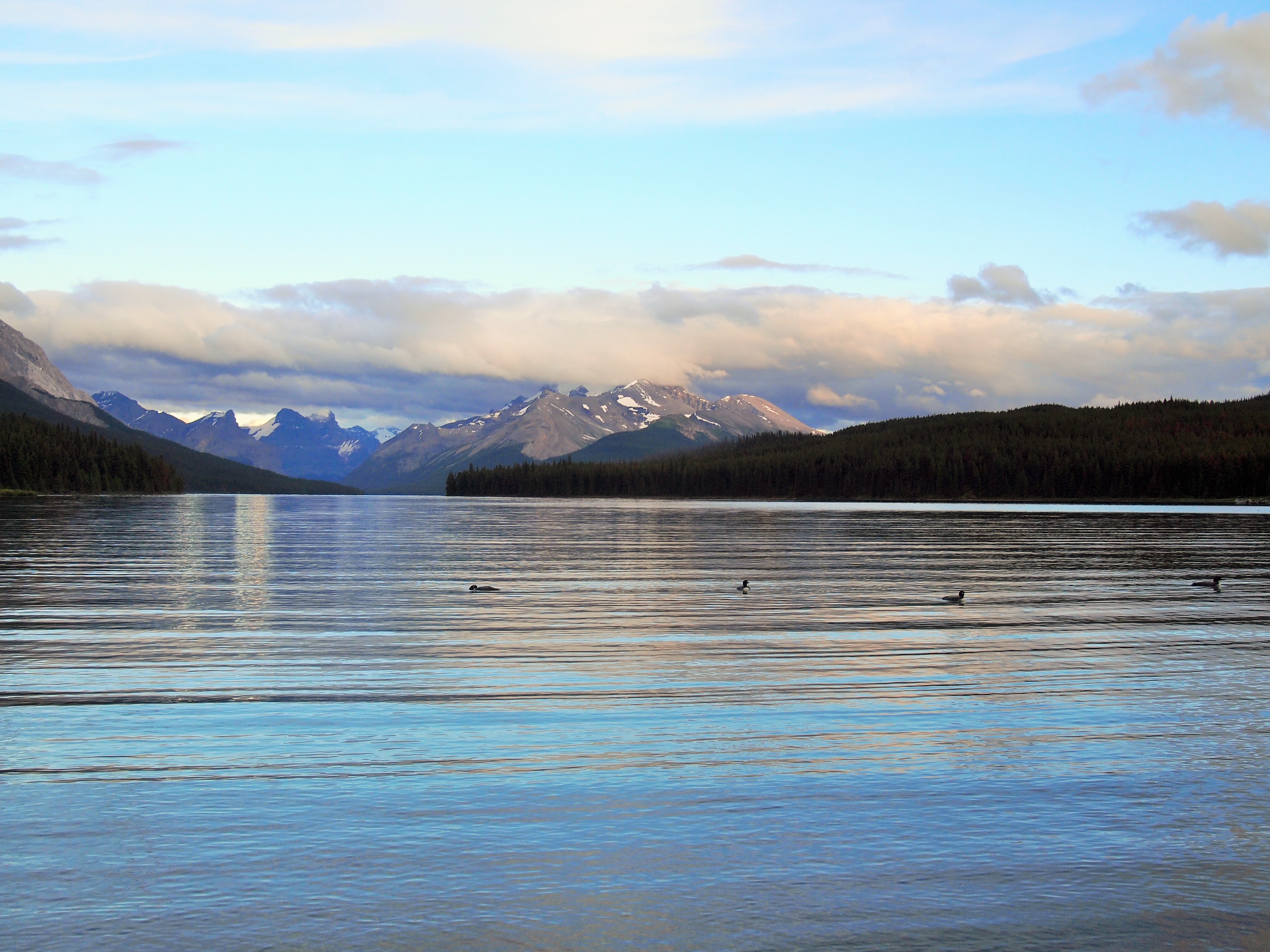 While we were hanging out at the lodge, Zach checked the radar. It looked like we might have a decent chance of catching Maligne Lake without rain. So, we decided to drive out and give it a shot. We felt more and more optimistic as we drove toward the lake; the clouds seemed to be clearing out and we could see blue sky! We arrived at the lake around 8pm. The crowds were long gone – the last tour boats go out at 5pm – and it was still. It was cold, 44 degrees, but we felt so lucky.