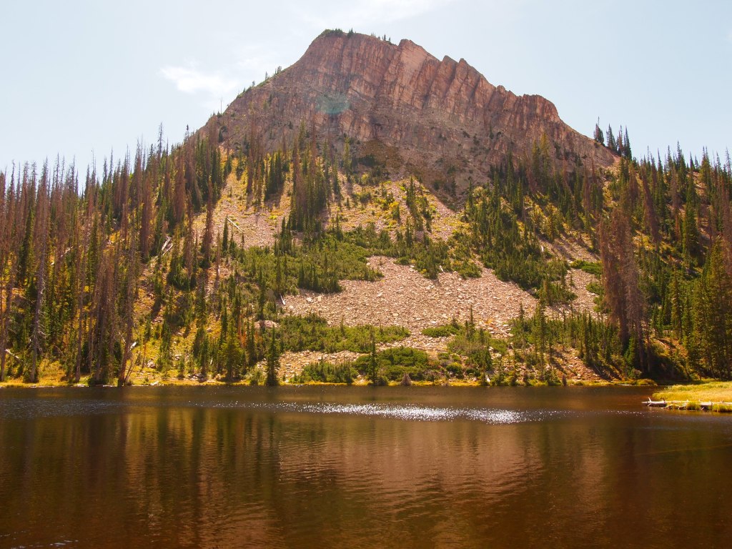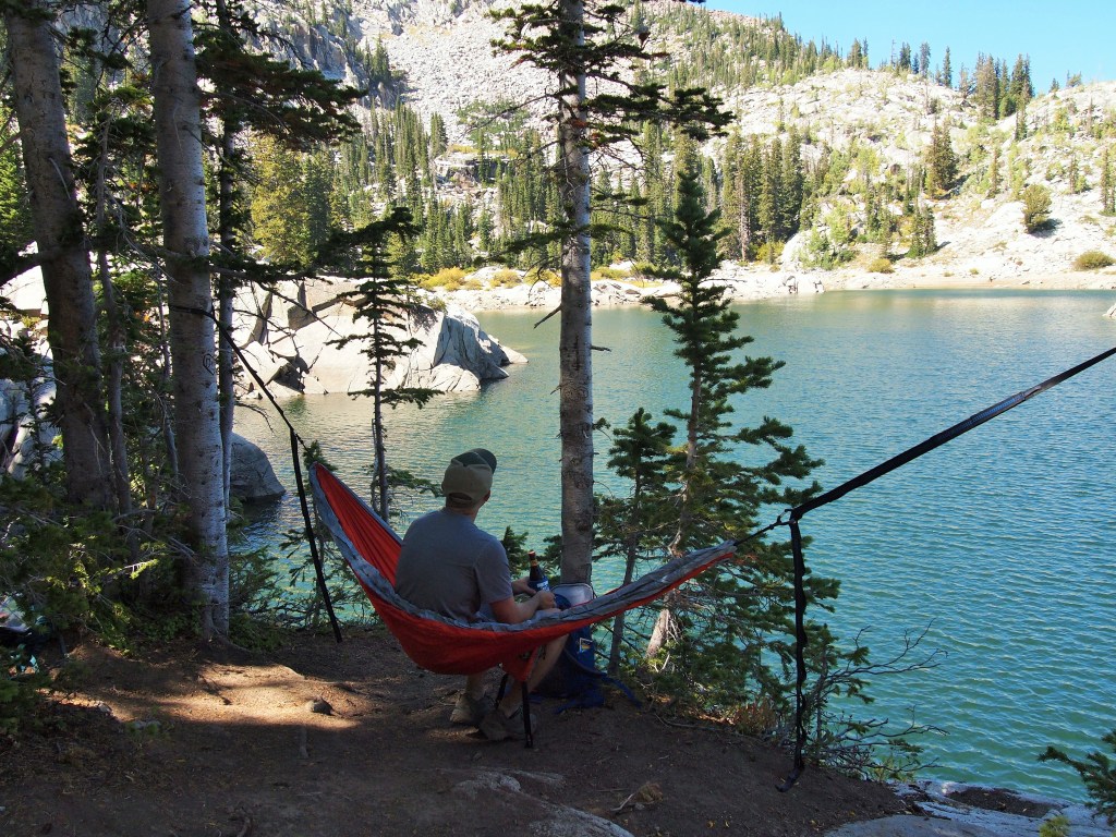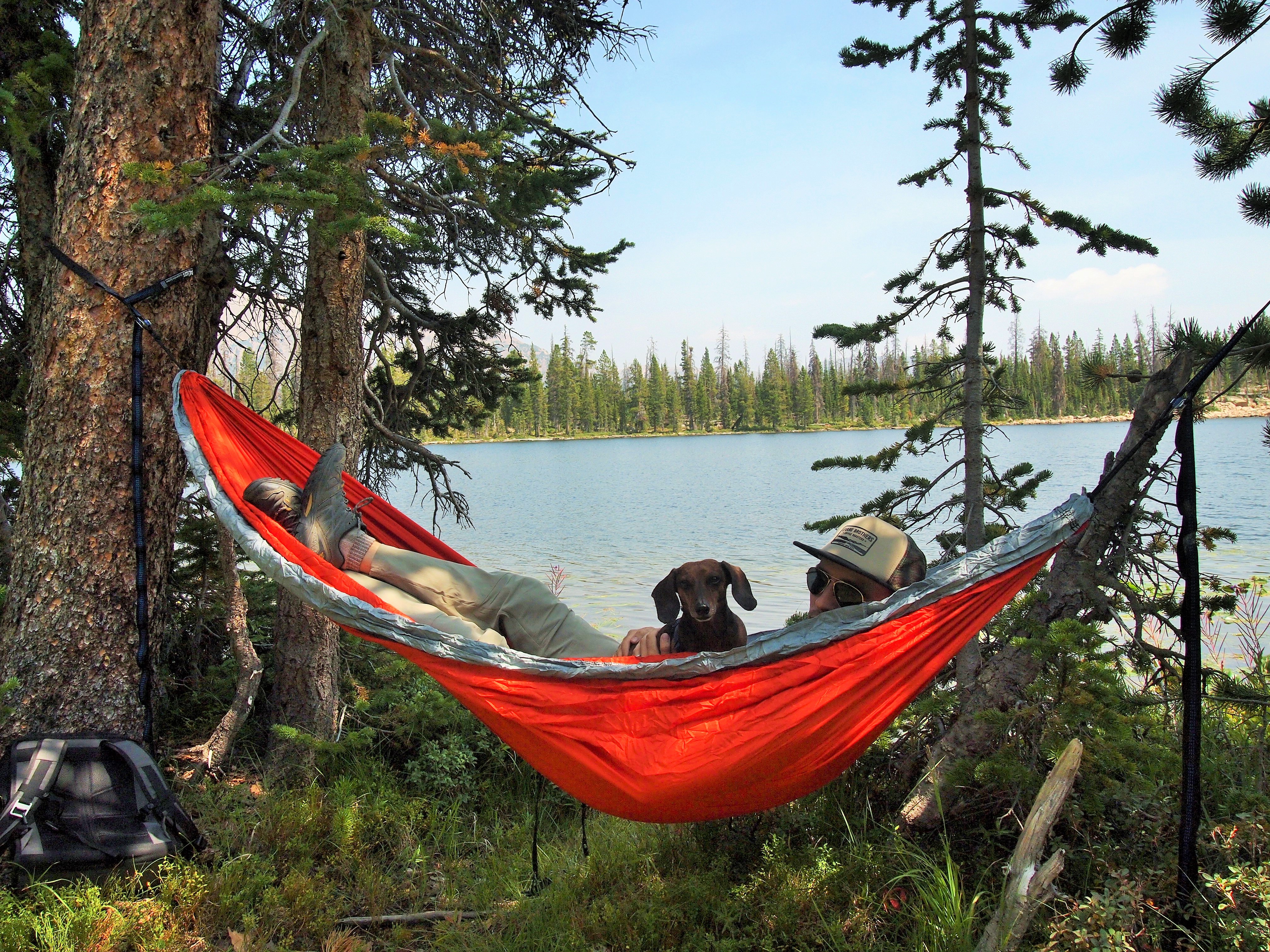 This was supposed to be a short simple hike to a bourbon-colored lake. When we arrived at the trailhead, there weren’t any other cars. We felt like we’d won the Uinta jackpot – no other people! We weren’t far up the trail when we came upon a moose cow with her calf. Initially, we thought the trail was leading us away from them, but it turned straight toward them. We spent the next twenty minutes slowly advancing up the trail trying to stay far enough away. It felt like ages when we finally reached a point where the trail split, one path led to a dead-end at Whiskey Creek and the other led up toward the lake. I took Truman up to the creek while Zach scoped out the trail. Soon, I saw Zach backing slowing down the trail. He told me to be ready to jump the creek. No sooner had I picked up Truman, than I glanced up and the moose cow was standing above us. I bolted across the creek and up a steep rise before turning around. She continued up the bank, but kept an eye on us. It was terrifying. Truman didn’t seem to understand what was going on, so he didn’t bark at all – phew. We waited a little while and decided to continue up the trail. We kept eyes on them as best we could, and thankfully, the trail finally led away from the cow and calf. We easily made it to the lake – which we had to ourselves – and set up for a leisurely afternoon.