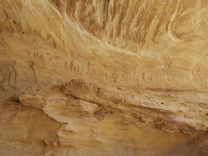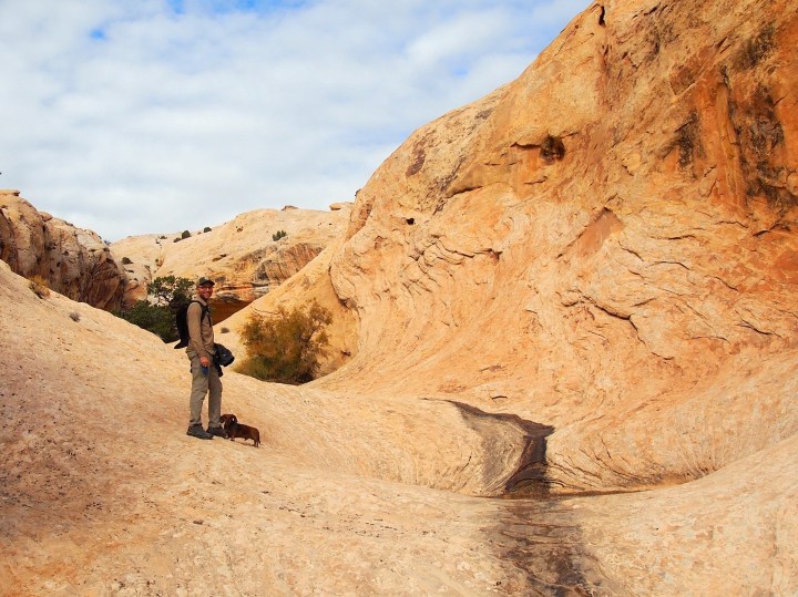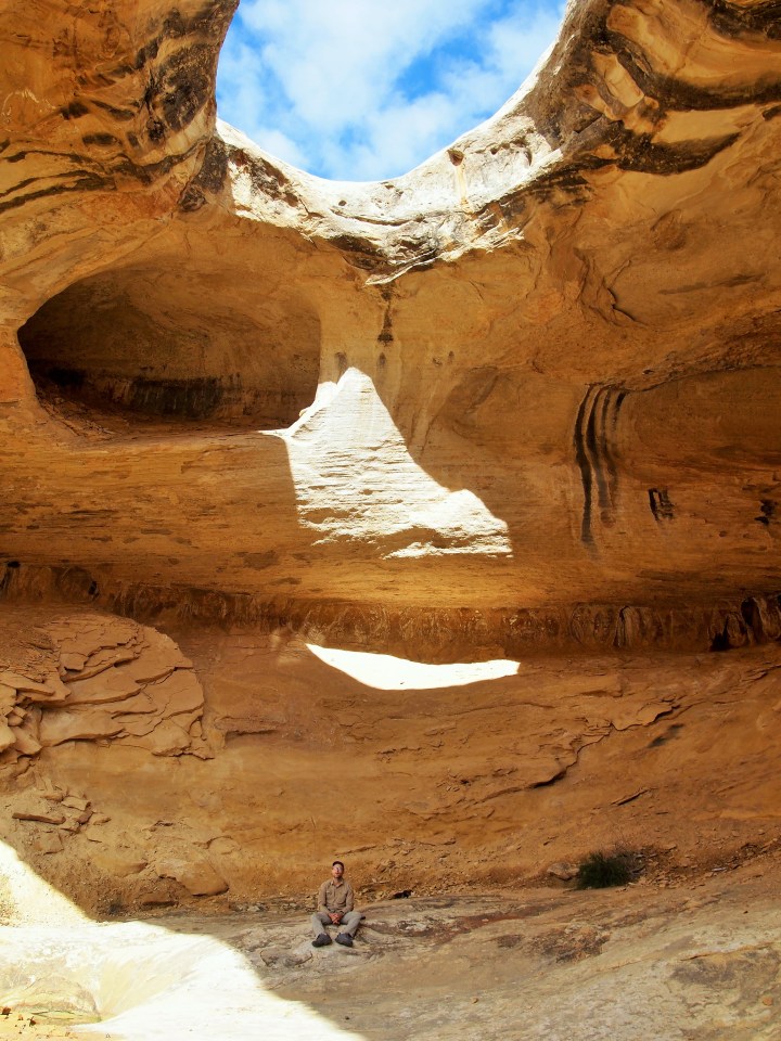 Up along the edge of the alcove we noticed some petroglyphs. It wasn’t terribly easy to get up there, and Tru wanted to follow Zach, so I stayed below with him. They weren’t very pronounced, kind of faint against the light-colored rock, but impressive as always. From his perch near the petroglyphs, Zach was able to snap a photo of me and Tru below the pothole arch giving a nice perspective of the space.