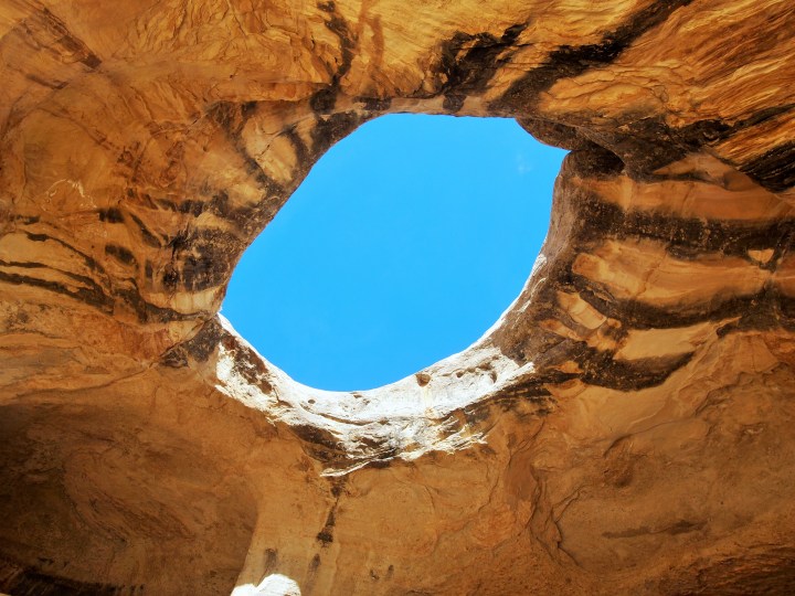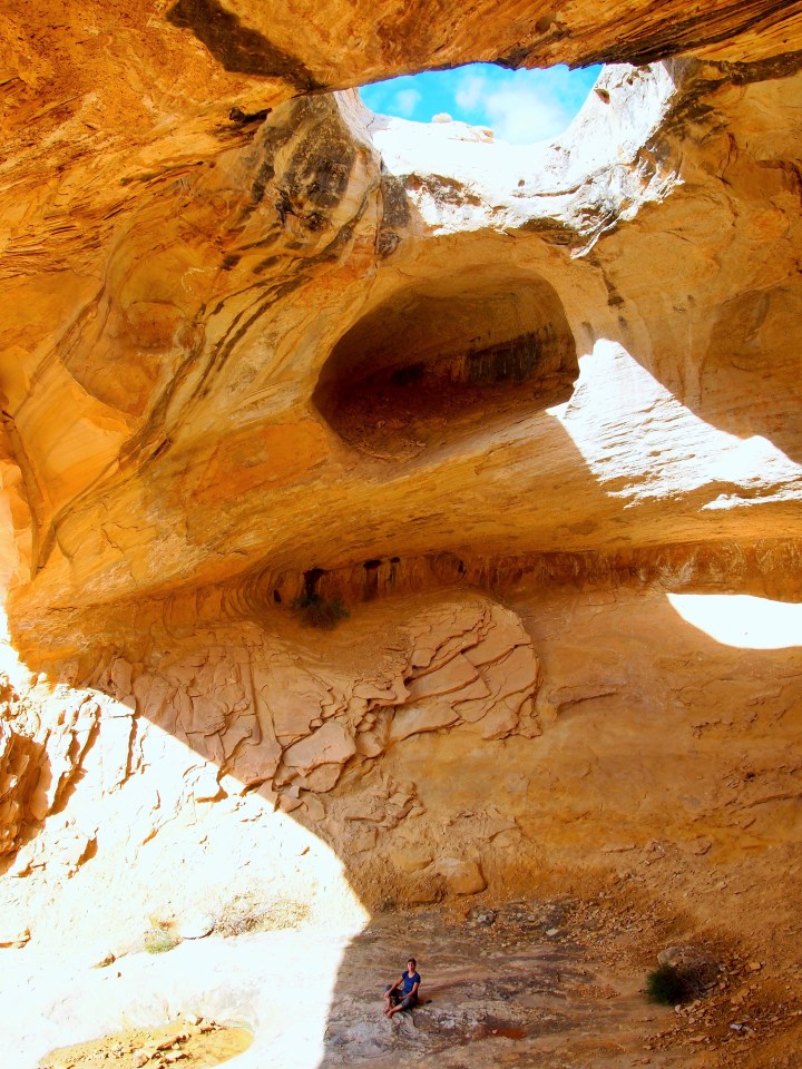 We arrived at the window, and we had it completely to ourselves. We’d seen a family hiking around on the slickrock in the distance, but they appeared to be headed down. The window is a natural bridge which opens up into a large alcove with a pothole arch at the top. The twin bridges are sometimes called the Eyes of Sinbad.