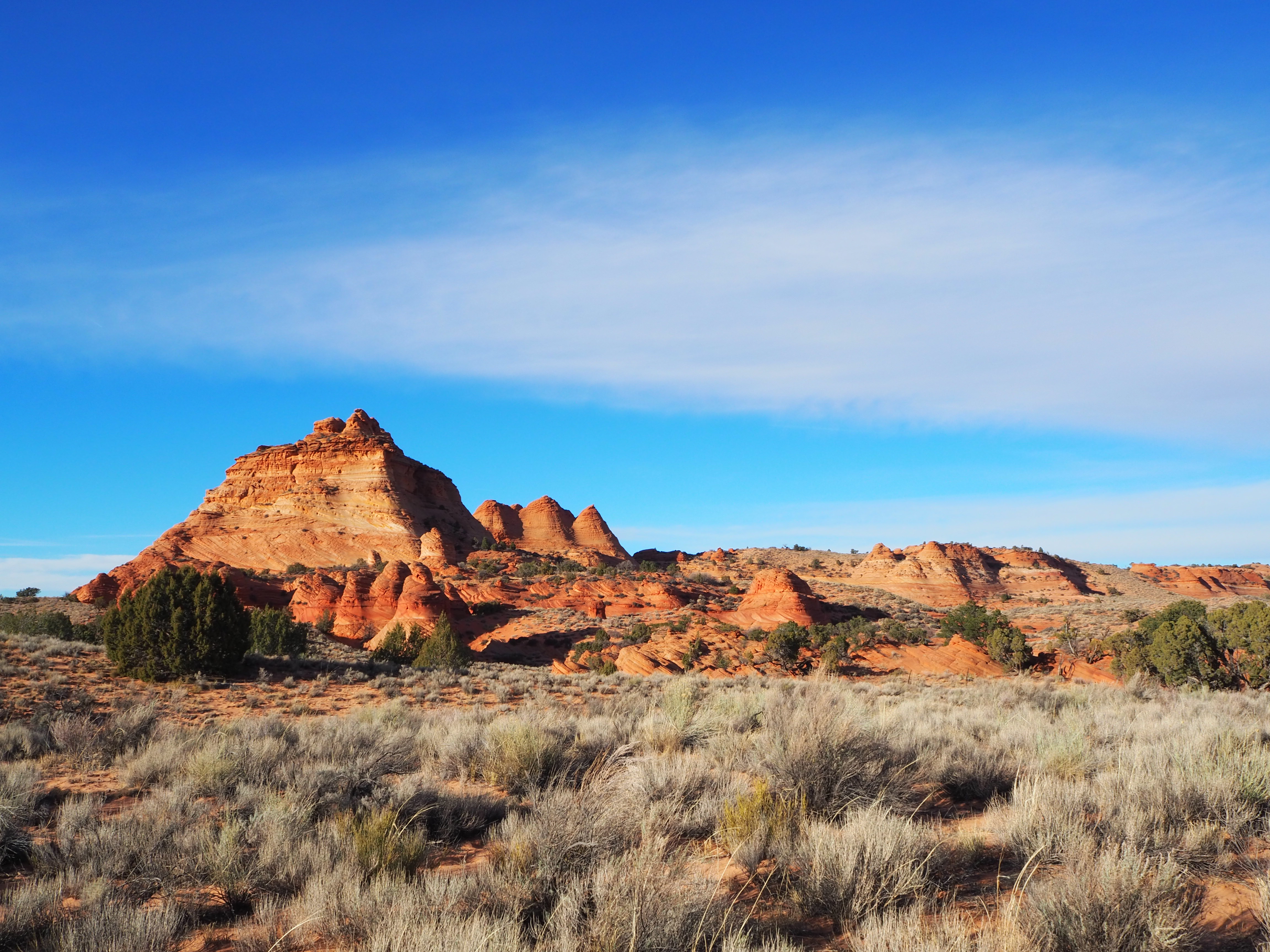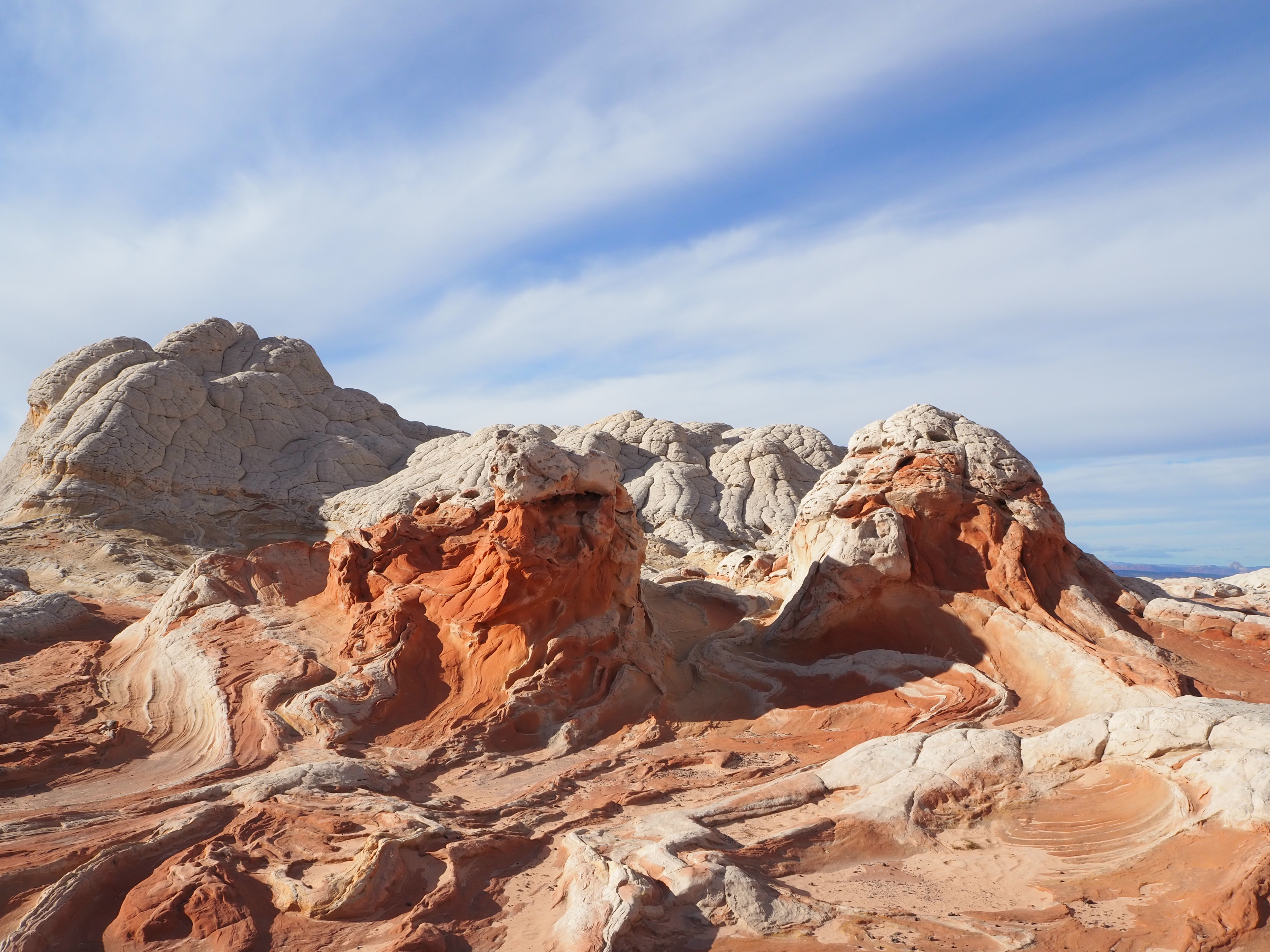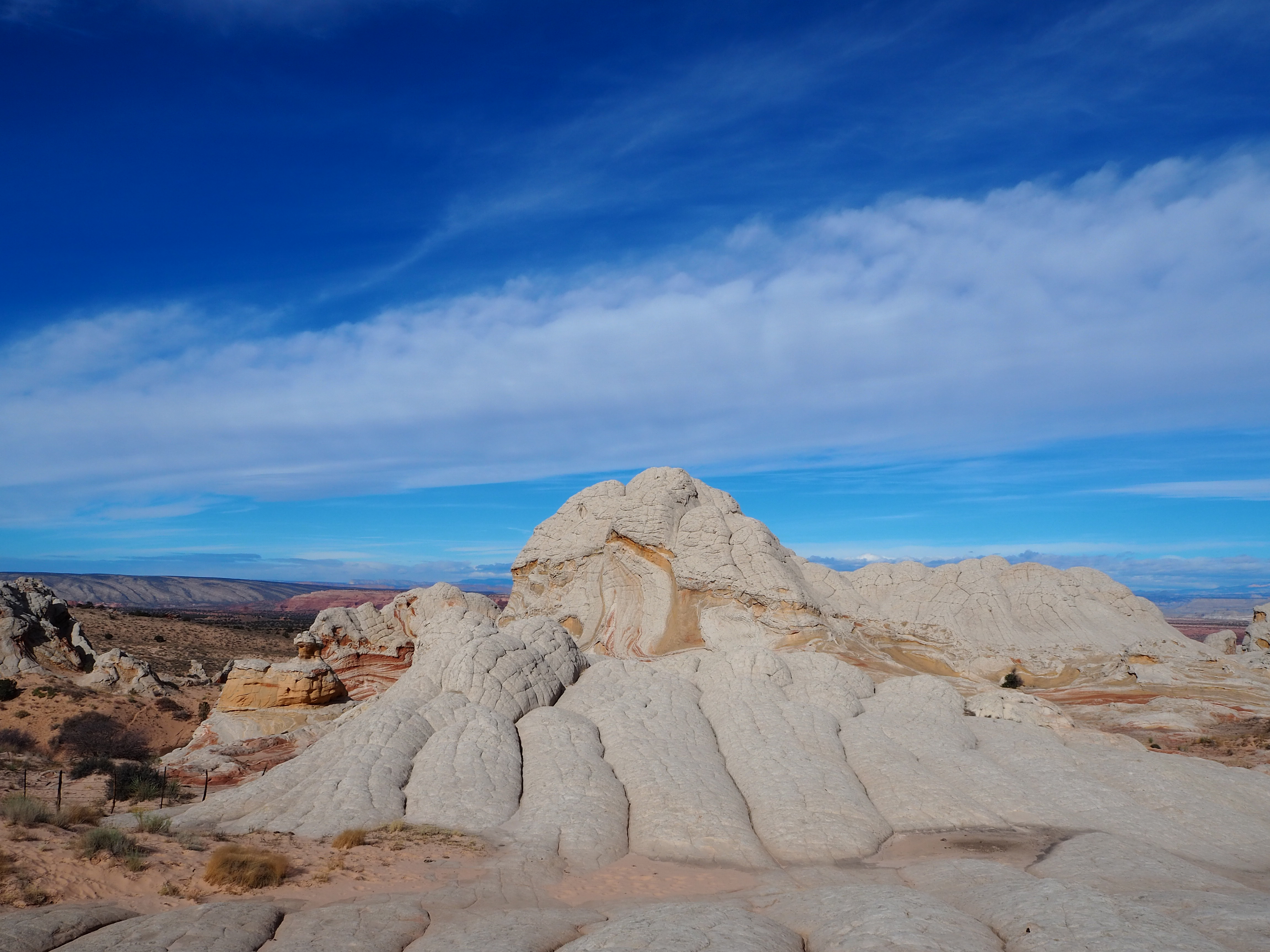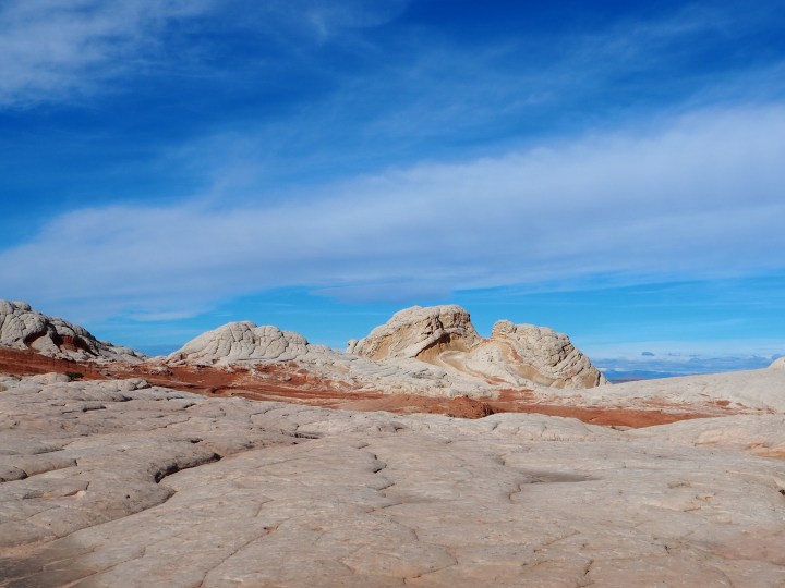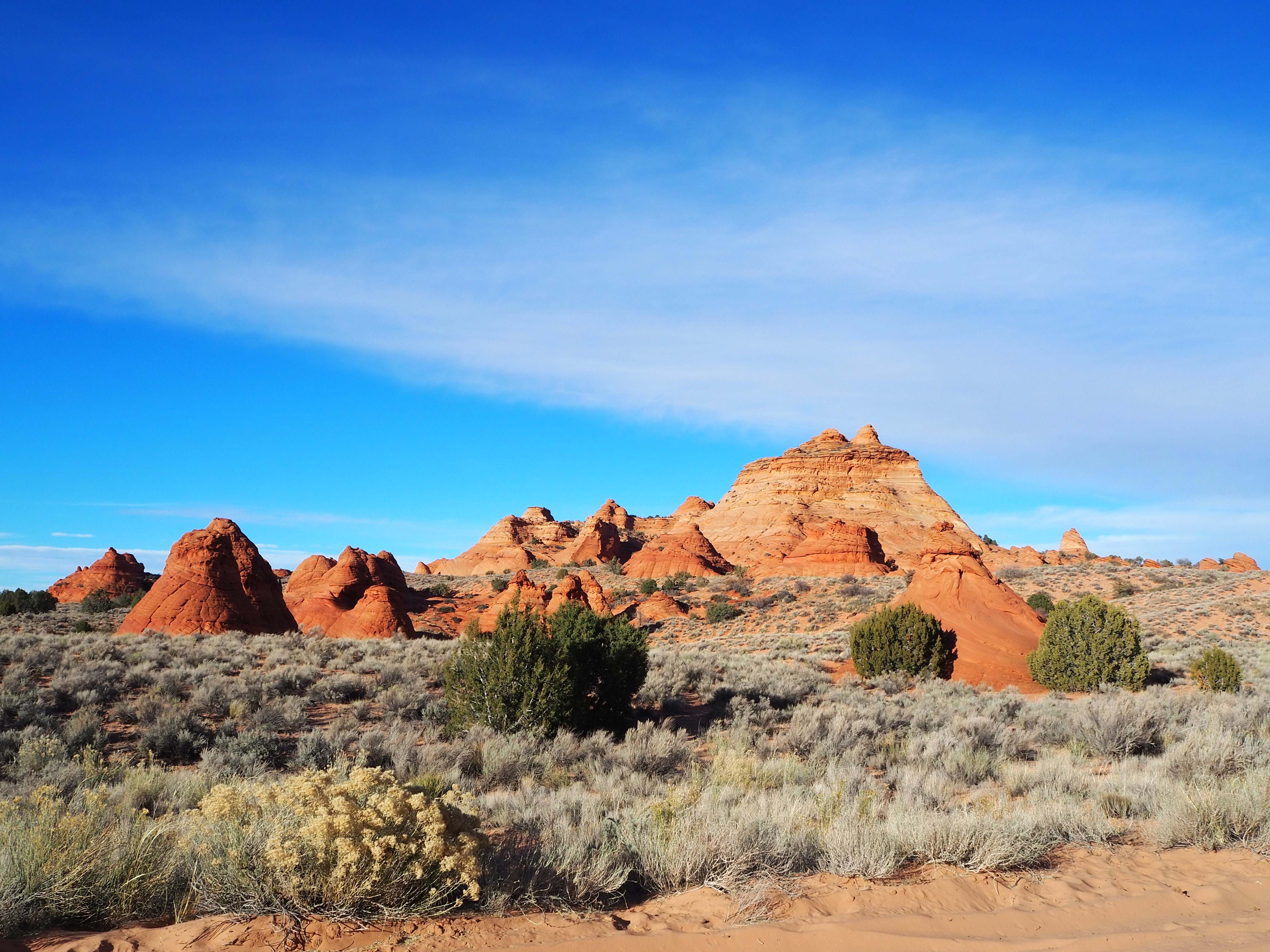 In Vermilion Cliffs NM, the Paria (Puh-ree-yah) Plateau is a defining feature. Primarily comprised of sandy plains with scrubby bushes and juniper trees, there are various outcrops of Navajo sandstone which have been contorted by the elements into interesting shapes and designs. North and South Coyote Buttes (where The Wave is located) are the more well-known examples of this. White Pocket is similar, though the hues are more white and grey than red and orange. While a permit is required for both of the Coyote Buttes, none is currently required for White Pocket.