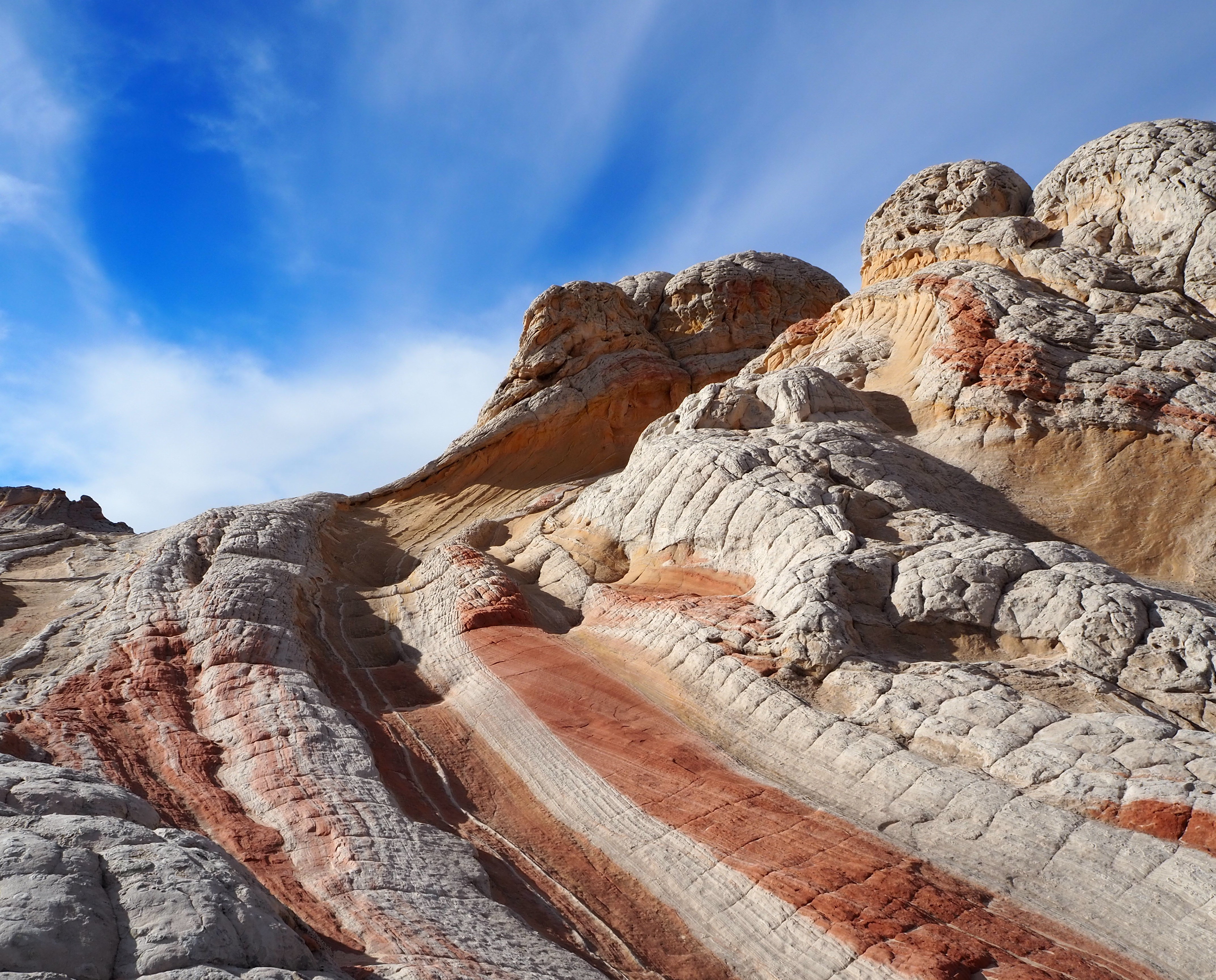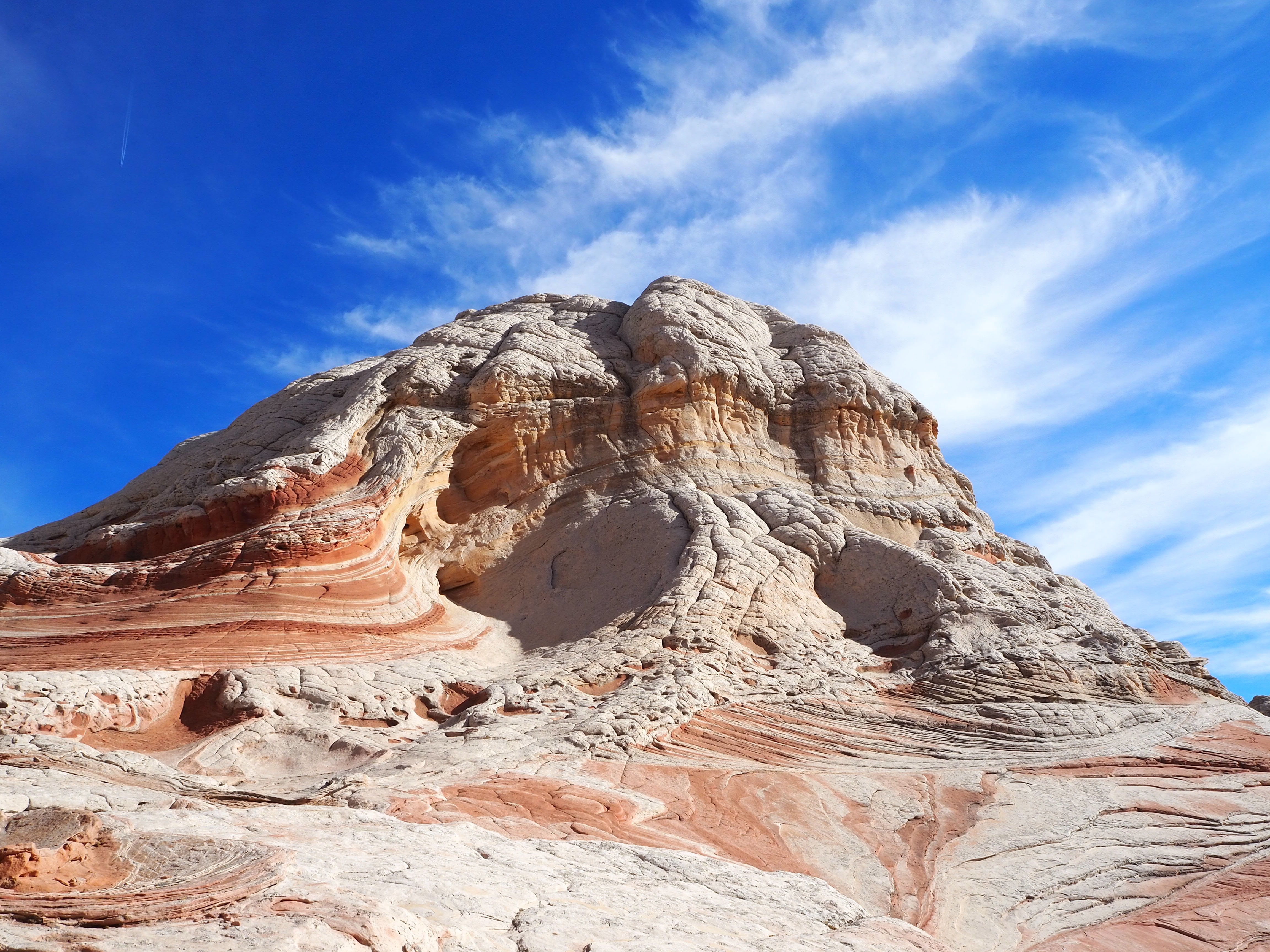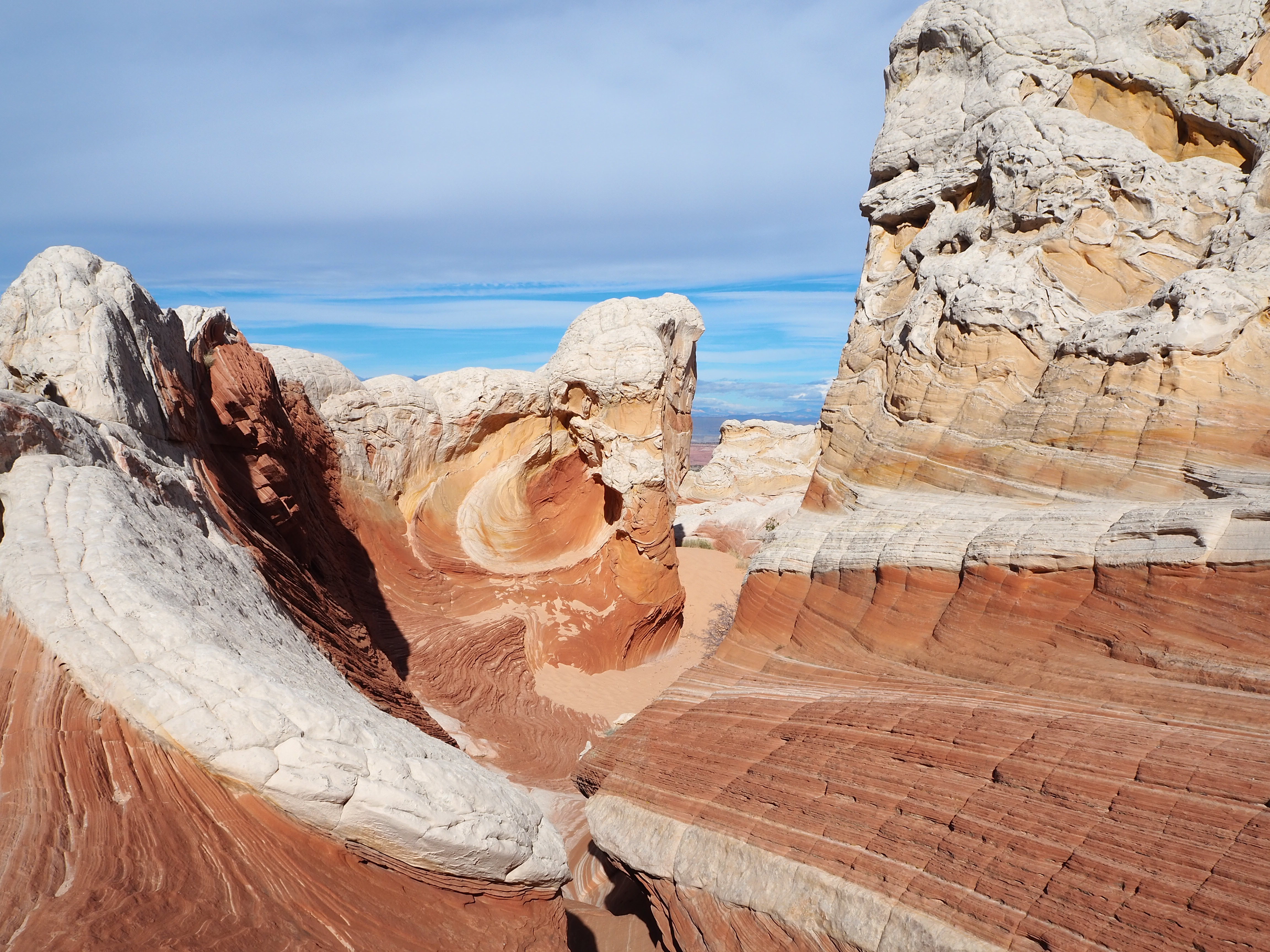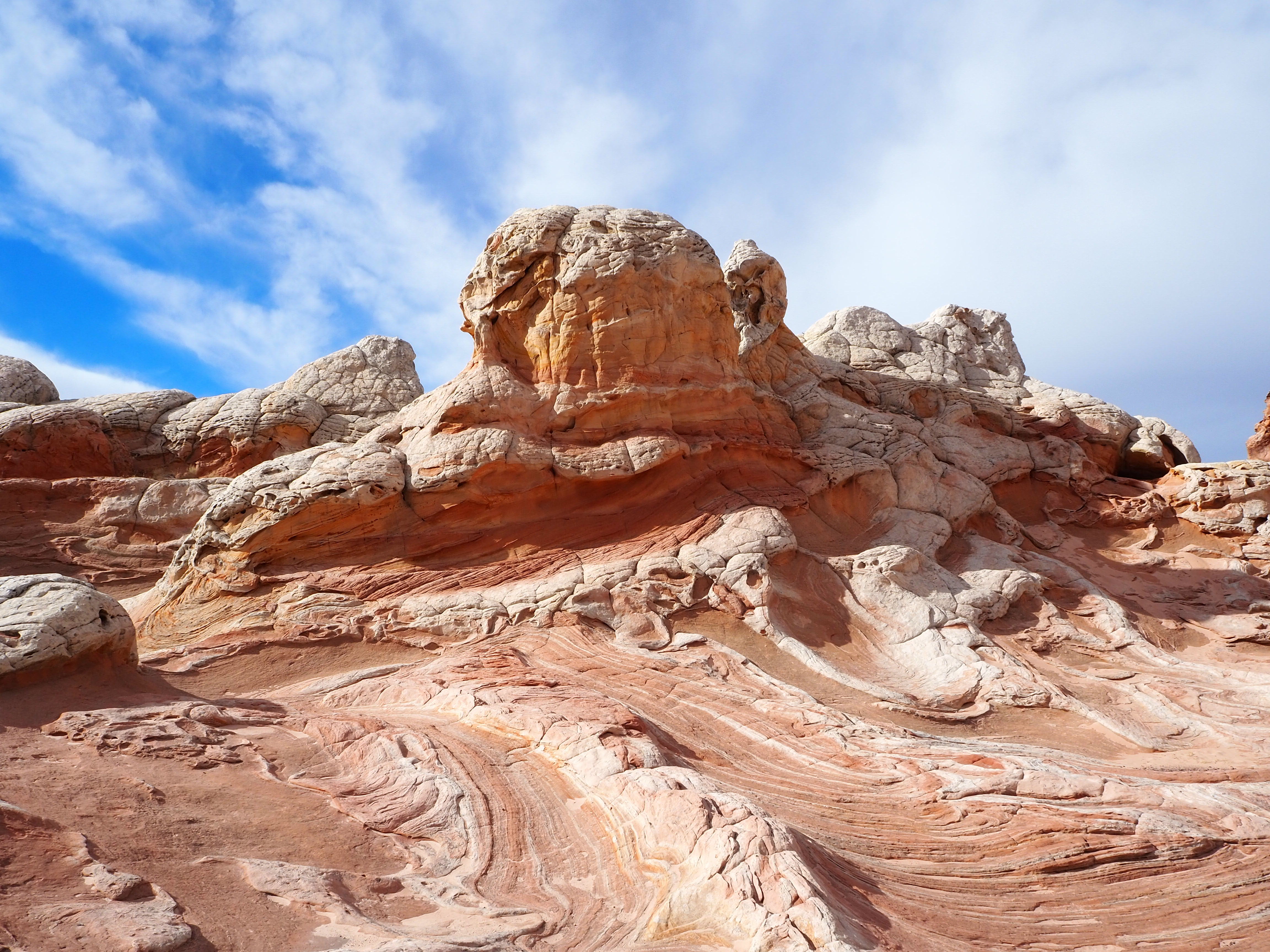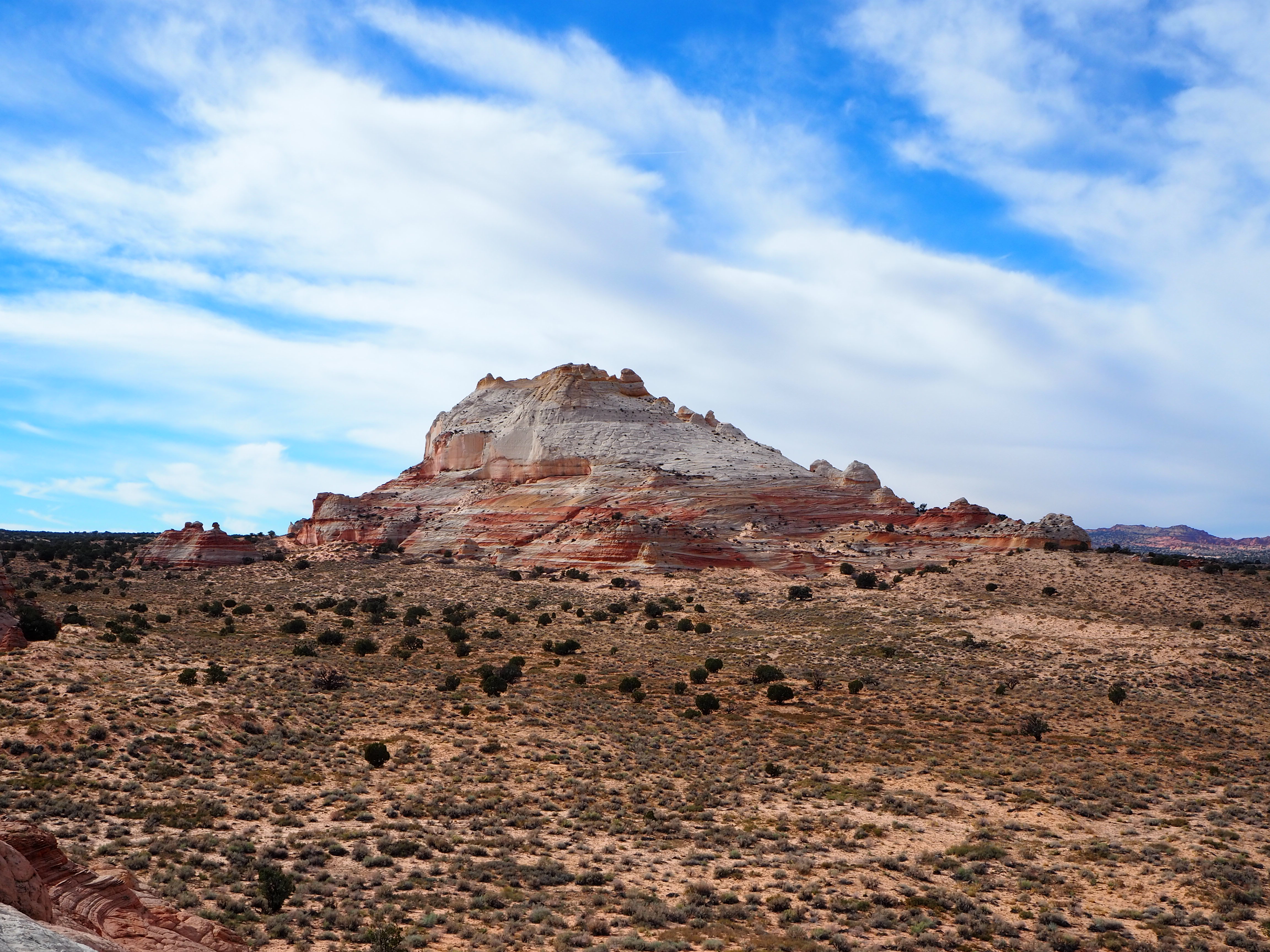 In Vermilion Cliffs NM, the Paria (Puh-ree-yah) Plateau is a defining feature. Primarily comprised of sandy plains with scrubby bushes and juniper trees, there are various outcrops of Navajo sandstone which have been contorted by the elements into interesting shapes and designs. North and South Coyote Buttes (where The Wave is located) are the more well-known examples of this. White Pocket is similar, though the hues are more white and grey than red and orange. While a permit is required for both of the Coyote Buttes, none is currently required for White Pocket.