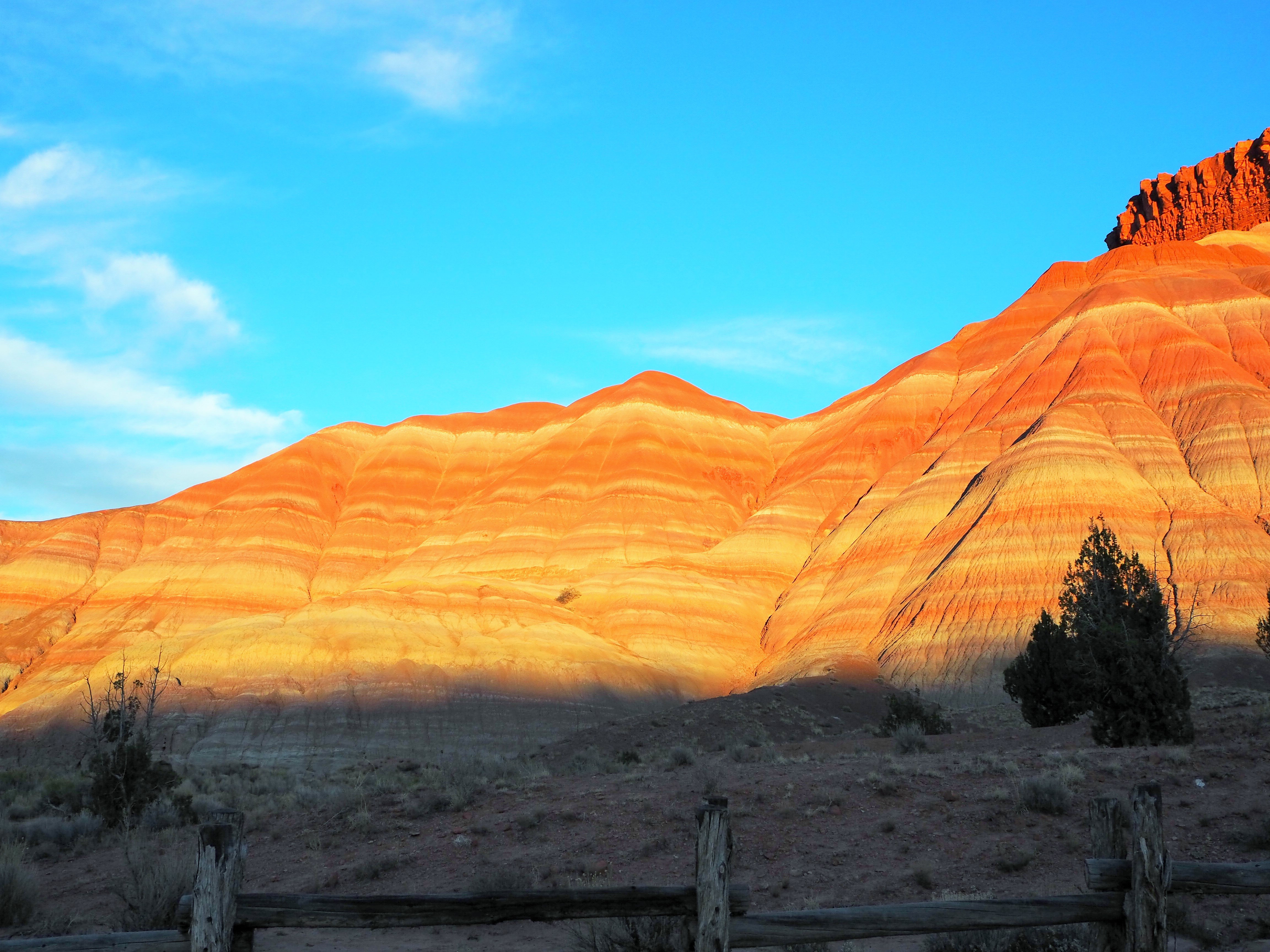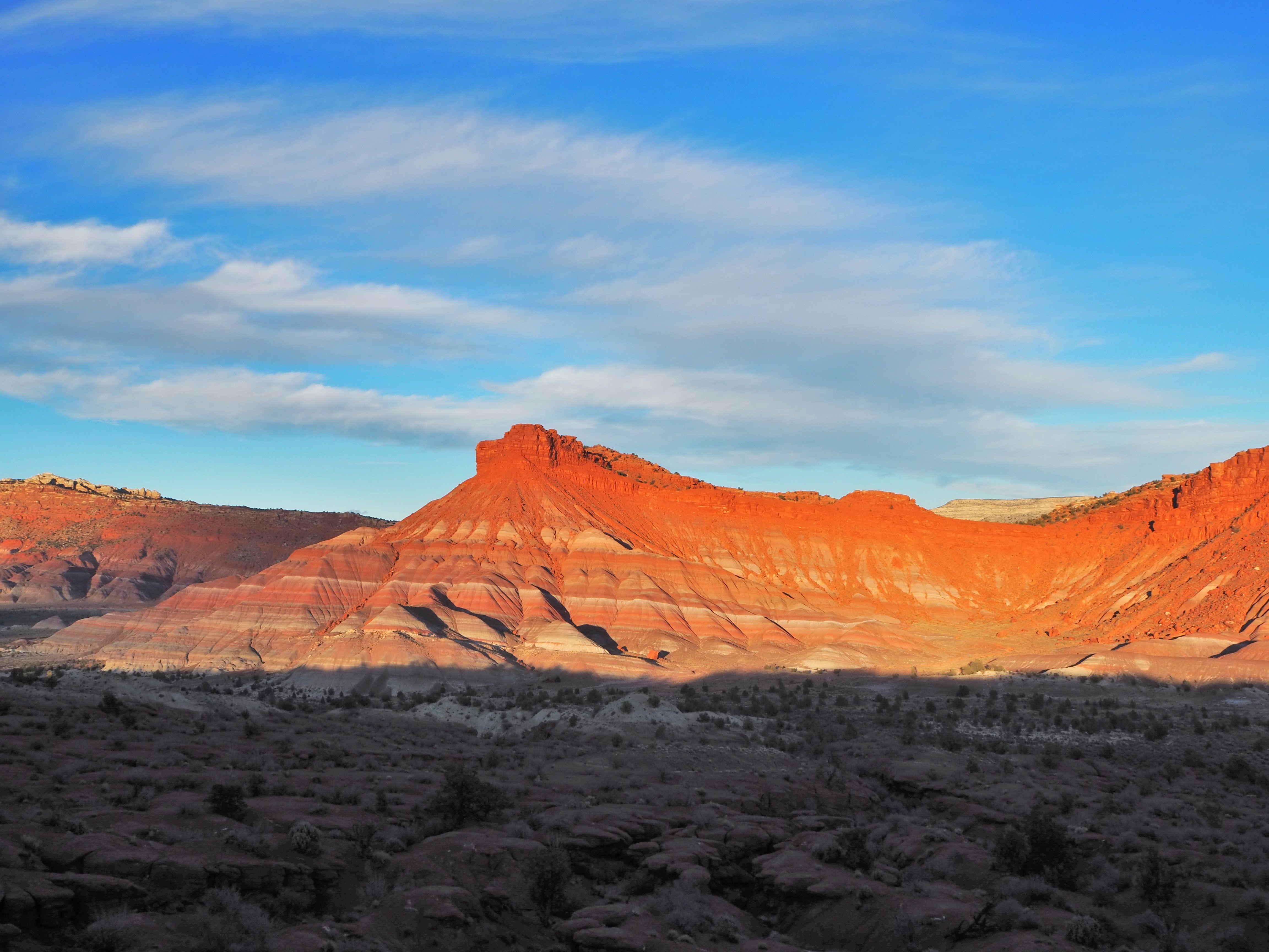 Brett took us on a detour on our way back and we skirted the southern end of South Coyote Buttes. Then we were back on House Rock Valley Rd. driving toward US 89. The Paria River Valley is most spectacular for the banded hills which line the river valley. Part of the Chinle Formation, the hills are brilliantly colored in green, purple, red, and white. The Pahreah ghost town barely exists while the movie set which used to attract tourists was burned by arsonists in 2006. It’s a stunning area, although we were there at the wrong time of day for any decent photographs.