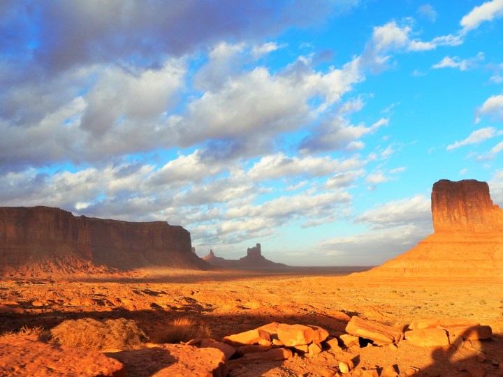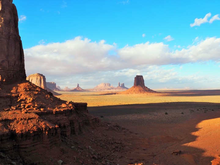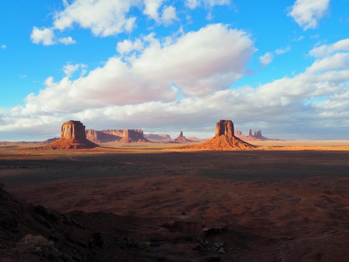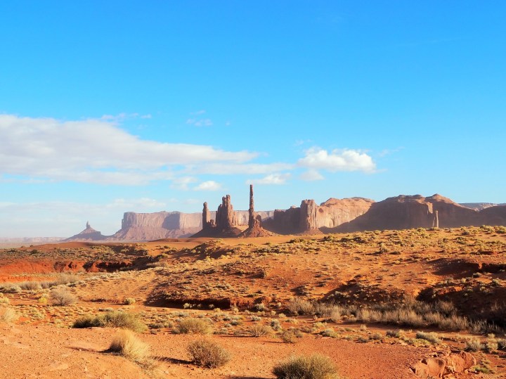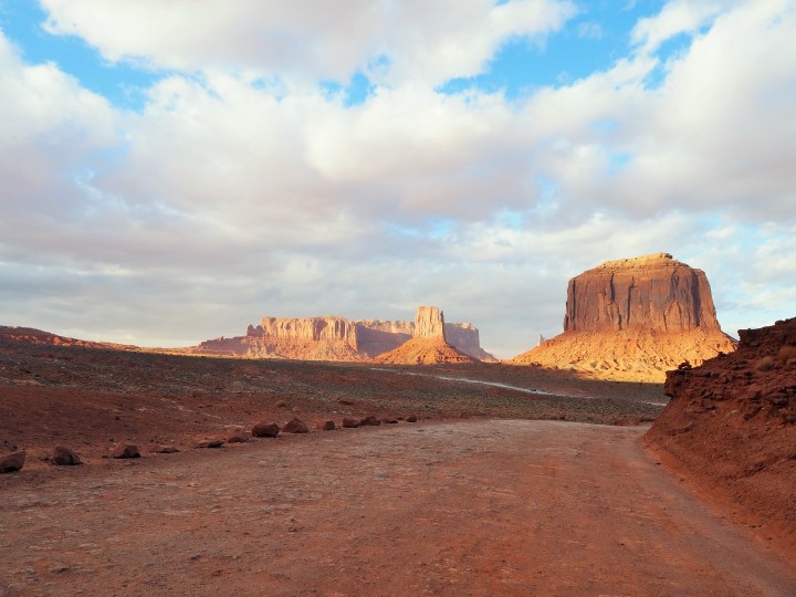 Since it was late afternoon we set off to do the scenic drive, a 17 mile loop on a packed dirt road which is quite rough in places. Fall is definitely the off-season, and although there were certainly tourists, it was easy to pull off whenever the road allowed. We bypassed the first stop – the Mitten Buttes and Merrick Butte – to get a slight edge on the jumble of cars entering the procession. We passed Elephant Butte, and the Three Sisters, then made the turn toward Rain God Mesa.