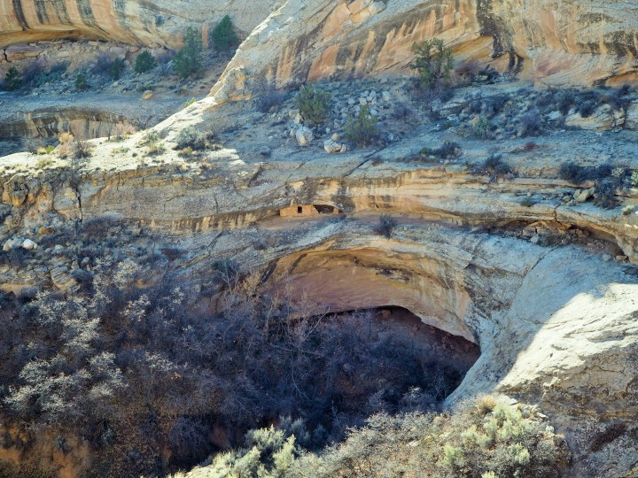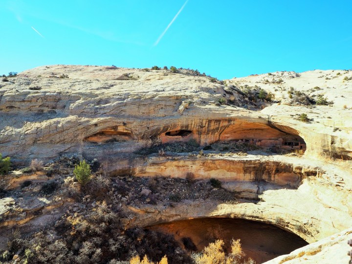 From the overlook, you have a view of several ruins tucked inside the cliffs. Used by the Anasazi, these ruins provide a full picture of their lifestyle with evidence of habitation, farming, hunting, and religious rituals. They were abandoned before 1300 AD and have sustained some destruction (whether natural or inflicted). The remaining walls have been reinforced to aid in their preservation.