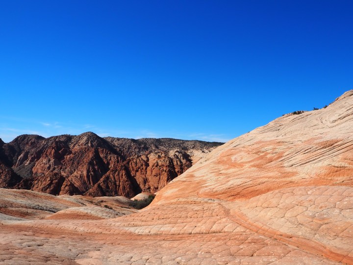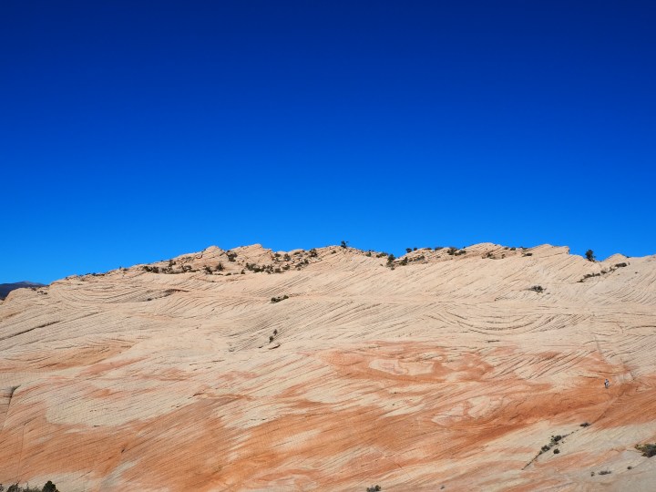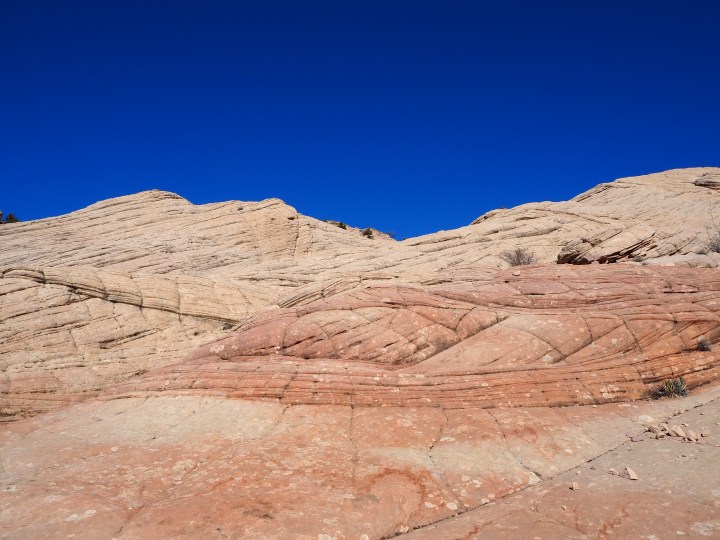 To our surprise and delight, much of the flat was composed of brain rock (!) like White Pocket. But here, the brain rock was arrayed in more hues, mostly pinks and oranges. Like White Pocket, Tru enjoyed exploring, bounding down the canyon we found to reach the expanse of the flat. He’s never a fan of resting and was dismayed when we decided to take a break to eat snacks.