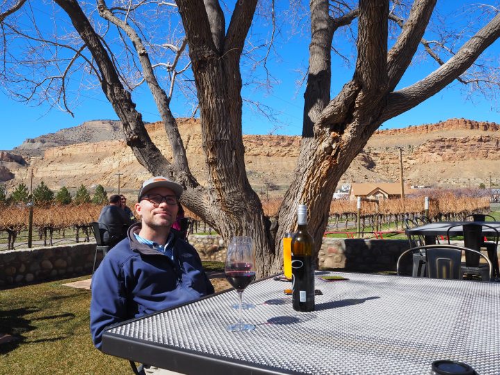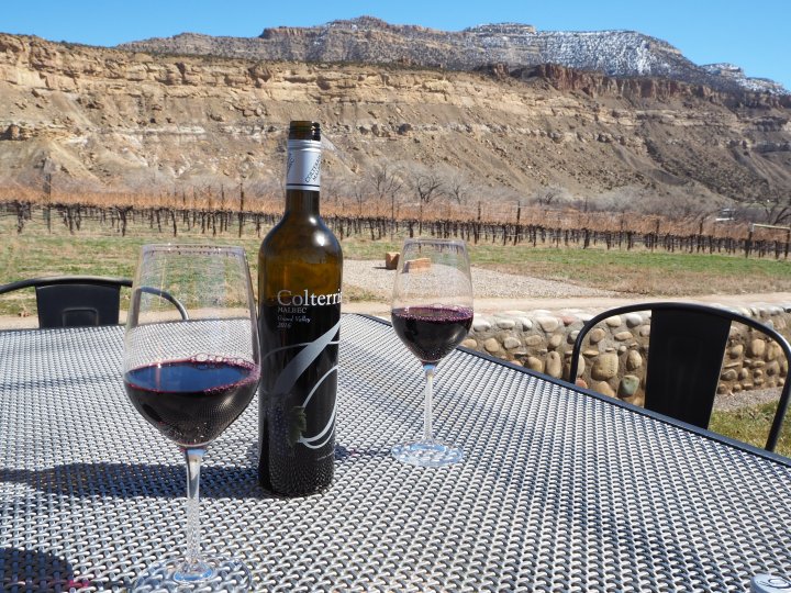 Initially we intended to visit a few wineries, but the first one was so wonderful that we ended up staying a while. Colterris is on the far eastern end of Palisade tucked into a bend of the Colorado River. I imagine when the vines are green and the lavender is blooming, their property makes a stunning contrast with the brown cliffs in the background. We did a tasting inside and then decided to buy a bottle to enjoy outside on their grassy lawn.