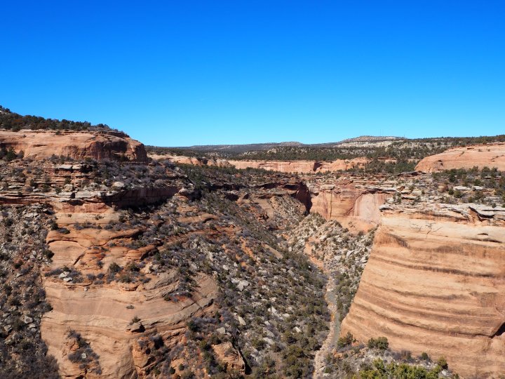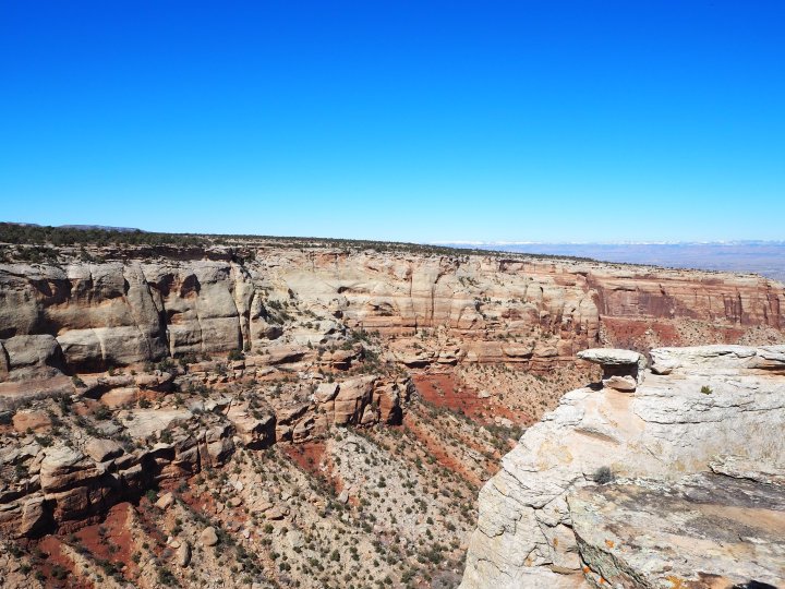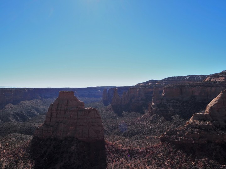 From Artists Point, the landscape shifted as we left the wide canyon floors of Monument Canyon behind and headed toward Ute Canyon and the eastern edges of the Monument. At Upper Ute Canyon Overlook we followed the path to a broad overlook of a more narrow canyon. Here again, we were alone which allowed us to play with the echo off the canyon walls a little more freely.