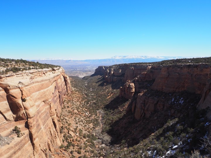 We intended to do the Serpents Trail at the end of our drive as our one hike, but as we approached it we decided we’d rather head on to Palisade. (The Serpents Trail was part of the Rim Rock Drive until 1950. It has 16 switchbacks!) So we made our descent down the nicely paved switchbacks of the (newer) main road and bid farewell to the Monument. Maybe we’ll meet again.