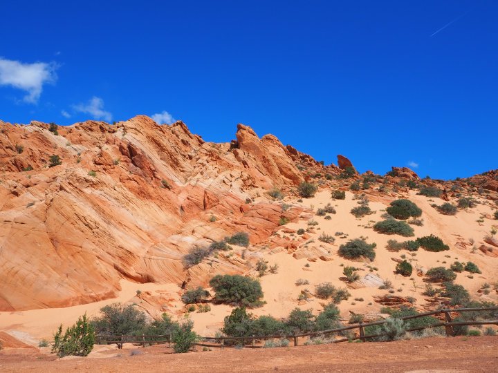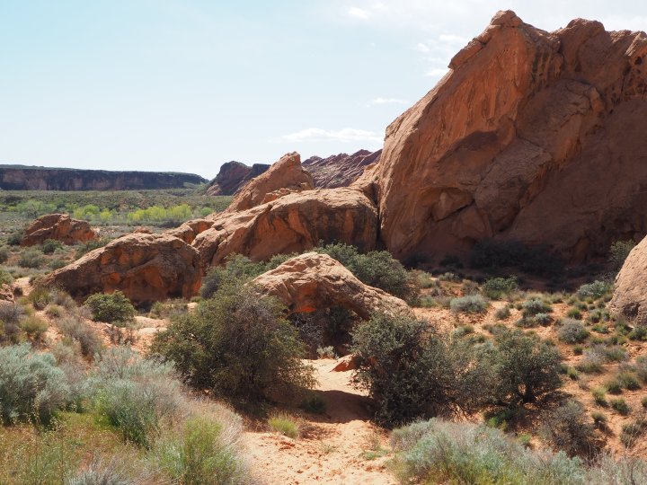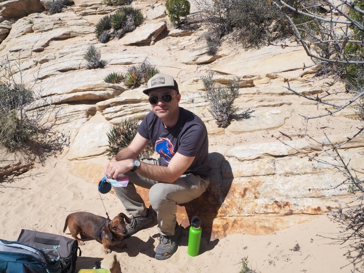 The trail was fully exposed and beginning at the farthest trailhead meant the small dogs tired more quickly. By the time we arrived at the second trailhead, Belle had already given in to the comfort of Lisa’s pack. We went down a steep sand bank and began to follow a cairned route through layers of sandstone. It was a steady descent – which was fun and easy – and we soon found ourselves at the crest of an incredibly steep hill of deep sand. It was steep enough that I decided to carry Tru. It was actually fun to descend; we simply let our feet sink and slide with each step.