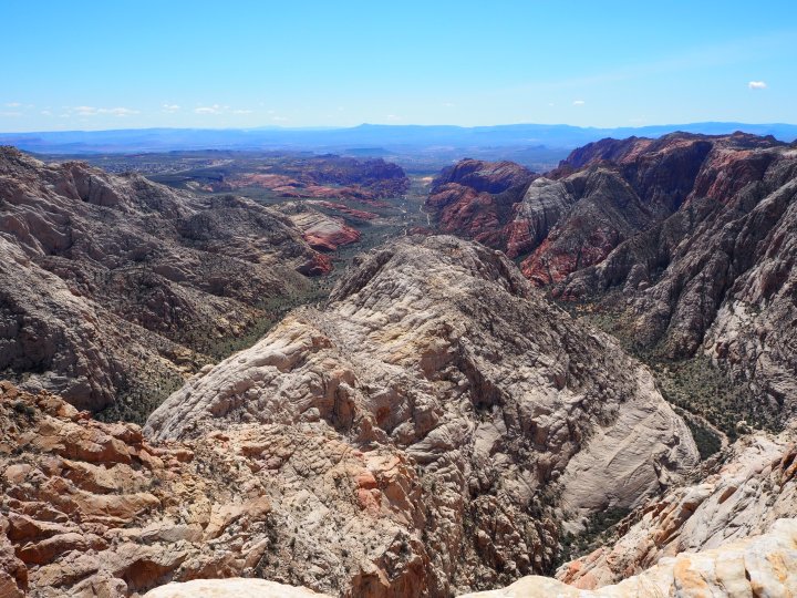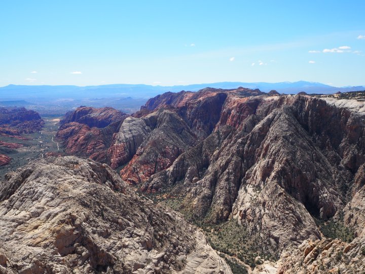 The sun was rather high in the early afternoon, so while our view was spectacular in person, there might be a better time of day to photograph the canyon. We could see clear to the city of St. George and beyond to Arizona. It was a stunning view and more than worth the slightly boring (but enjoyable!) hike. We sat for a while and ate our snacks, explored other angles, and then turned back toward the trailhead.
