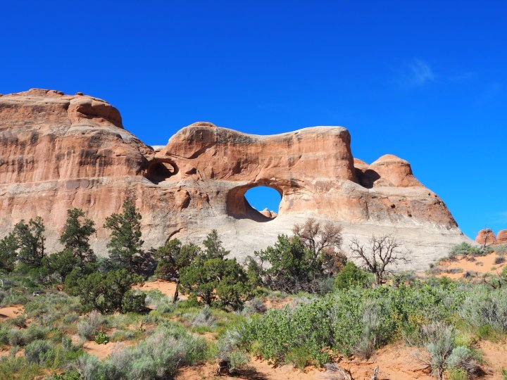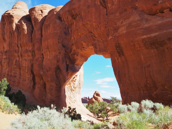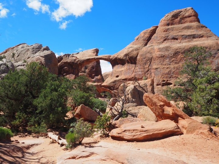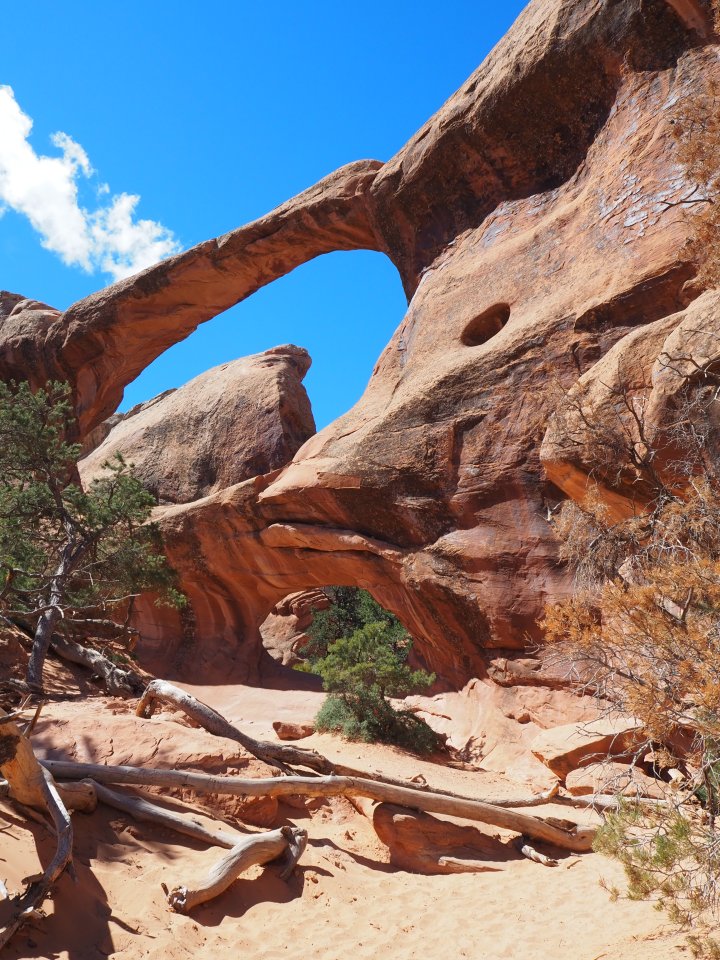 The trail to the first three arches is a nice gravel path. We took the spur trails to both Tunnel and Pine Tree Arches first. Tunnel Arch was a sweet rounded arch with a smaller unnamed arch to the left. A short distance away, Pine Tree Arch looked like a giant cut-out, particularly with the morning sun shining brightly behind it.