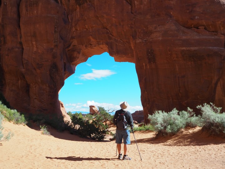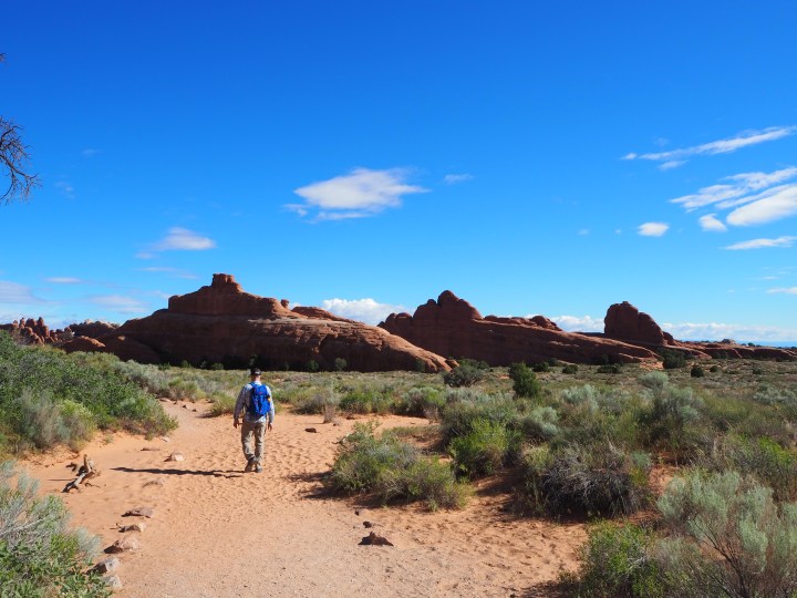 We arrived at the trailhead before 9am and had no problem finding a parking spot. I never expected solitude on this trail, but I knew it would only get more crowded as the day wore on. Most people only complete the first 0.8 miles to Landscape Arch, some of those people make detours to Pine Tree and Tunnel Arch too. Fewer people go beyond Landscape Arch, and even fewer complete the loop via the Primitive Trail. I wanted to do the whole thing. I may not have adequately prepared my dad or Mark for how much scrambling we’d be doing, but they ended up being great sports.