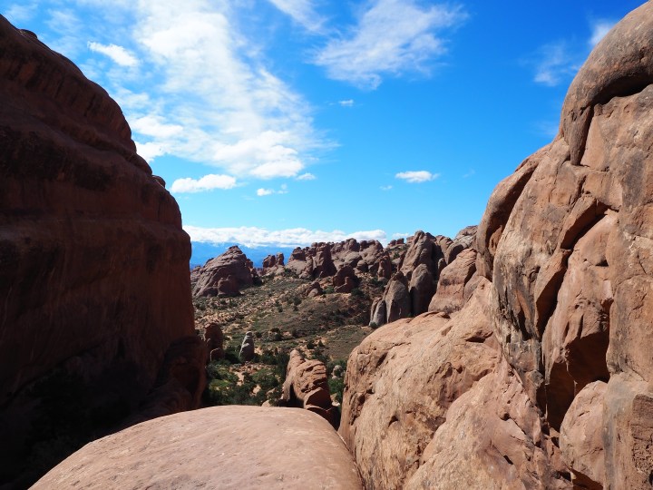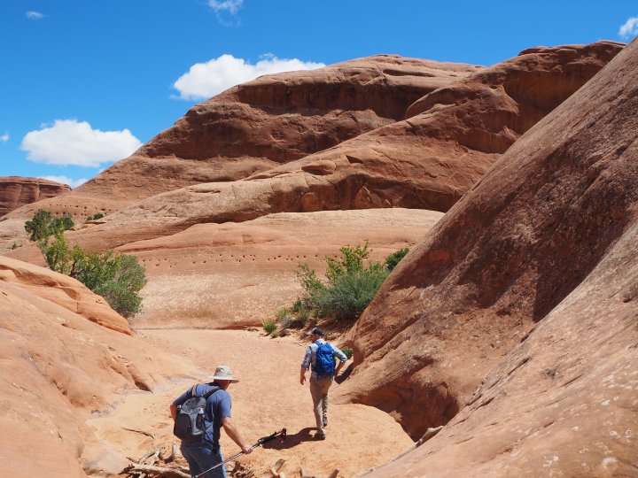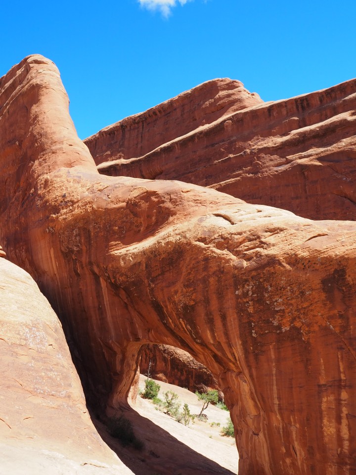 We timed it well and had the arch to ourselves. Then it was time to break from the maintained trail and start the scramble up and over slickrock fins on our way to Double O Arch.