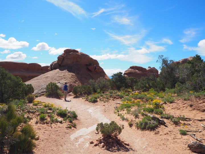 Since Zach and I visited Moab a month before, we didn’t have much of an agenda for this trip. We were there to hang out and tag along with my parents and their friends. However, I did have one trail I hoped to hike, a trail that has been on my Moab bucket list for the last three years: Devils Garden. The longest hike in Arches National Park at 7 miles, Devils Garden is located at the far northern end of the park and visits SEVEN arches with an overlook for an eighth. The trail was closed the last time we visited the park in 2017, and on our more recent trips to Moab we’ve stayed out of the National Parks entirely to hike with Truman.