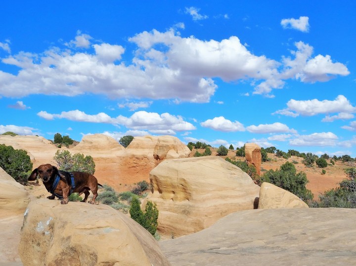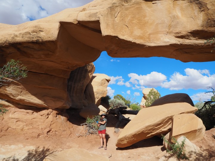 A collection of mushroom-capped hoodoos and stumpy pillars, Devils Garden really is like a playground. There’s no need to stick to the path. We climbed on top of some formations, ducked in and out of others, and avoided a large group of kids and parents playing tag. (Truman was not a fan of the running children.)