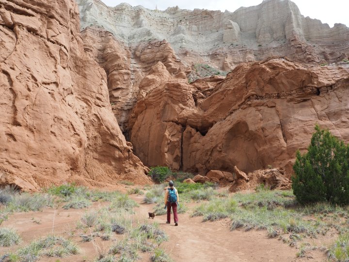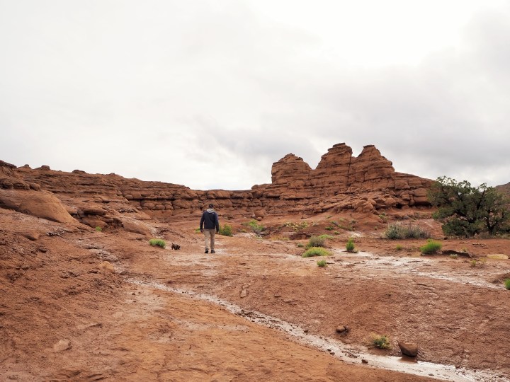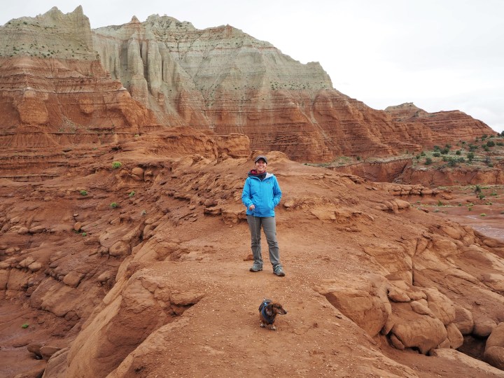 We visited Kodachrome Basin SP two years ago on Memorial Day weekend. On that trip we hiked the Panorama Trail – the longest trail in the park – so on this trip I wanted to hike the park’s other, shorter trails. To lift our (my) spirits after the rain stopped, I chose the Angel’s Palace Trail, a short 1.5 mile loop which offered panoramic views of the park and its setting. We were all eager to set off after a sedentary day, especially Truman.