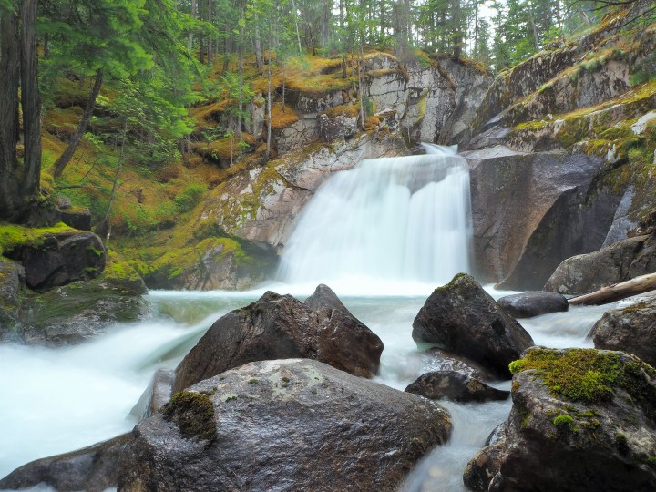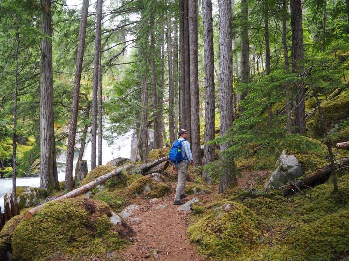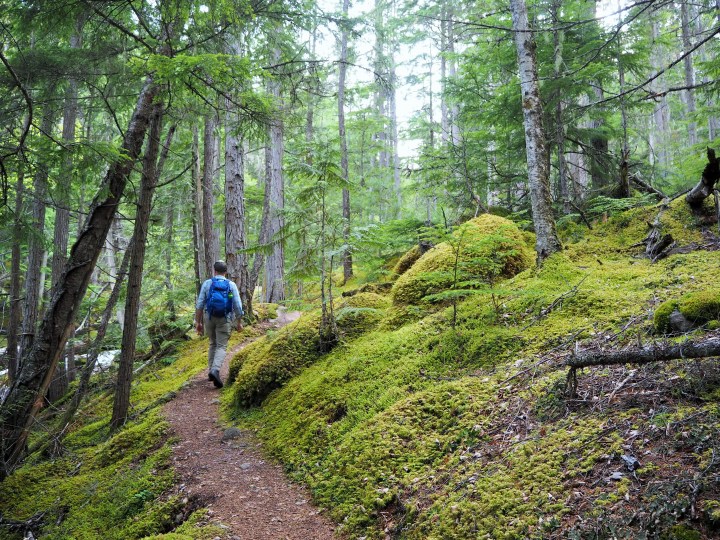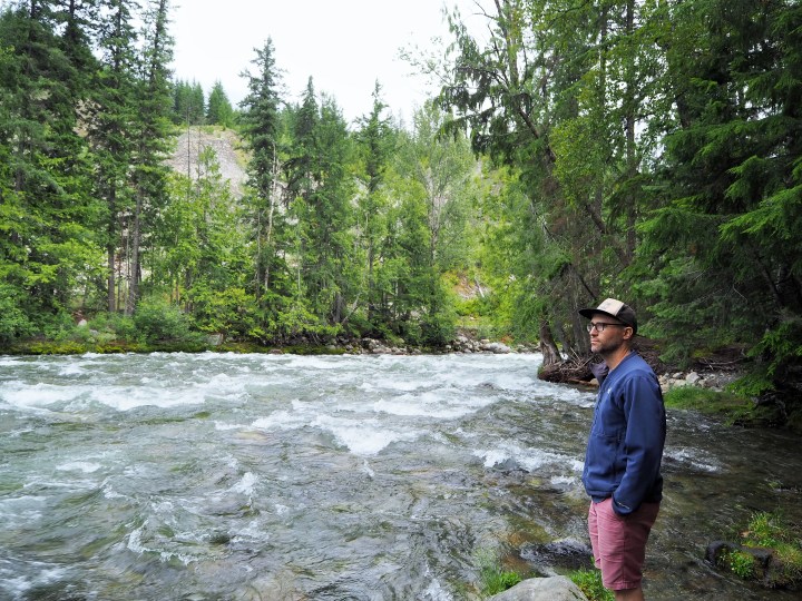 We enjoyed an evening without rain – though the temperatures were much cooler than usual – and awoke to a dry but cloudy morning. For our morning hike we decided to do one of our host’s recommendations, Wilson Creek Falls, instead of Idaho Peak. Located 12 km up a forest service road, the hike began outside the boundary of Goat Range Provincial Park but crossed it along the way. With Halfway Hot Springs fresh in my mind, I was slightly worried about encountering another downed tree, but it was a smooth trip to the trailhead. When we pulled into the small parking area, I was surprised to see that we were all alone! I thought it would be a popular hike given its relative ease and proximity to the campground. As with any hike in grizzly country, I’m always more nervous on an empty trail – it’s an irrational fear. Armed with our bear spray, we set off down the trail.