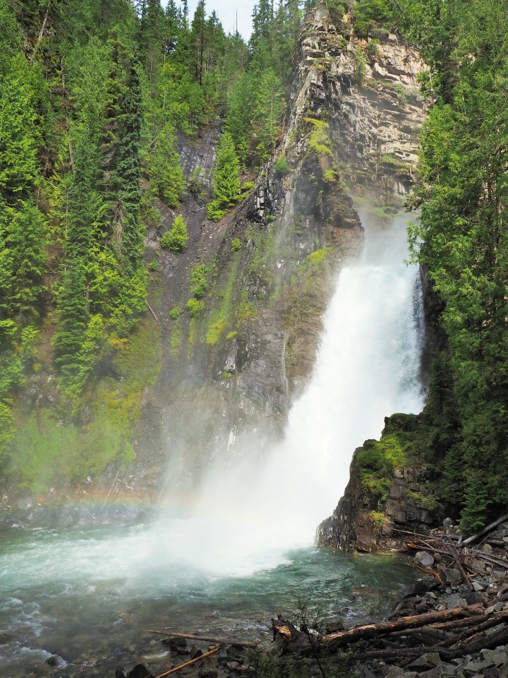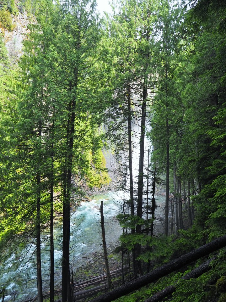 As we neared the falls, the roar became deafening. Bathed in the spray from the falls, everything was intensely green and coated in moss. When we reached the trail’s end, we stood entranced by the force of the water. Several people told us this was the best waterfall in BC, and while we can’t attest to that, it’s defintely impressive. We could tell that there was another drop just above, shooting the water into the canyon wall where it was then compelled to drop over 200 ft. into Wilson Creek. I don’t know how long we stood there, but it was incredible to have it all to ourselves.