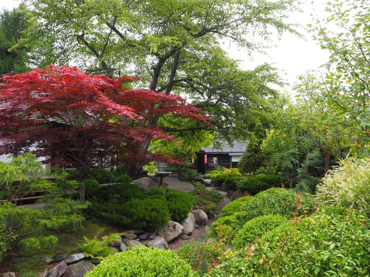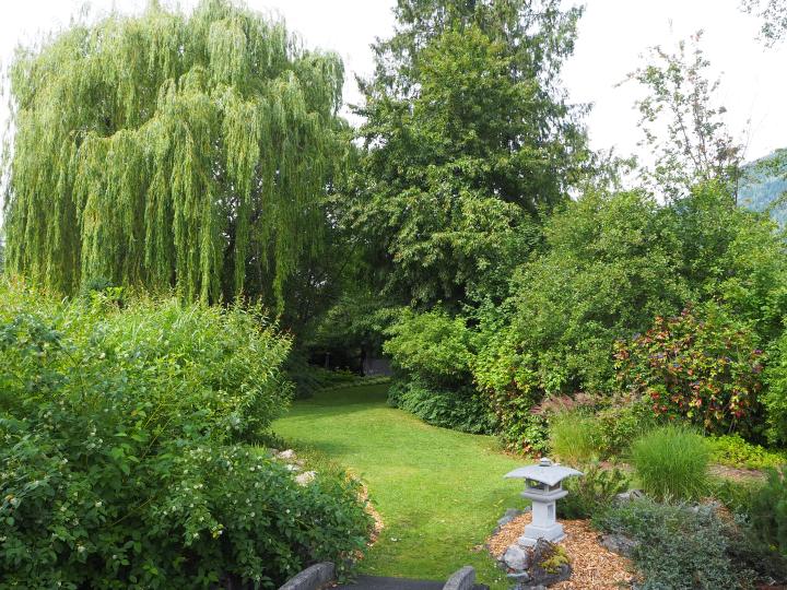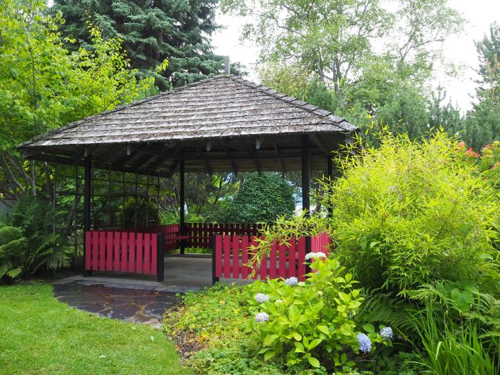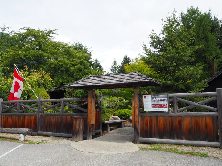 After leaving th Centre, we drove a few blocks to the city park where there was another memorial, the Kohan Reflection Garden. Kohan means “by the water” and the garden was beautifully situated on the lakeshore with a ceremonial tea house at its center. Looking out at the lake, we could see the rain shower which had recently passed over us in the distance. It looked mostly clear otherwise, so we decided to proceed with our afternoon plan to kayak on Slocan Lake.