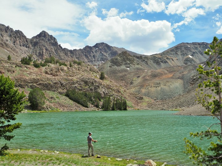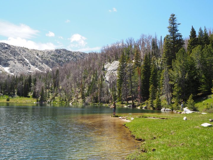 Safely parked at the trailhead, we ascended the short but steep trail to the lake. The trail traversed a large scree field – not Tru’s favorite walking surface – and led us past an abandoned mine. 0.3 miles later we were at Green Lake, admiring its picturesque setting in the basin of several jagged peaks. However, our elevation also meant the cool front blowing in was not blocked. It was blowing quite furiously at the lake, and fishing was difficult for the guys. There were five other people fishing when we arrived, and they had all stationed themselves on the opposite side of the lake in an attempt to shield themselves from the wind. Lisa and I didn’t have a great place to set up our hammocks, so instead Lisa spread a blanket at the base of a log, and we used it as a backrest. The wind made it much cooler than the day before, and the incoming clouds often blocked the sun’s warmth for minutes at a time. In the end, we didn’t stay terribly long. It was such a gorgeous lake, we were all happy to have made the trip regardless.