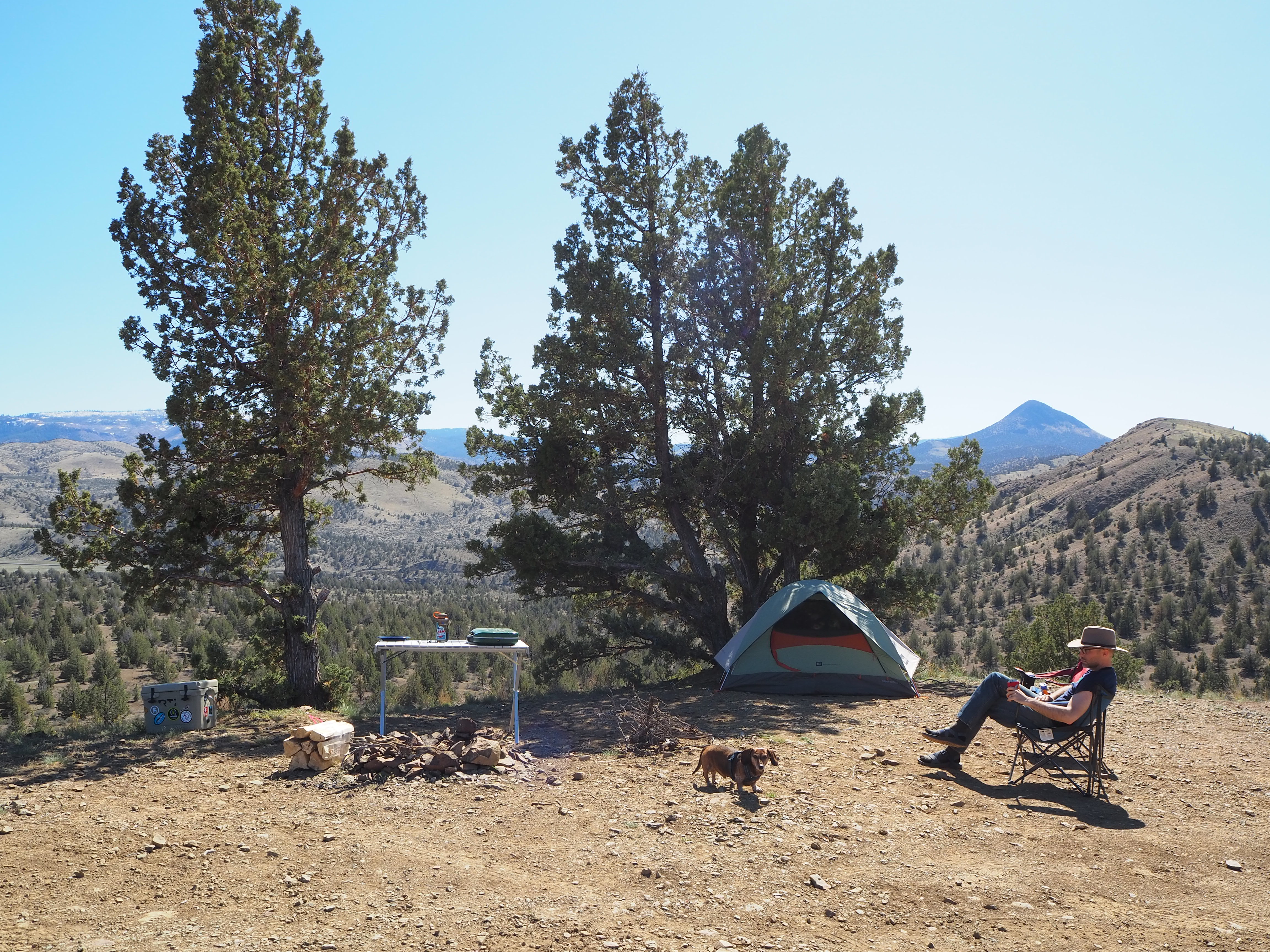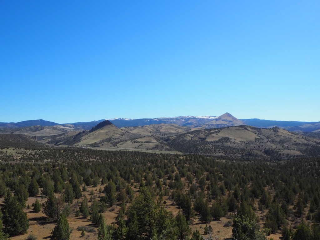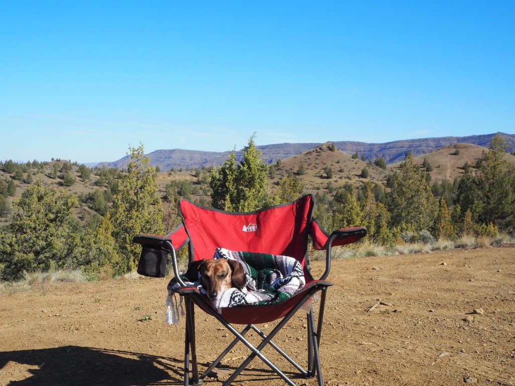Last weekend we took our first camping trip of the year. Zach’s spring break was pushed into April this year, and the weather has been beautiful lately, and although we should be concerned about the lack of rain, it’s difficult to care as spring brings longer evenings and more opportunities to be outside. It’s still too early for mountain getaways, so we opted for a high desert escape to central Oregon, our first real foray into the state (other than Portland). The object of our trip was exploring the John Day Fossil Beds National Monument (a real mouthful of a name!). The Monument is divided into three units which are varying distances from one another. I thought we should make our camp near the Painted Hills, the most popular unit, allowing us to visit on Friday evening when it might be less visited. Although Ochoco National Forest is nearby, it’s a bit early to camp among the trees and melting snow. Instead, we looked for areas where we could disperse camp on BLM land allowing us to stay away from other weekenders. We were fortunate to find that our first spot was available and suitable. Sitting up on a bluff, overlooking Route 26 west of Mitchell and into the Ochoco National Forest beyond, we could place our tent and table in the shade cast by a large juniper and enjoy the spring sun.