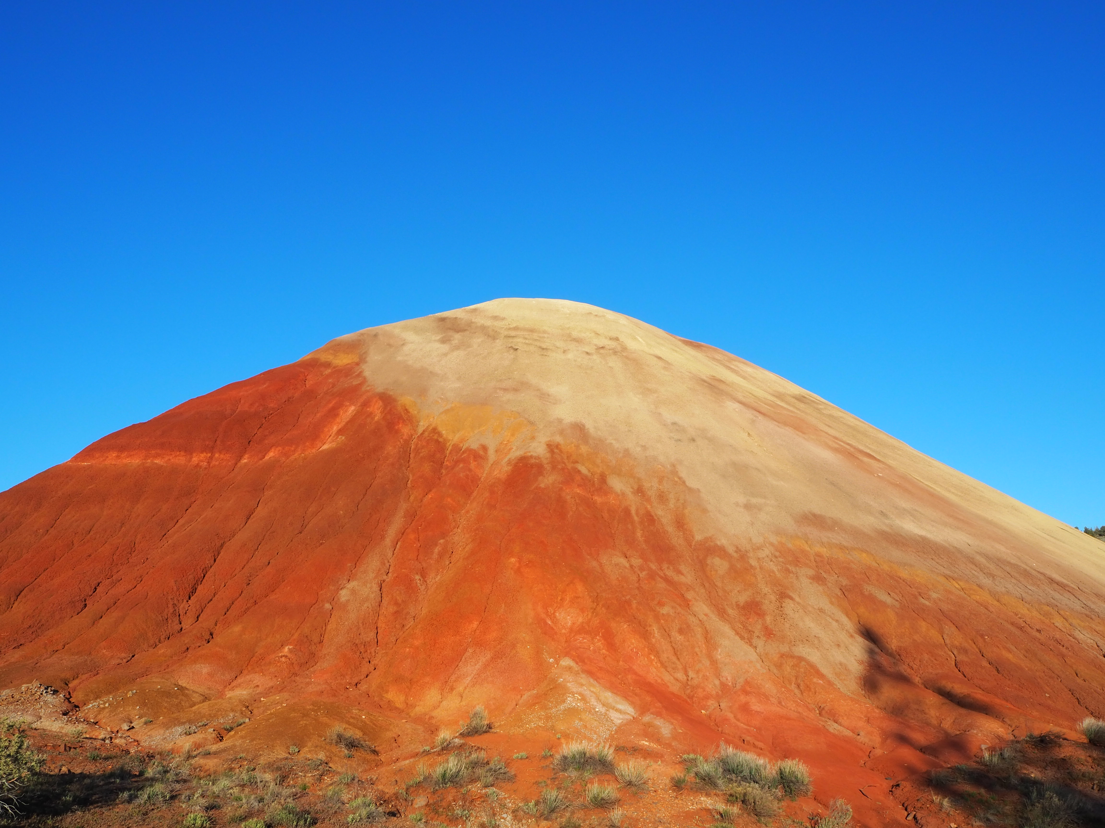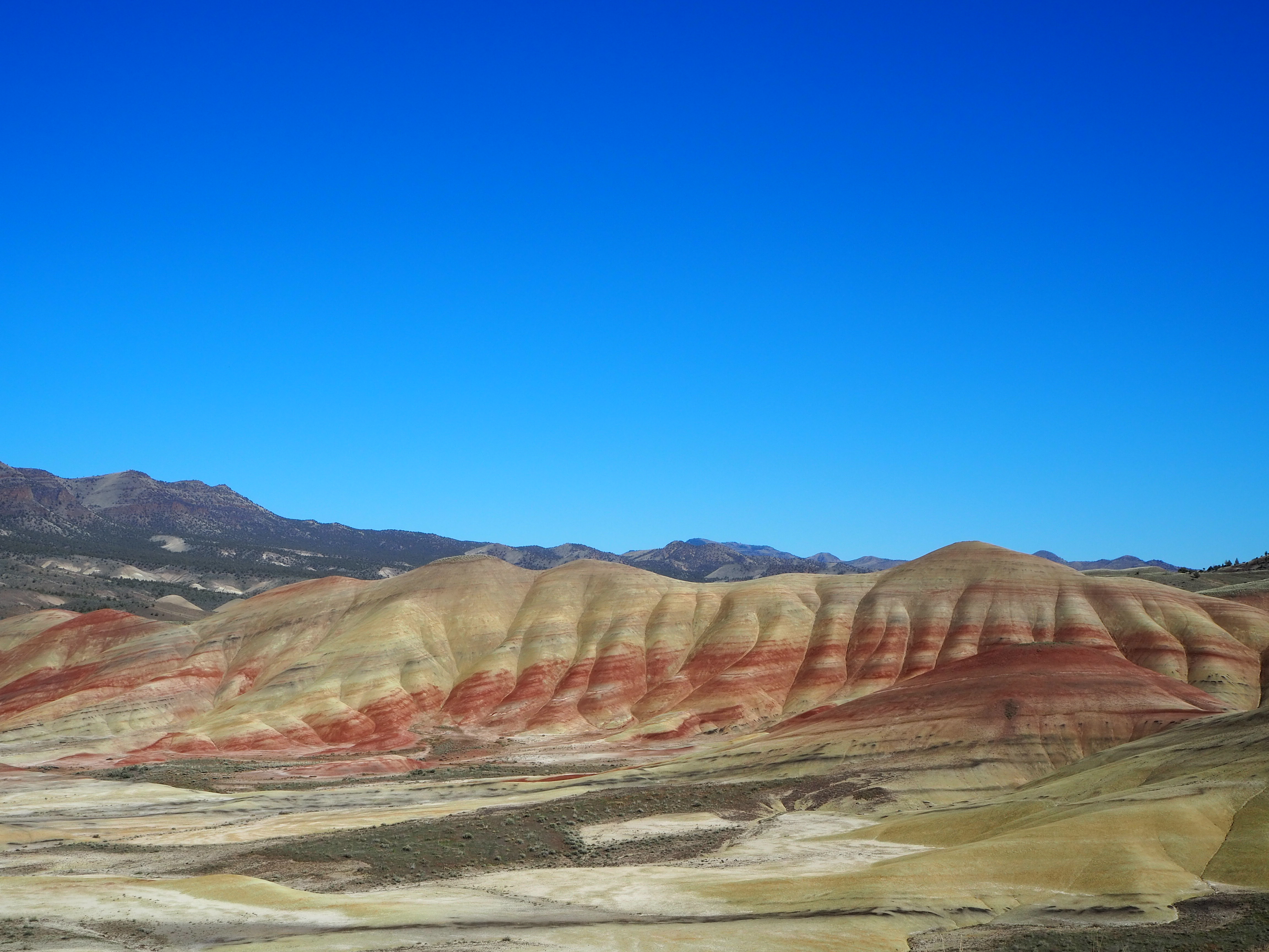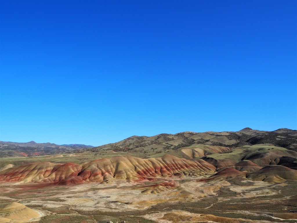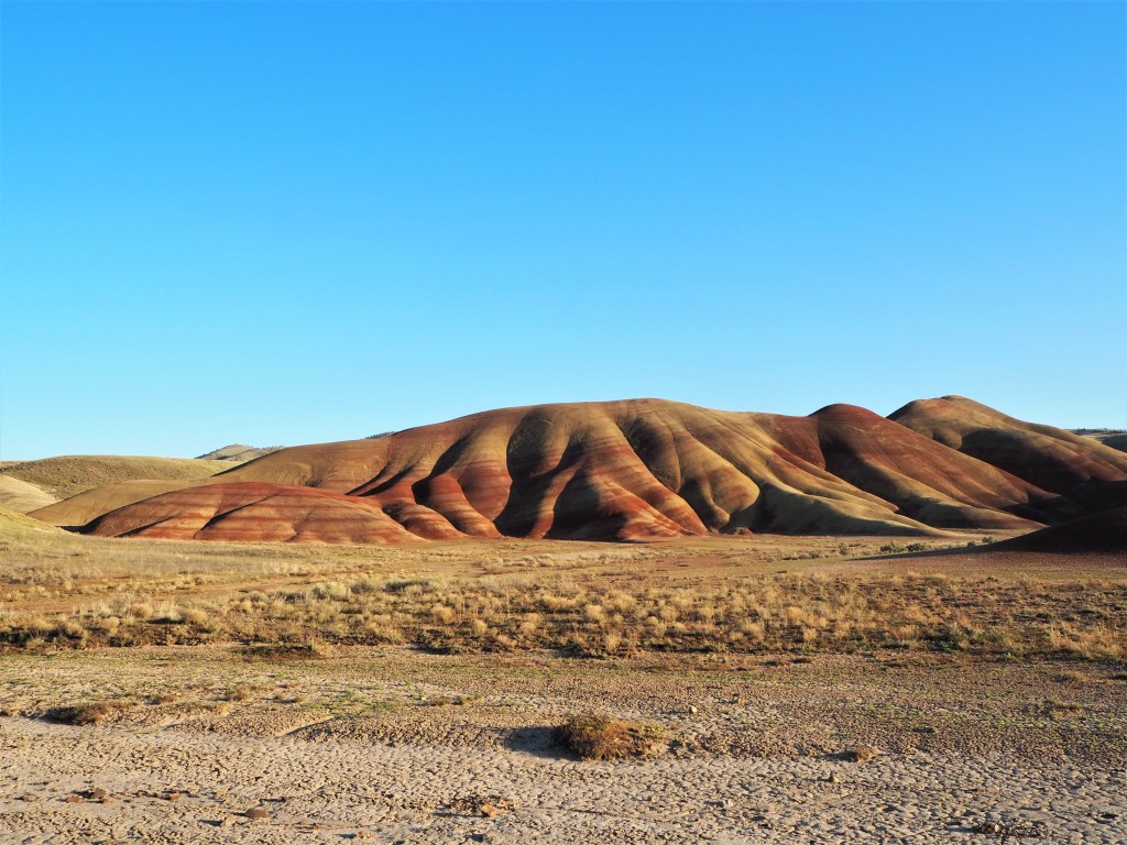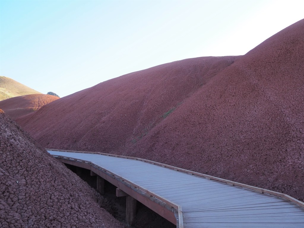 After we set up camp and made lunch, we began the brief drive to the Painted Hills. The unit is small, but has five sights of interest with accompanying trails. (Only one of the trails is of any length, the others remain at or below 0.5 mile.) It was late afternoon when we arrived at the first sight, the overlook of the Painted Hills. Lucky for us it also happened to be the best time of day for sunlight on the hills. Though there were several cars parked at the overlook, the trail to the viewpoint was nearly empty of people and we managed to have it to ourselves. The color of the hills are a large-scale representation of Earth’s changing climates. Each band of color highlights that period’s environment with red being a wet, swampy landscape and yellow/tan indicating a drying out. There have also been significant leaf fossil discoveries near the Painted HIlls, including the fossils of a Dawn Redwood, a tree that is only found in China today. Zach made a crack about how we’ll all be condensed into a band of color one day, so you could certainly get existential on your visit, but aesthetically the Painted Hills are very pleasing too.