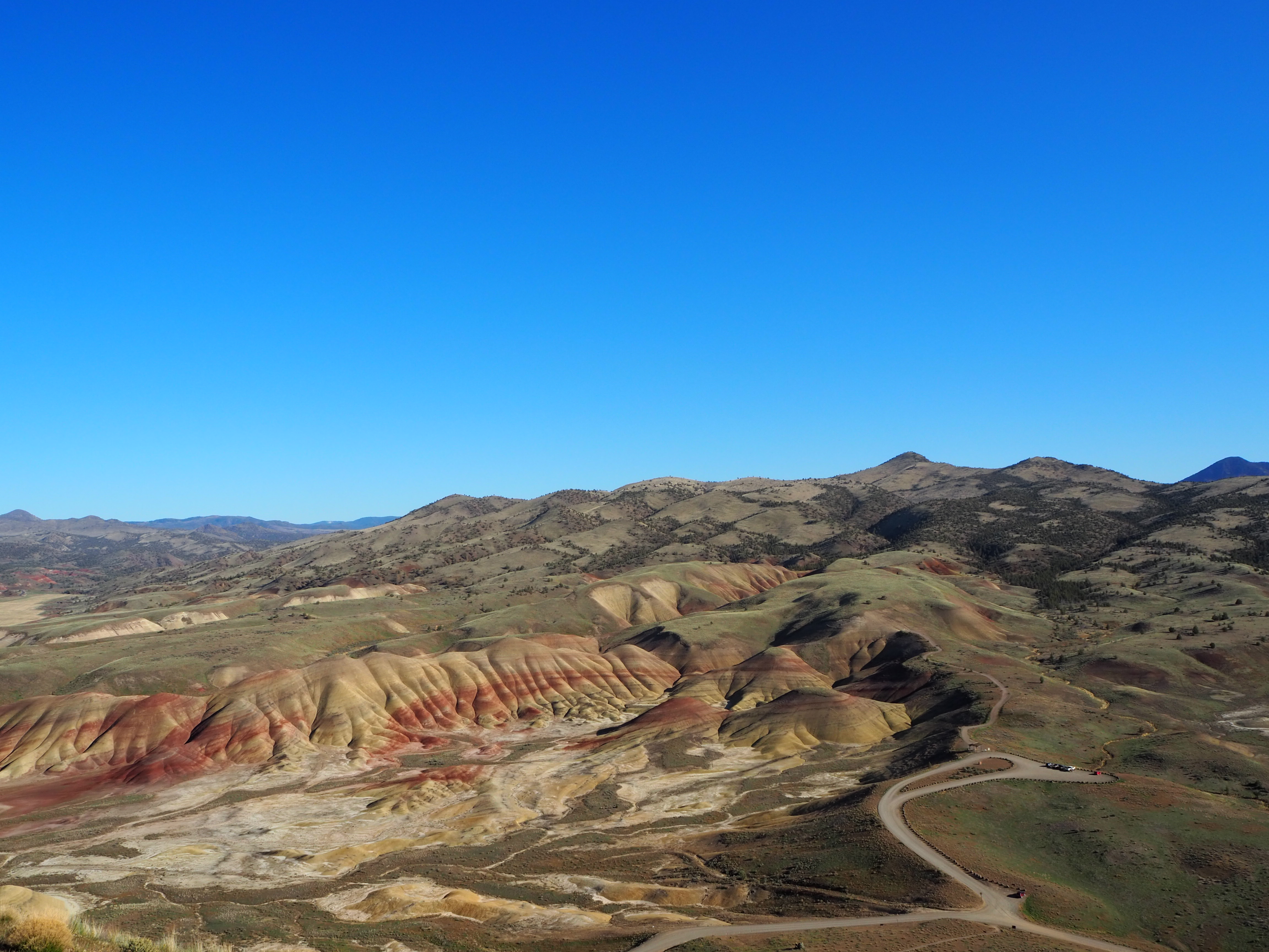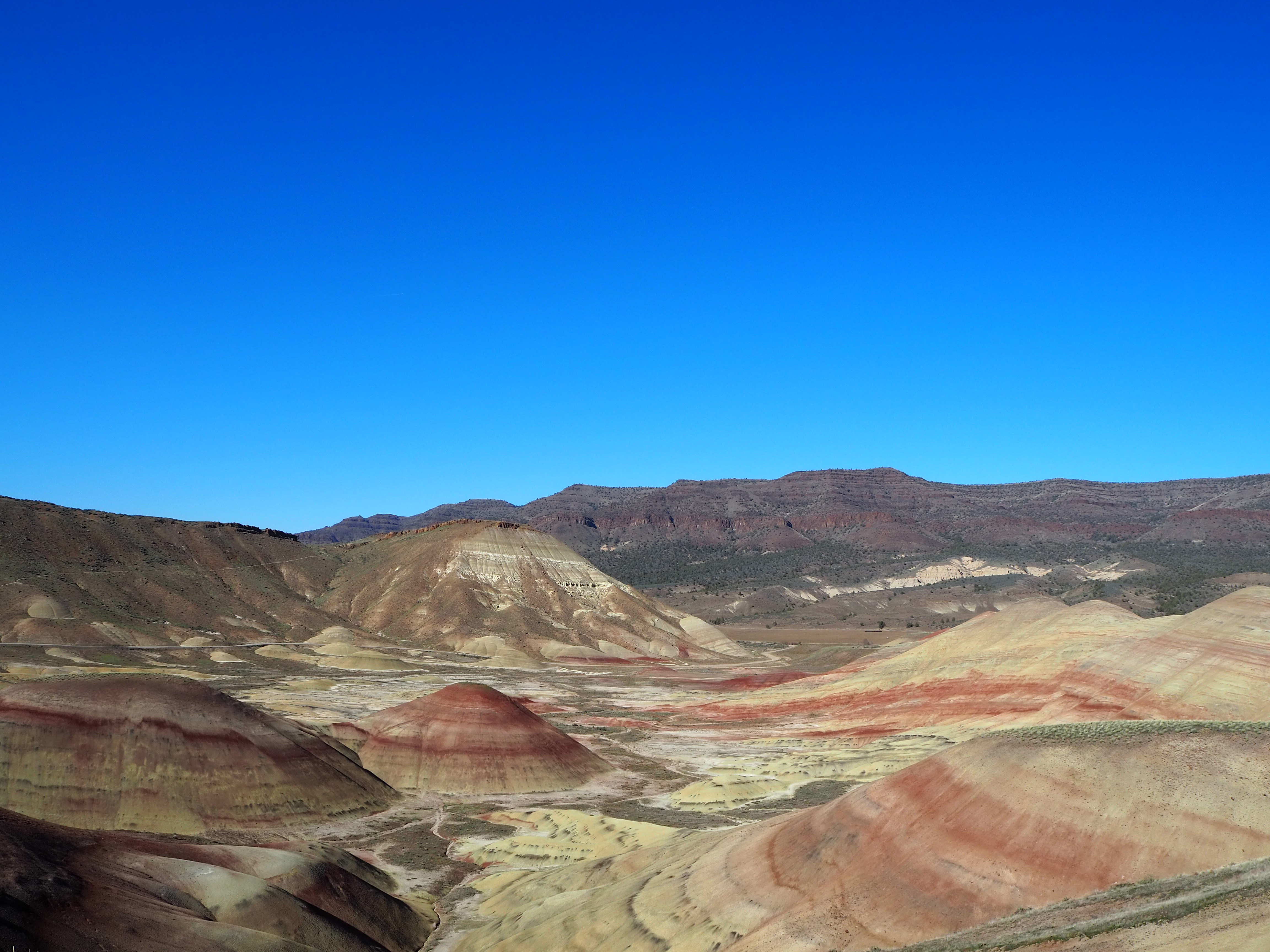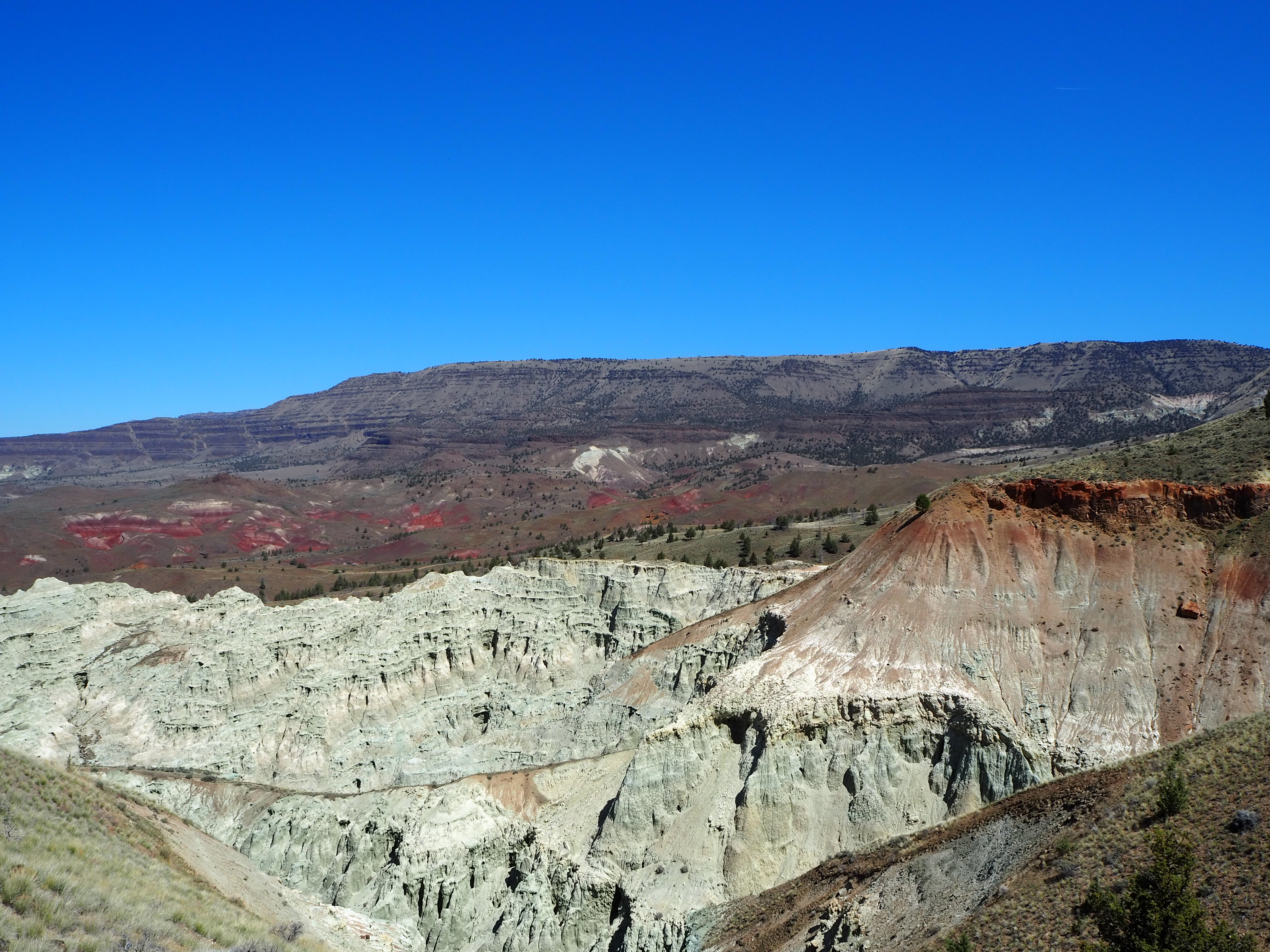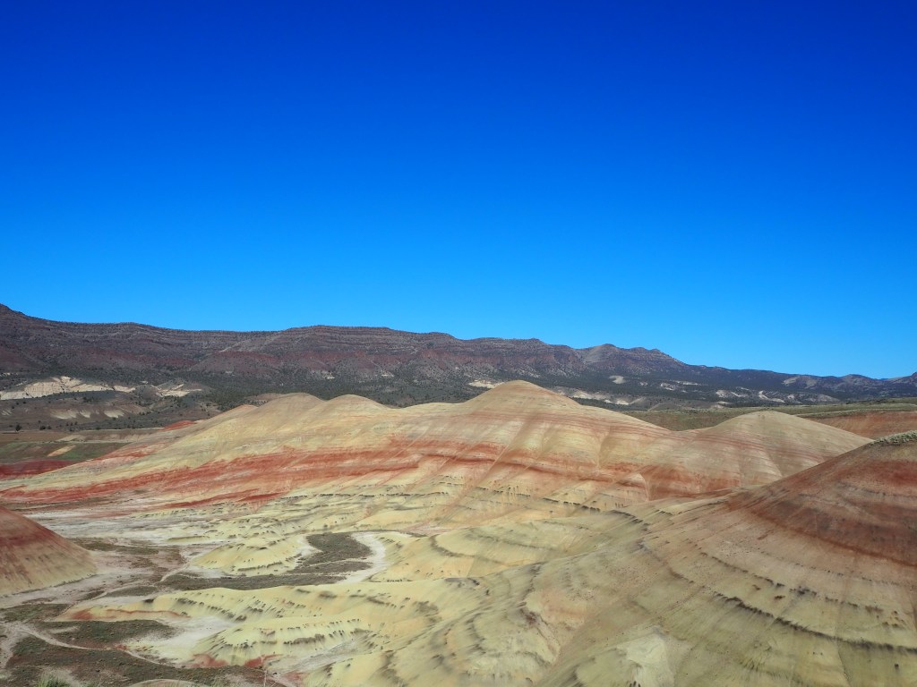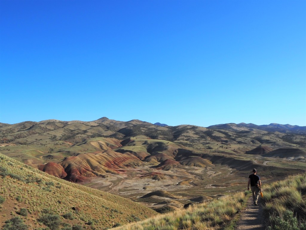 I figured we would do all of the trails in the unit since most were so short. After our walk up to the overlook, we decided to hike the Carroll Rim trail on the opposite side (and the only trail with any real length at 1.6 miles) to obtain a different perspective and burn some calories after the car ride. Very few of the visitors seem to do the hike, and we had it very nearly to ourselves with the exception of two hikers we encountered on our return. The trail climbs steadily up the ridge and then circles around the backside, leading to the top and providing a nice overview of the Painted Hills and the surroundings. The unit is encompassed by ranch lands swathed with cattle and even a small reservoir on private property. After Carroll Rim, we stopped at the remaining three paths, all 0.25 mile in length, and aside from what we termed the ” ‘gram spot,” we were the only visitors.