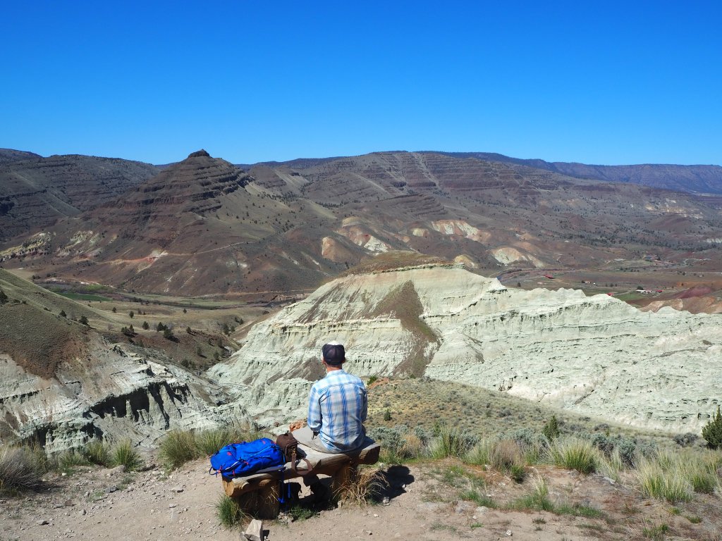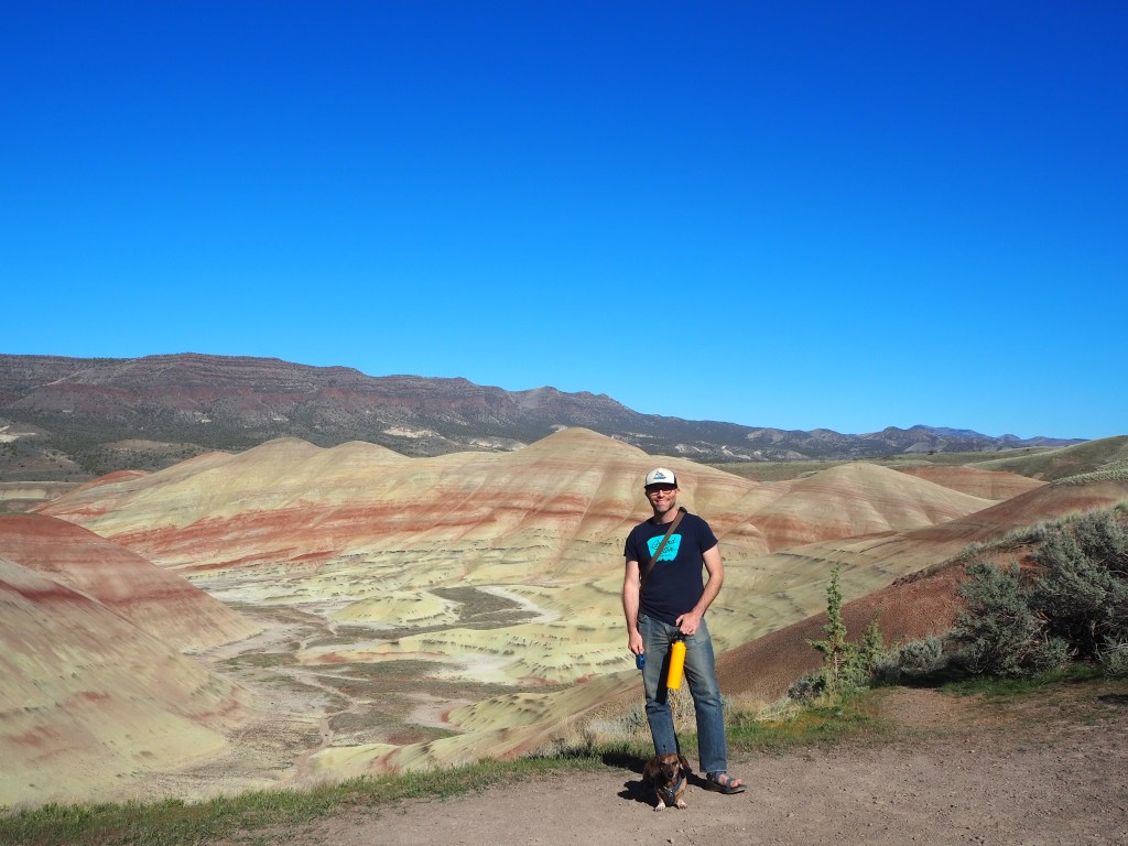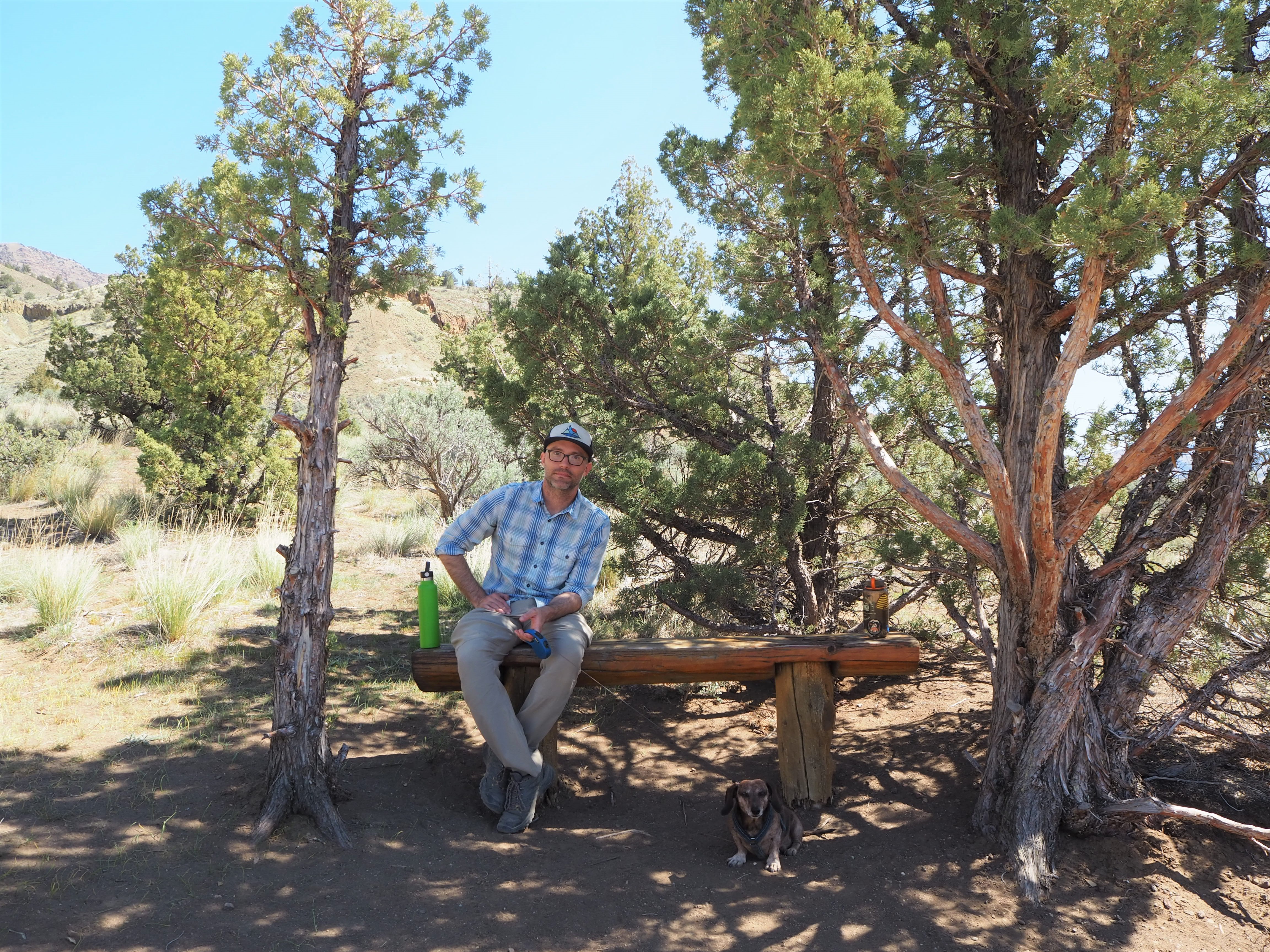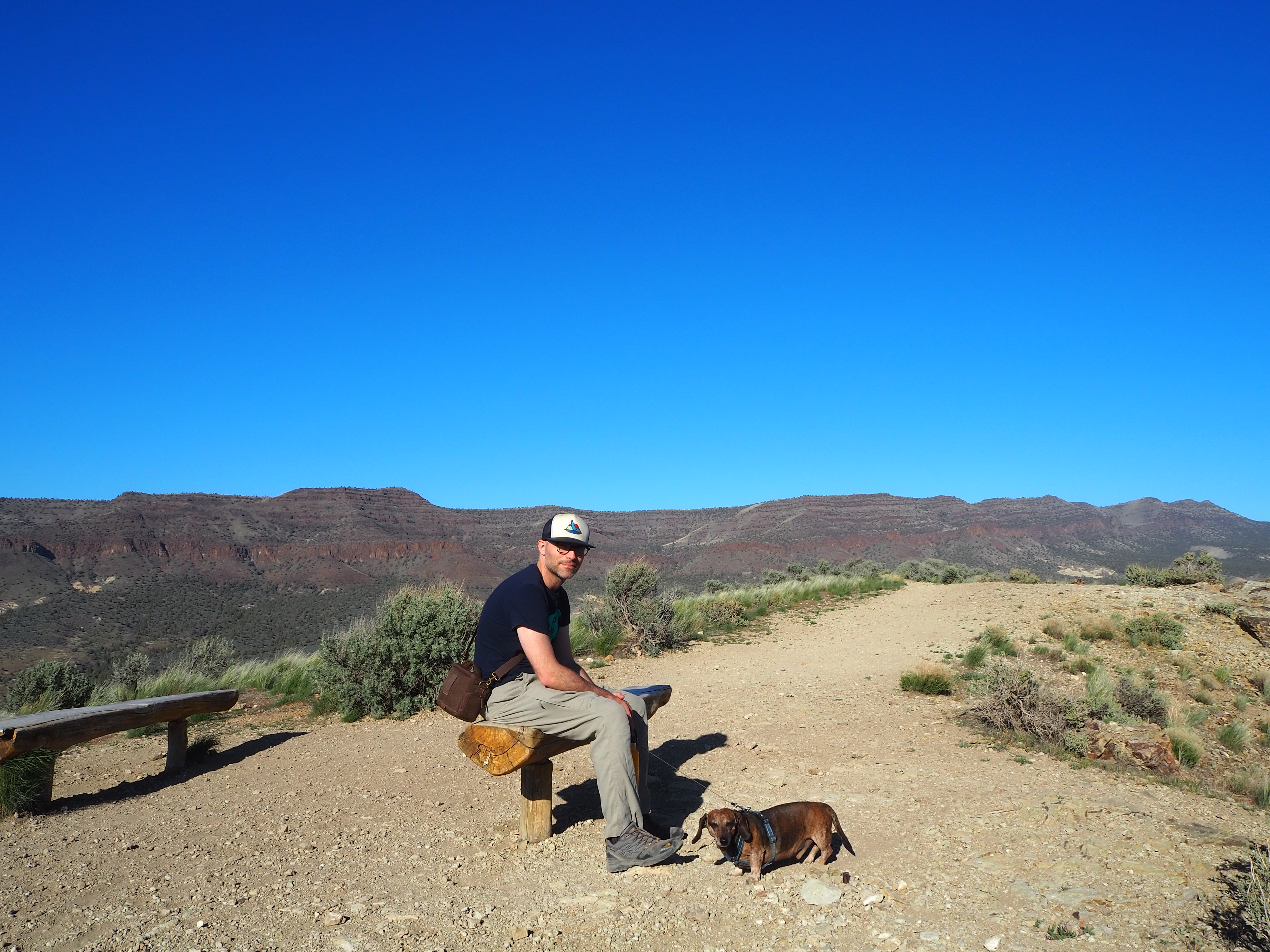 Hot and tired after our Blue Basin hike, we drove to the final piece of the Sheep Rock Unit, the Foree Trailhead. There were far fewer people there, only a couple of cars, so we were able to snag one of the well-shaded picnic tables for our lunch. Set back from the parking lot, it was nicely sequestered from anyone who arrived to hike. We enjoyed the solitude and the chance to cool off, as the temperatures reached toward the low 80s. The two trails here were brief (under 0.5 mile), and since one led to a view of blue-green claystones similar to Blue Basin, we chose to do Flood of Fire for a post-lunch walk. Tru, we quickly learned, was exhausted and uninterested in doing much more hiking. We carried him a bit to speed things along. It was a simple walk to a pretty overlook of the John Day River Valley and some colorful rock formations with a bench flanked by junipers. We surveyed the view and then turned back before the next flurry of hikers arrived.
