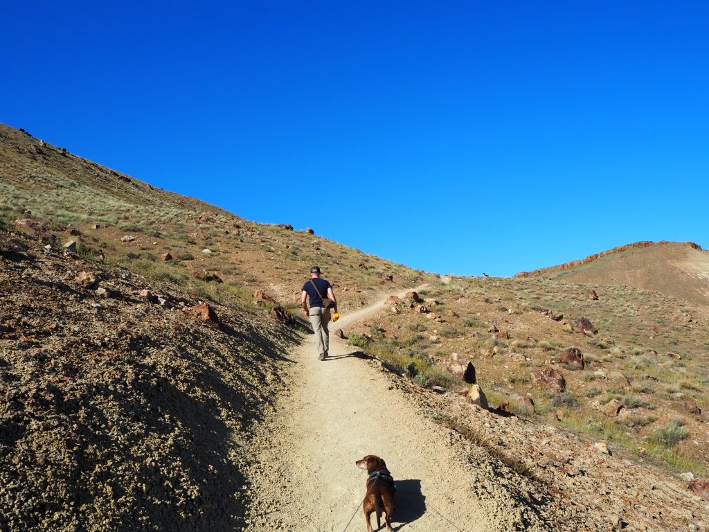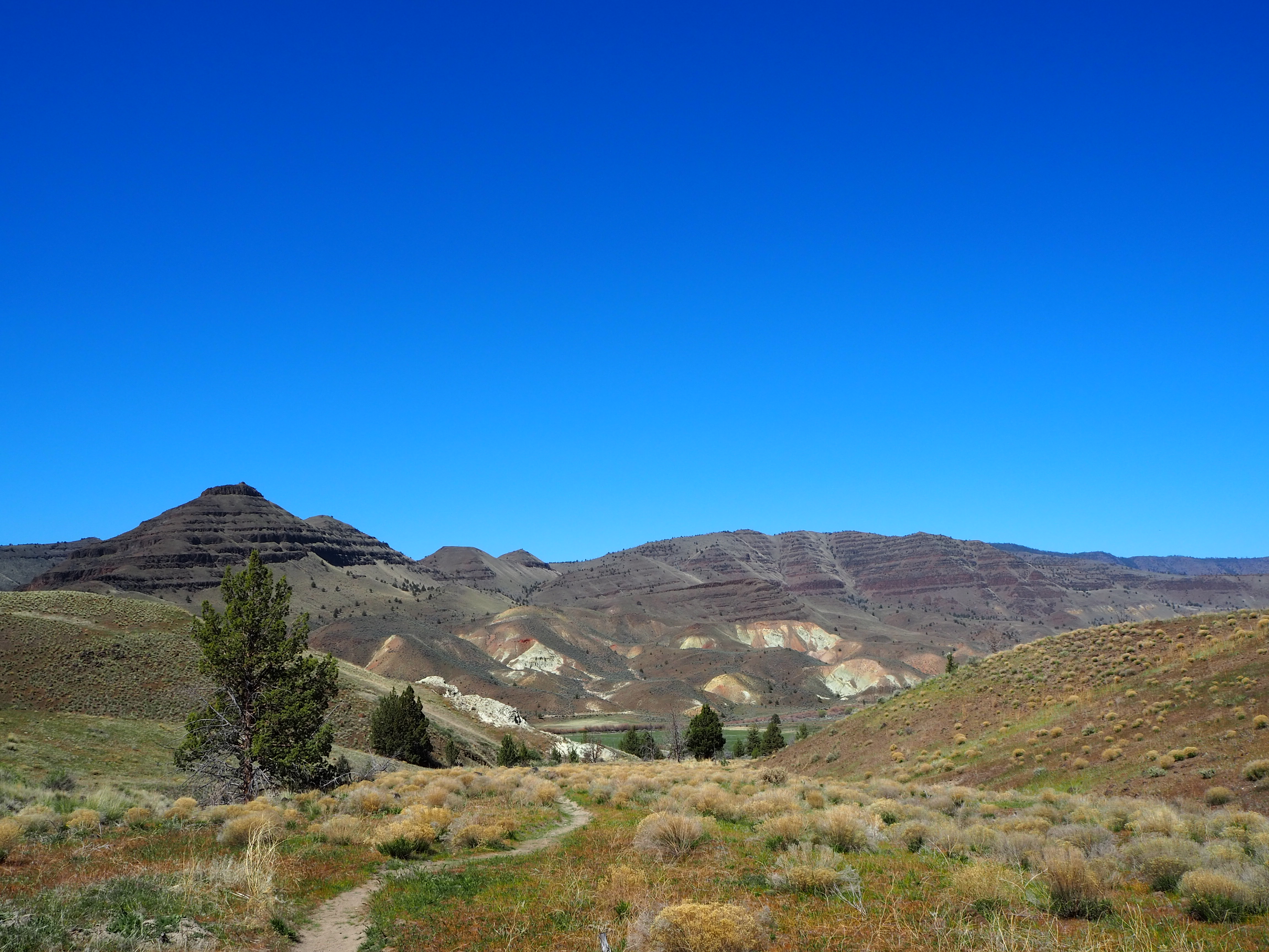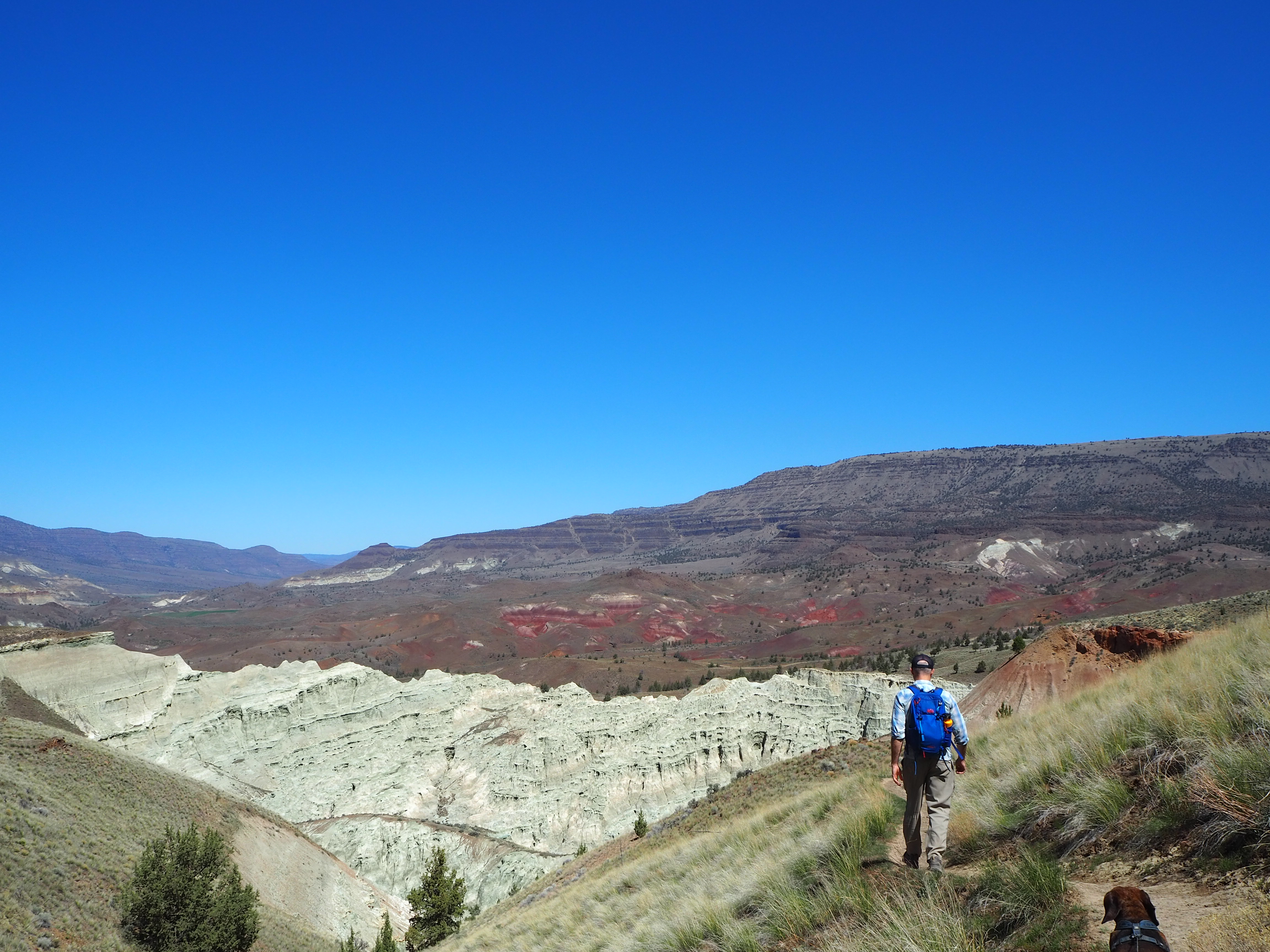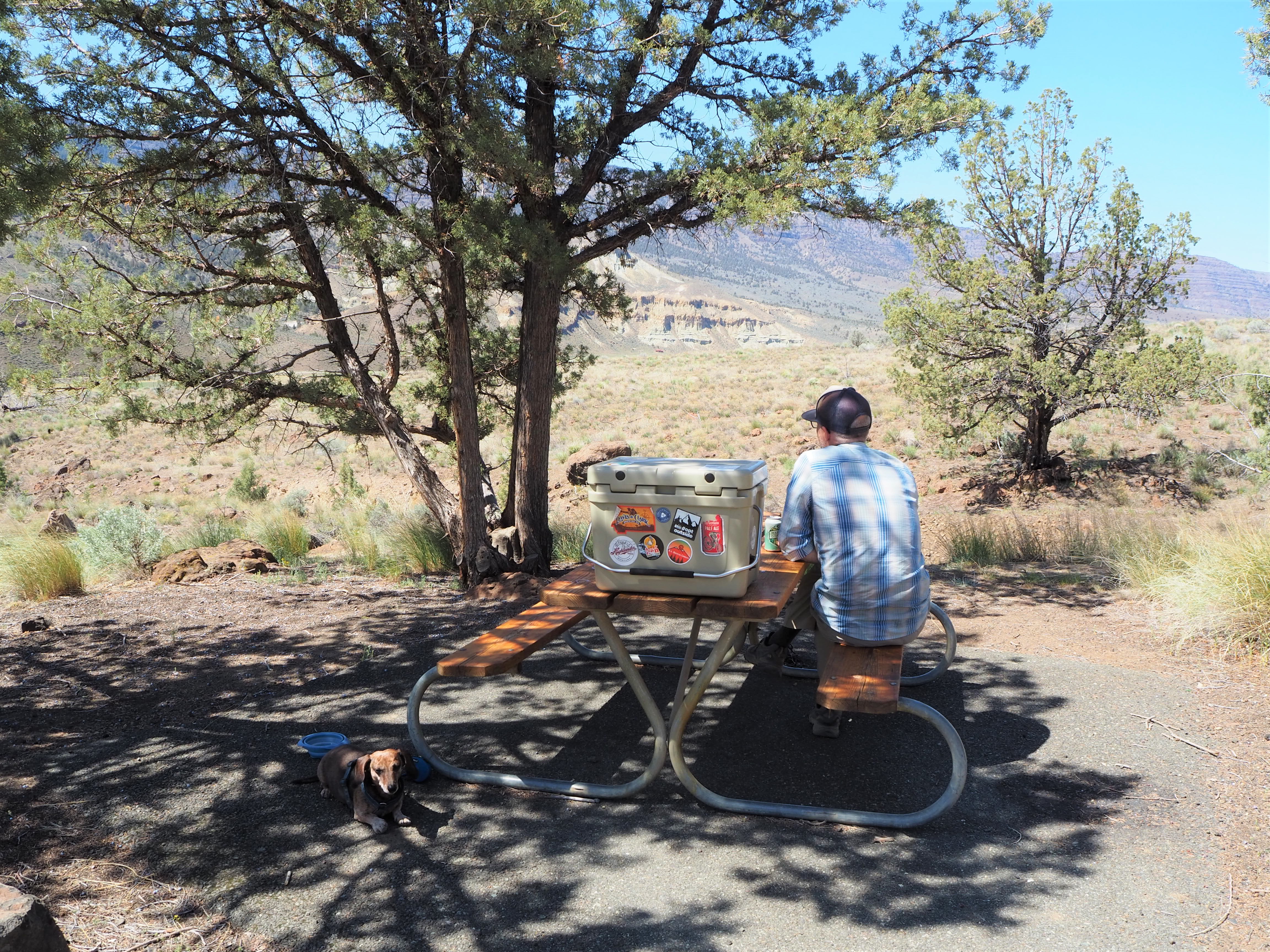 Hot and tired after our Blue Basin hike, we drove to the final piece of the Sheep Rock Unit, the Foree Trailhead. There were far fewer people there, only a couple of cars, so we were able to snag one of the well-shaded picnic tables for our lunch. Set back from the parking lot, it was nicely sequestered from anyone who arrived to hike. We enjoyed the solitude and the chance to cool off, as the temperatures reached toward the low 80s. The two trails here were brief (under 0.5 mile), and since one led to a view of blue-green claystones similar to Blue Basin, we chose to do Flood of Fire for a post-lunch walk. Tru, we quickly learned, was exhausted and uninterested in doing much more hiking. We carried him a bit to speed things along. It was a simple walk to a pretty overlook of the John Day River Valley and some colorful rock formations with a bench flanked by junipers. We surveyed the view and then turned back before the next flurry of hikers arrived.