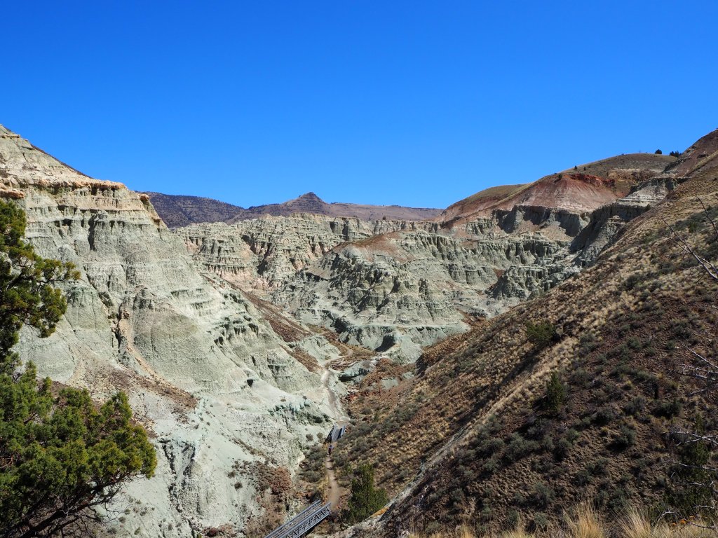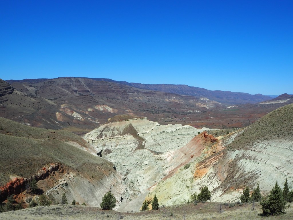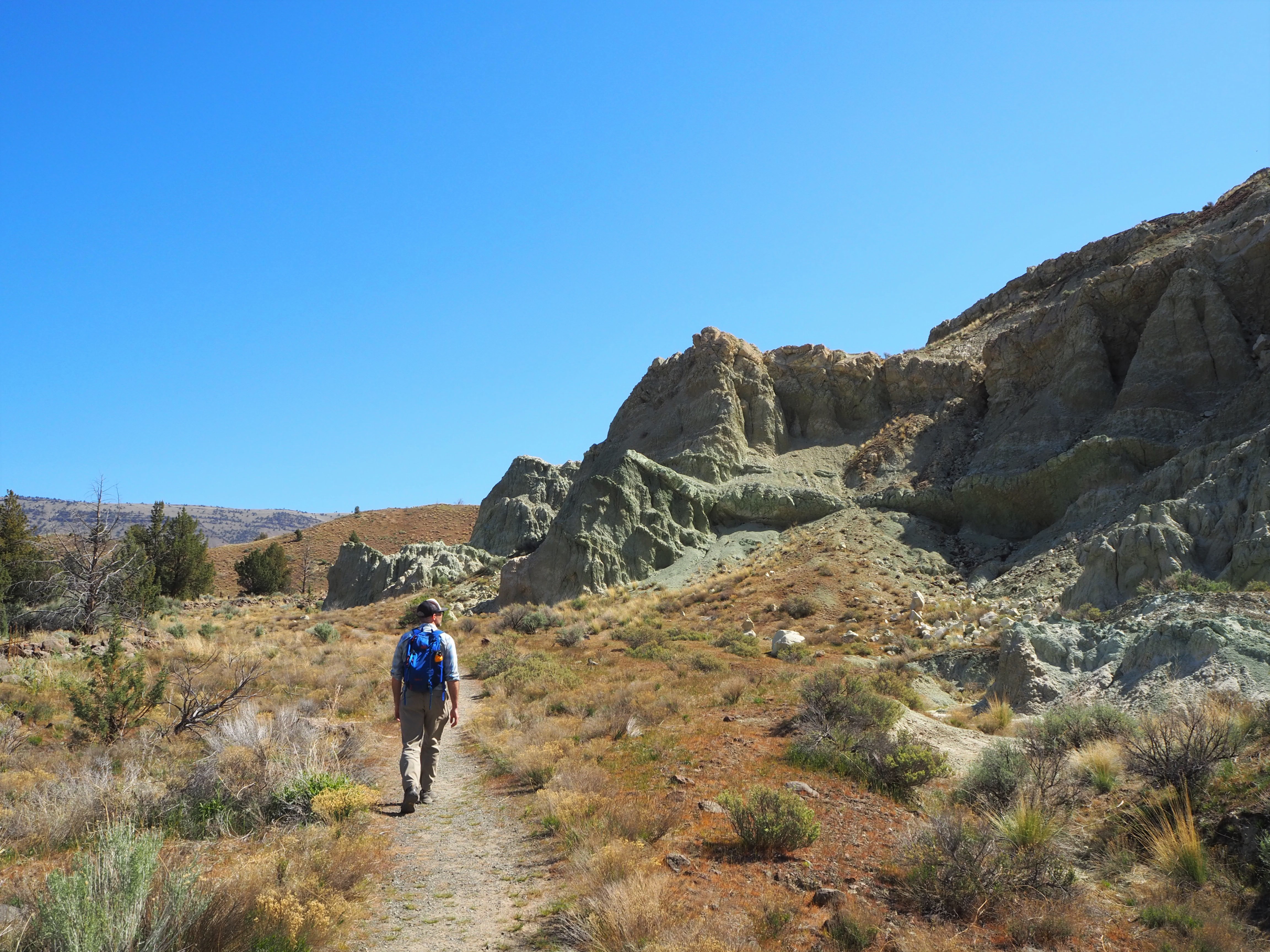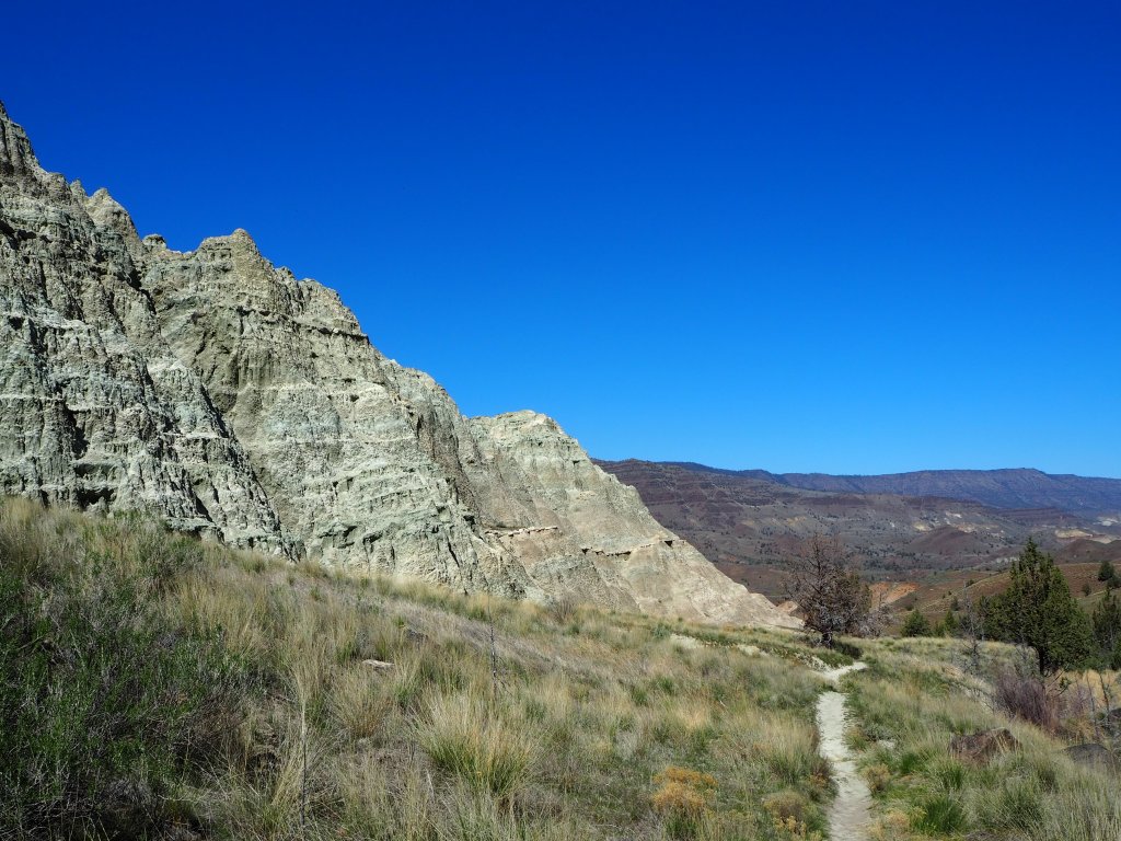 After our visit, we continued to our main hike for the day – Blue Basin. The longest hike in the Monument, Blue Basin is a 3.25 mile loop that circumnavigates an immense basin of blue-green claystones. When we got started just before noon, the weather was still cool and pleasant. We didn’t know anything about the trail, so when we came to the first small outcropping of claystones, we stopped to admire them for quite a while, thinking it might be one of the trail highlights. As the trail climbed, we had beautiful views at our backs of the lush ranching fields that straddle the John Day River. We skirted along cliff sides of exposed claystones admiring the beauty in their erosion. We steadily scaled to the top of the ridge, gaining sweeping views of the rolling hillsides across from us.
