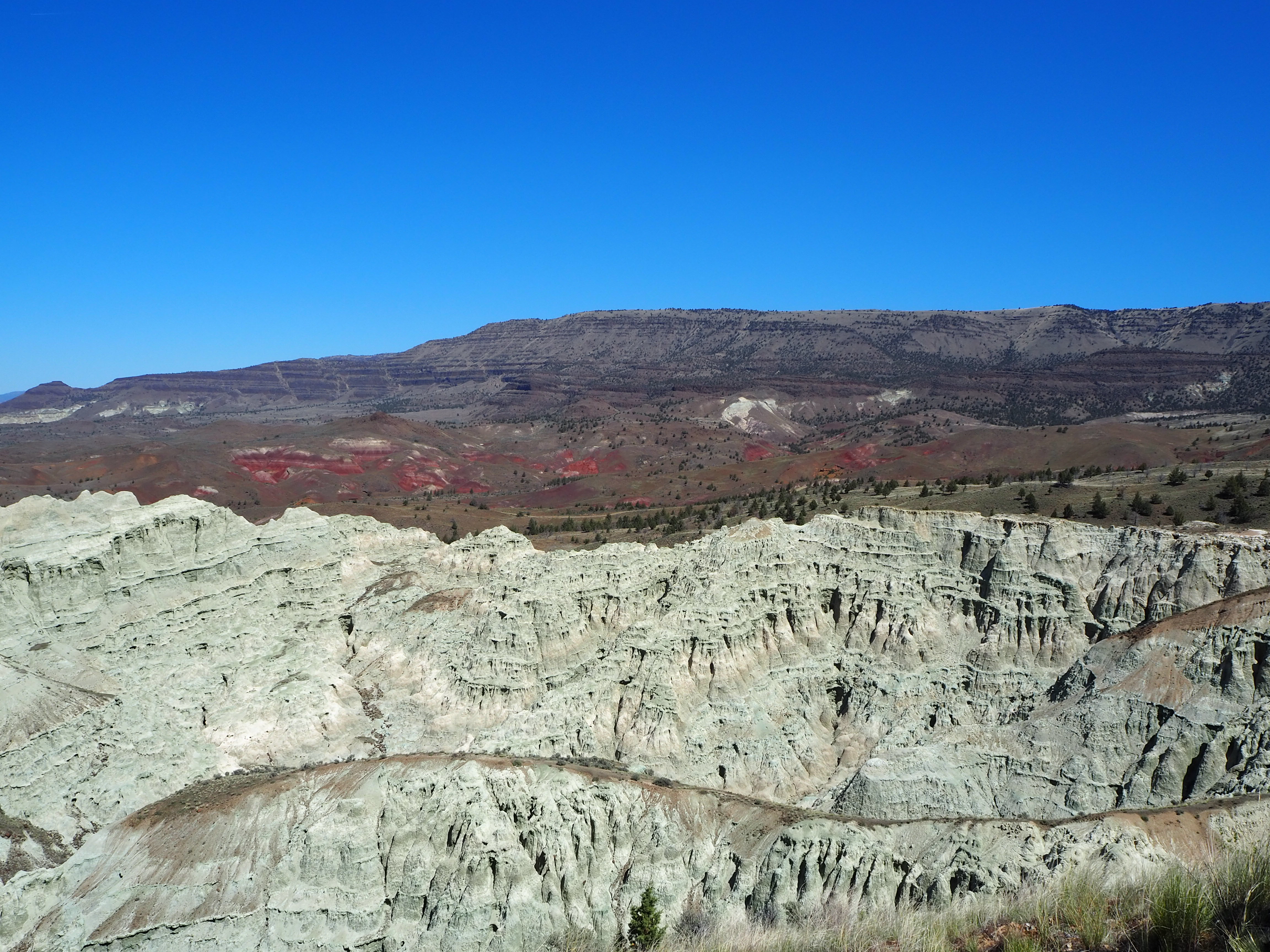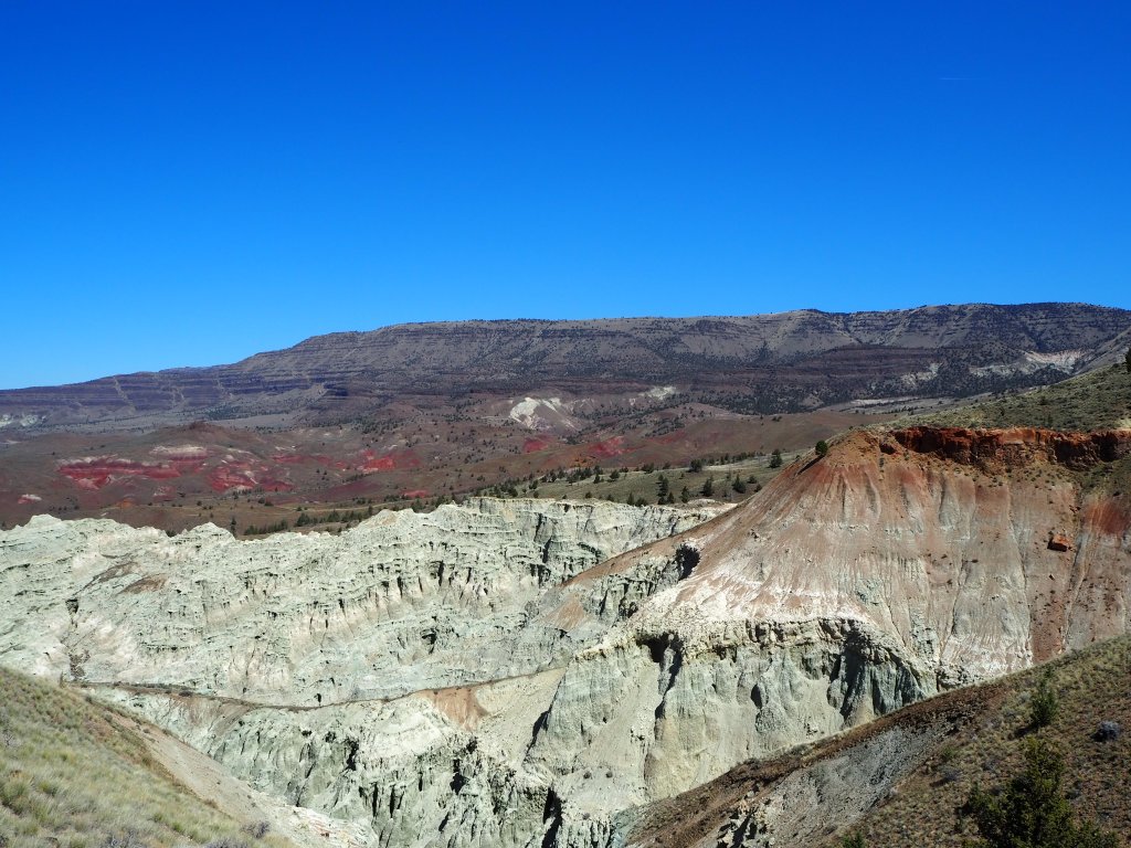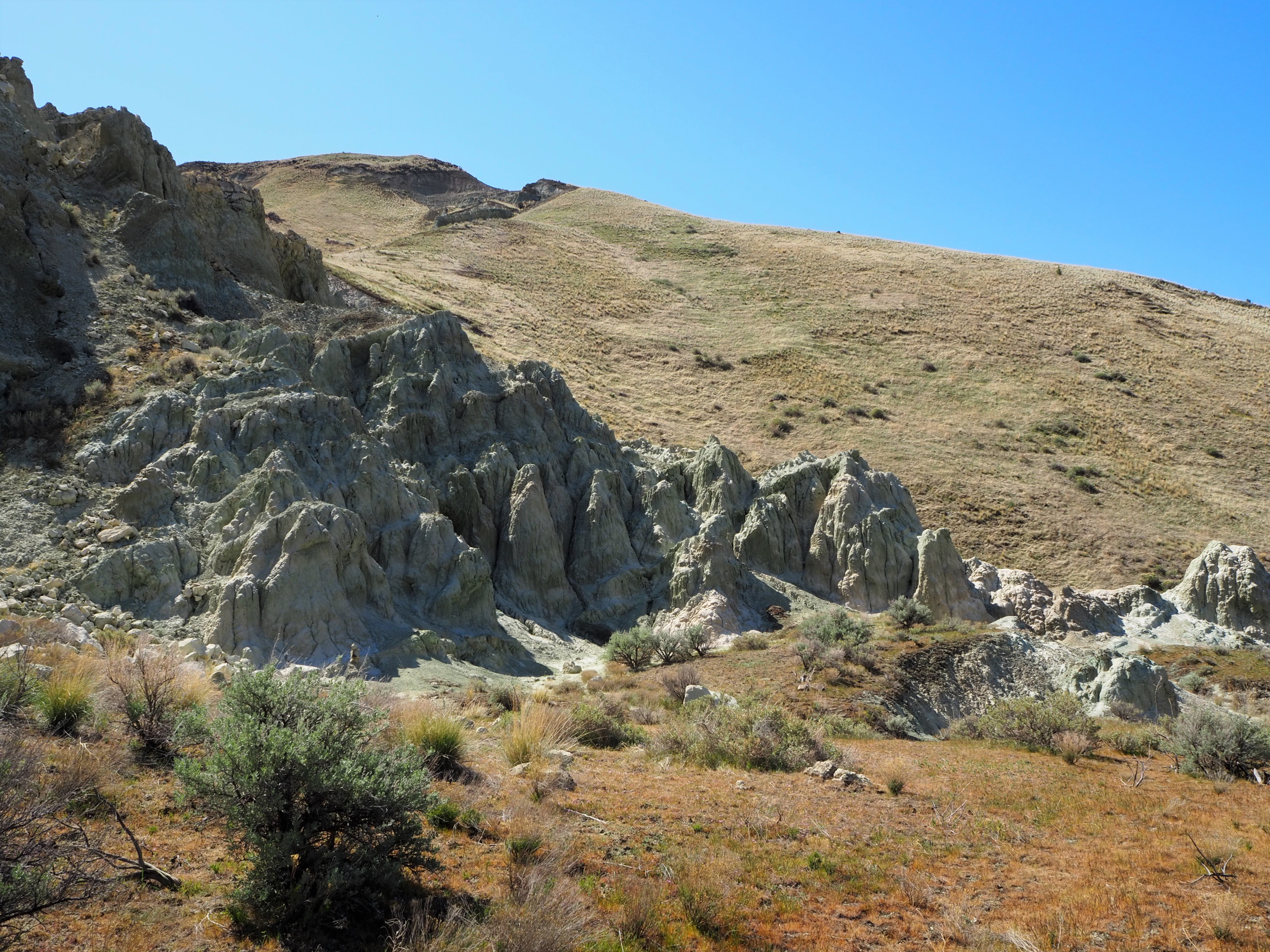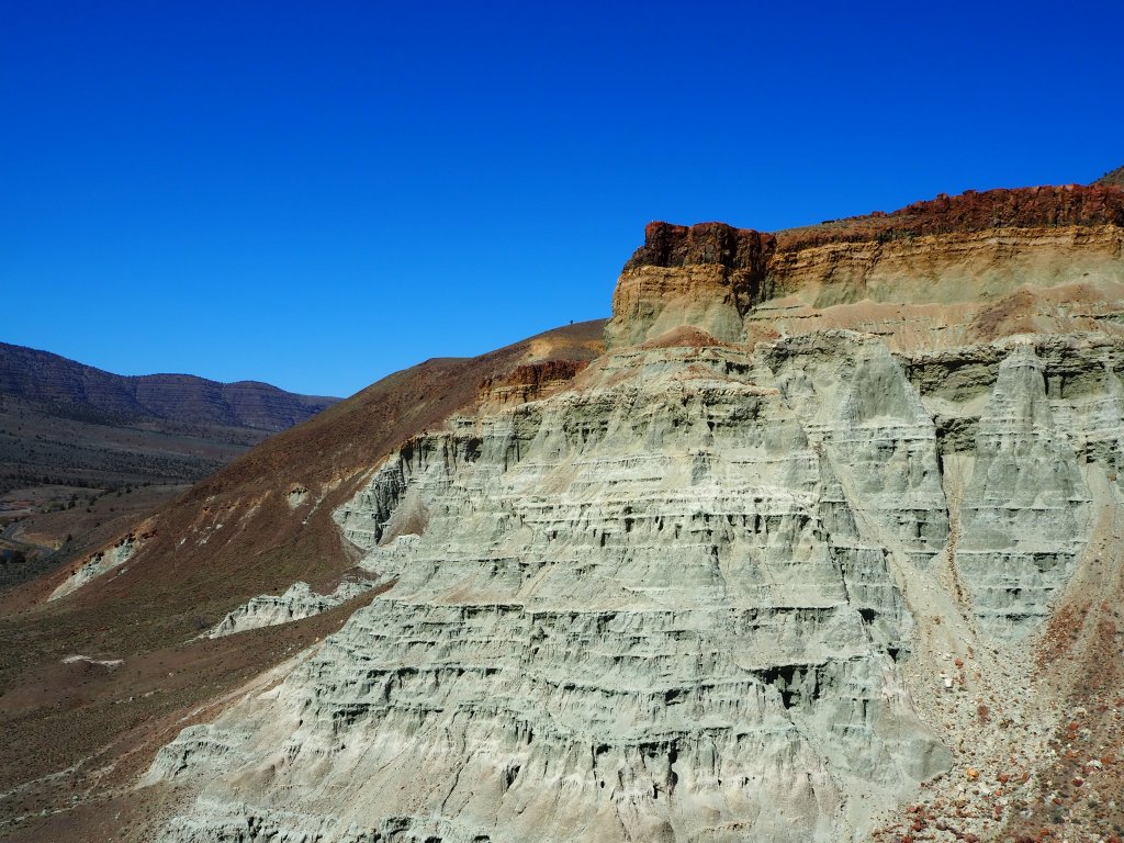 After our visit, we continued to our main hike for the day – Blue Basin. The longest hike in the Monument, Blue Basin is a 3.25 mile loop that circumnavigates an immense basin of blue-green claystones. When we got started just before noon, the weather was still cool and pleasant. We didn’t know anything about the trail, so when we came to the first small outcropping of claystones, we stopped to admire them for quite a while, thinking it might be one of the trail highlights. As the trail climbed, we had beautiful views at our backs of the lush ranching fields that straddle the John Day River. We skirted along cliff sides of exposed claystones admiring the beauty in their erosion. We steadily scaled to the top of the ridge, gaining sweeping views of the rolling hillsides across from us.