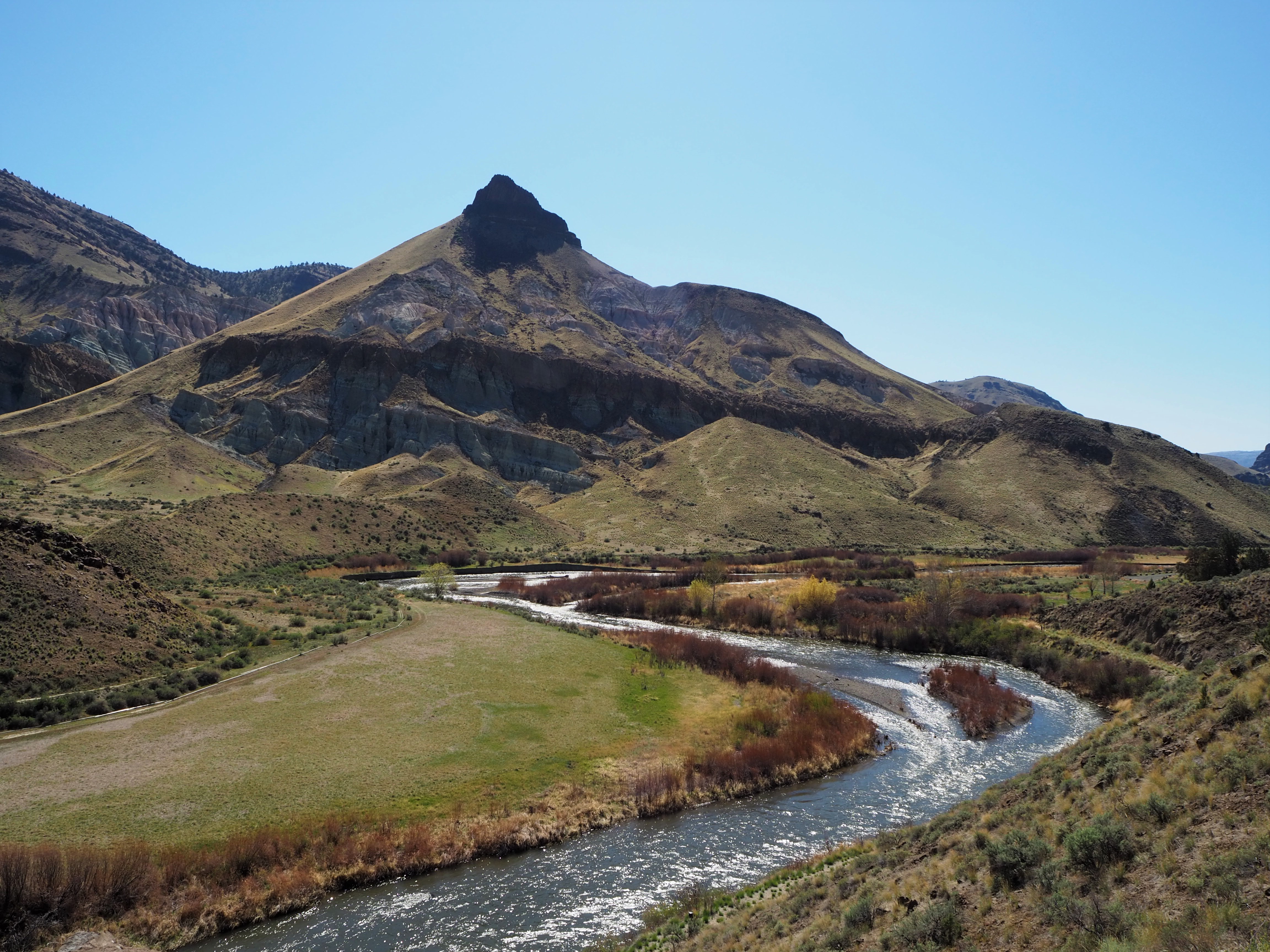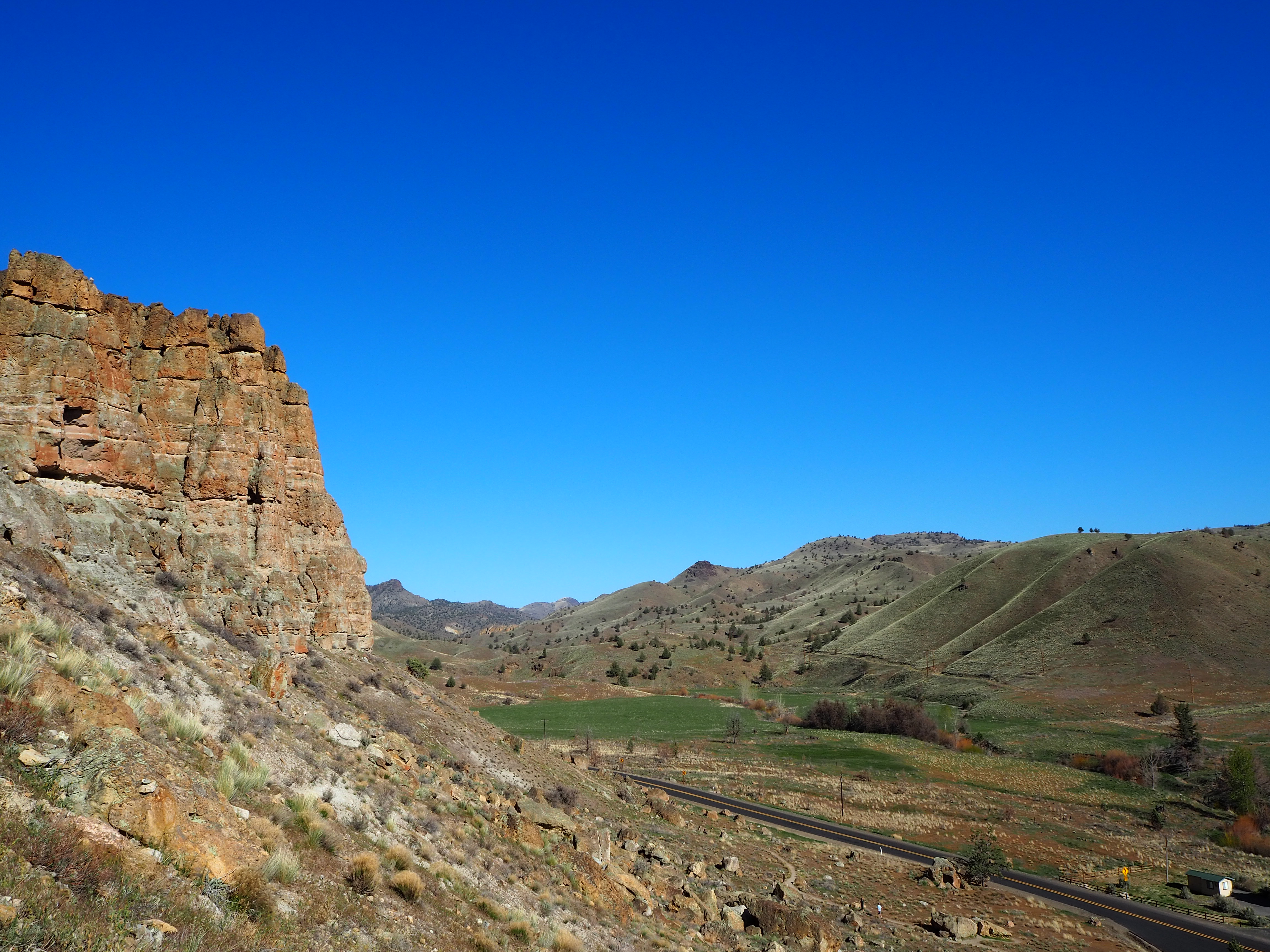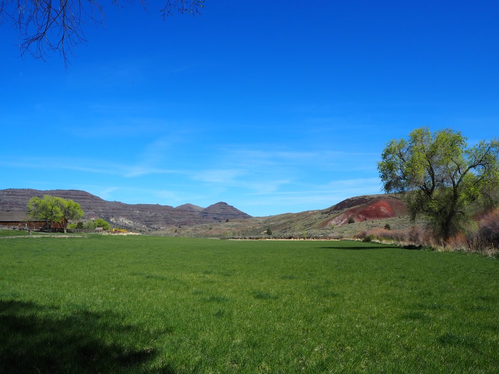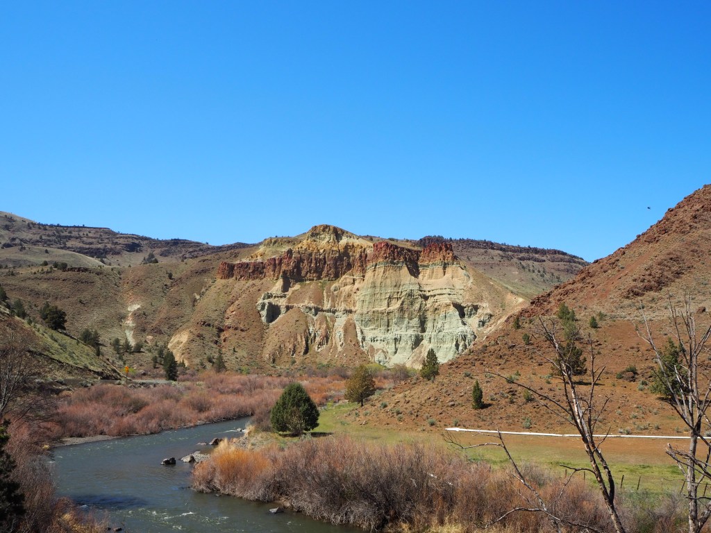 On Sunday morning, we took our time making breakfast and lounging around before breaking down camp. Zach even hiked up a nearby hill with his trumpet (cue eye roll). We stopped by the drive-thru coffee stand outside of Mitchell for a caffeine fix, and then began the somewhat familiar drive east toward Sheep Rock again. I wanted to stop to check out the one area we had skipped the day before – the James Cant Ranch. This area is reminiscent of the Gifford House at Capitol Reef NP, minus the fruit pies and jams. The Cant Ranch was established as a sheep ranch in 1910 by Scottish immigrants. Today, it serves as the Monument headquarters and operates as a working hay farm. It sits alongside the John Day River and has several nicely shaded picnic tables, a trail leading to the river and another to an overlook, a small orchard, and tours of the historical Cant home. While Zach and Tru hung back in the shade, I ventured up the short overlook trail for a really great view of Sheep Rock rising above a large bend in the John Day River.