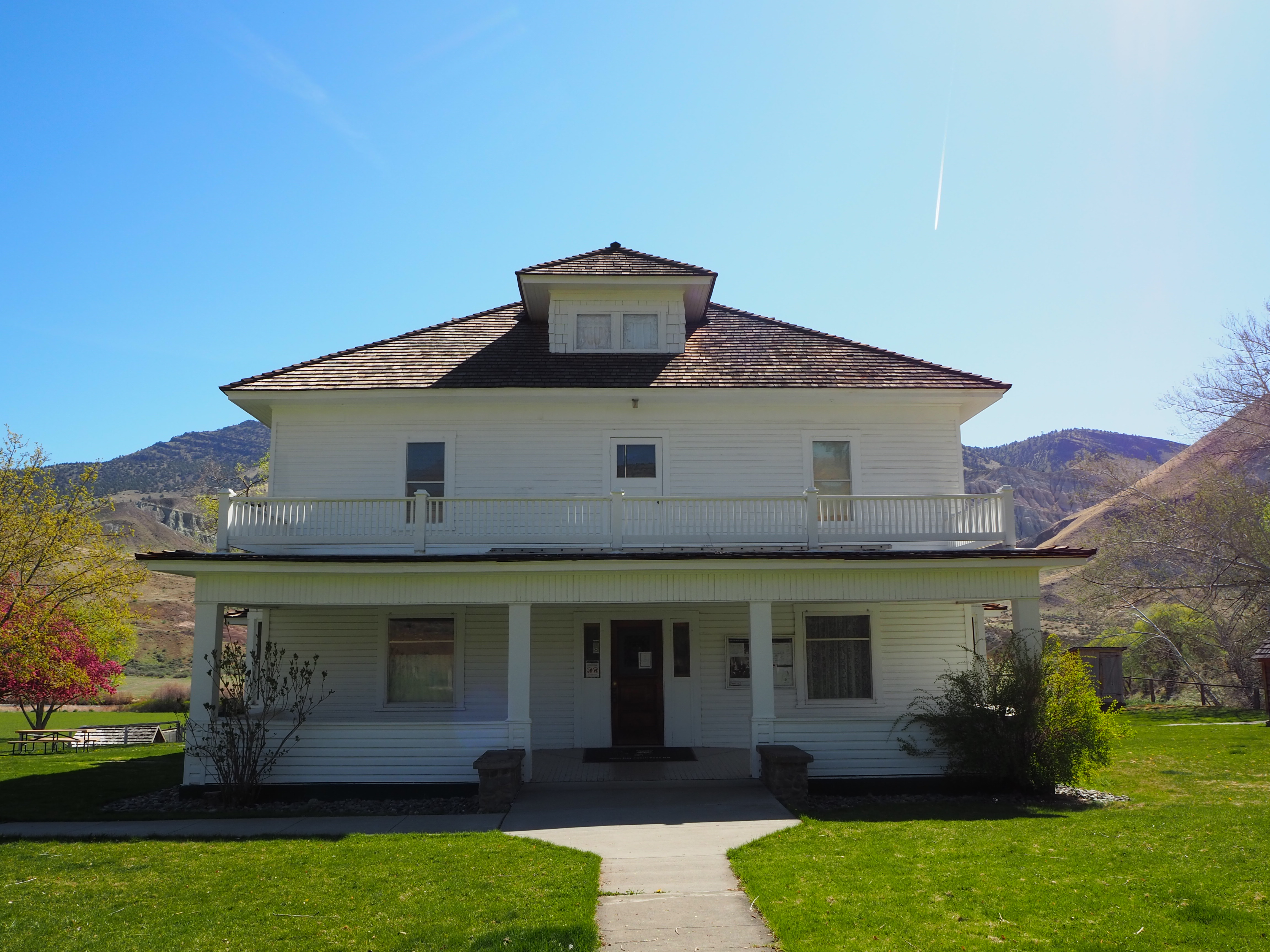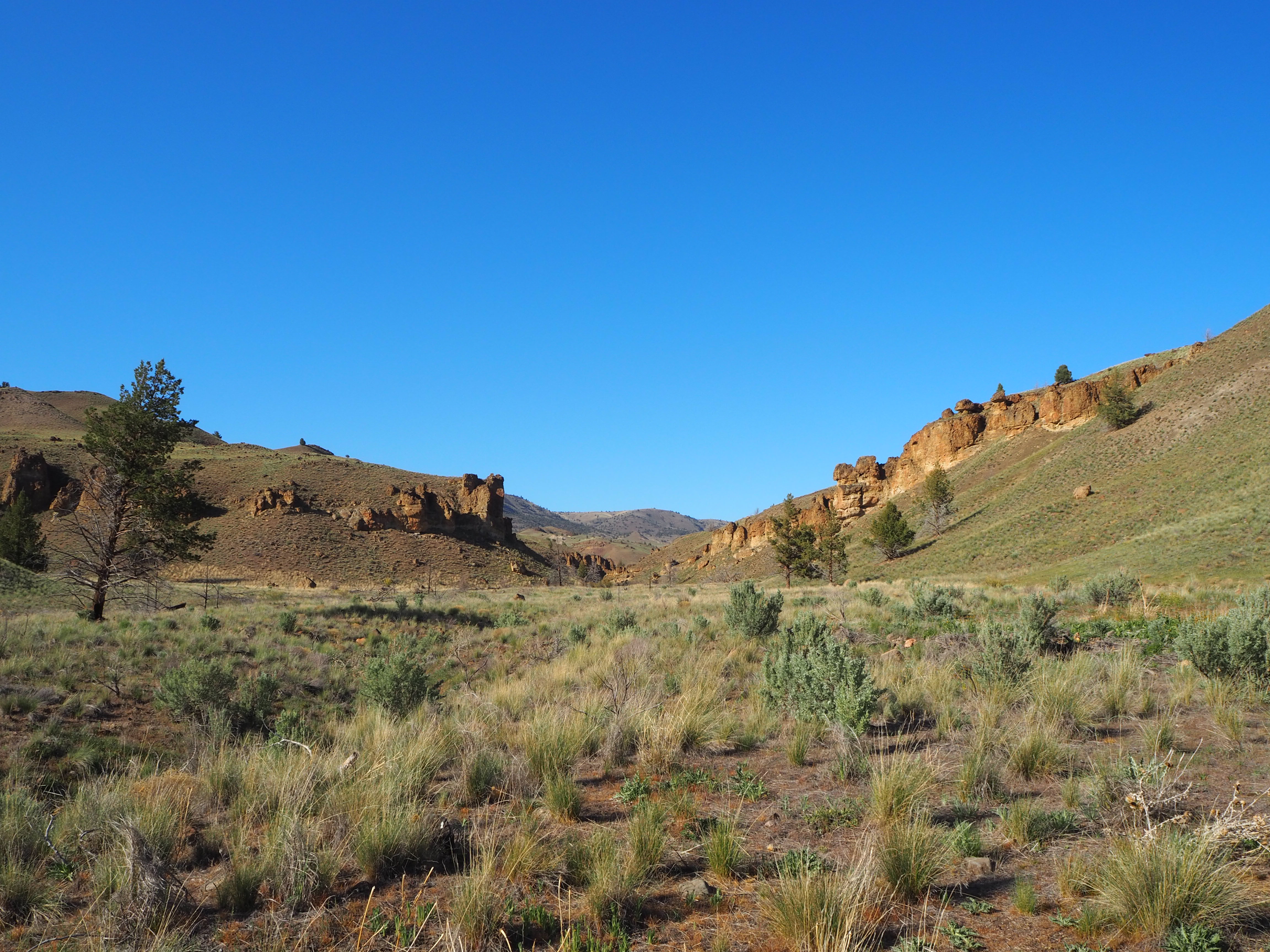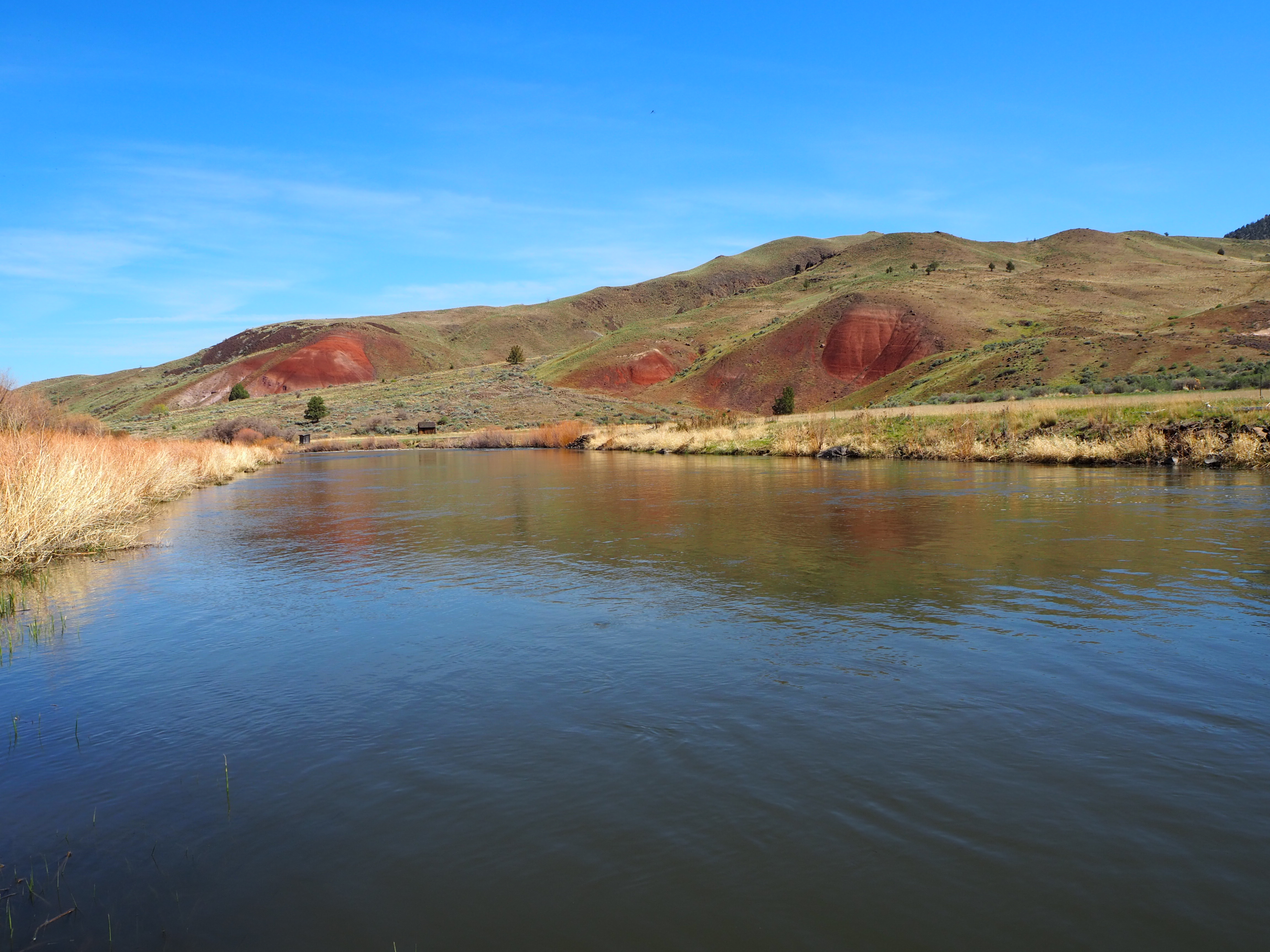On Sunday morning, we took our time making breakfast and lounging around before breaking down camp. Zach even hiked up a nearby hill with his trumpet (cue eye roll). We stopped by the drive-thru coffee stand outside of Mitchell for a caffeine fix, and then began the somewhat familiar drive east toward Sheep Rock again. I wanted to stop to check out the one area we had skipped the day before – the James Cant Ranch. This area is reminiscent of the Gifford House at Capitol Reef NP, minus the fruit pies and jams. The Cant Ranch was established as a sheep ranch in 1910 by Scottish immigrants. Today, it serves as the Monument headquarters and operates as a working hay farm. It sits alongside the John Day River and has several nicely shaded picnic tables, a trail leading to the river and another to an overlook, a small orchard, and tours of the historical Cant home. While Zach and Tru hung back in the shade, I ventured up the short overlook trail for a really great view of Sheep Rock rising above a large bend in the John Day River.