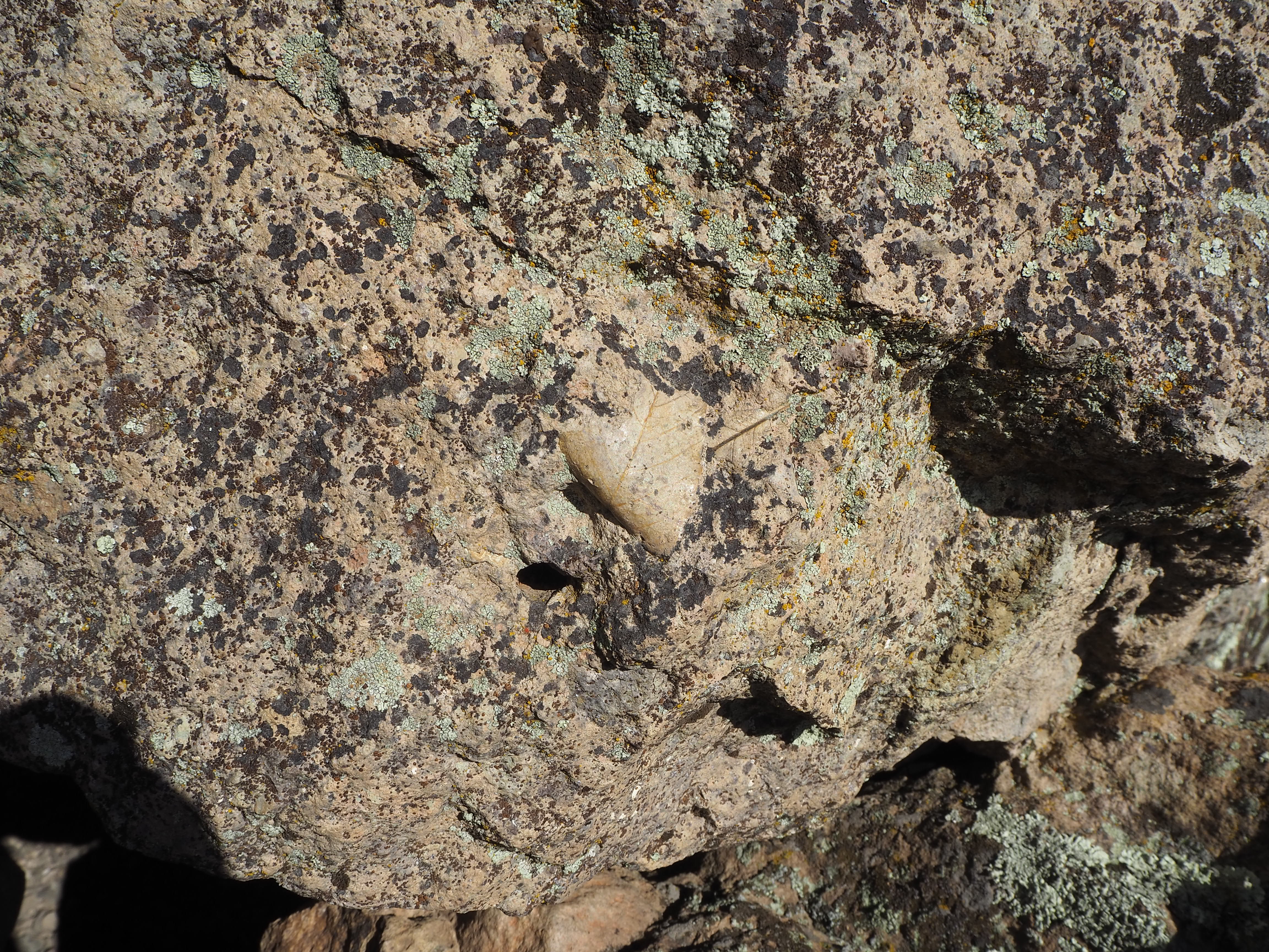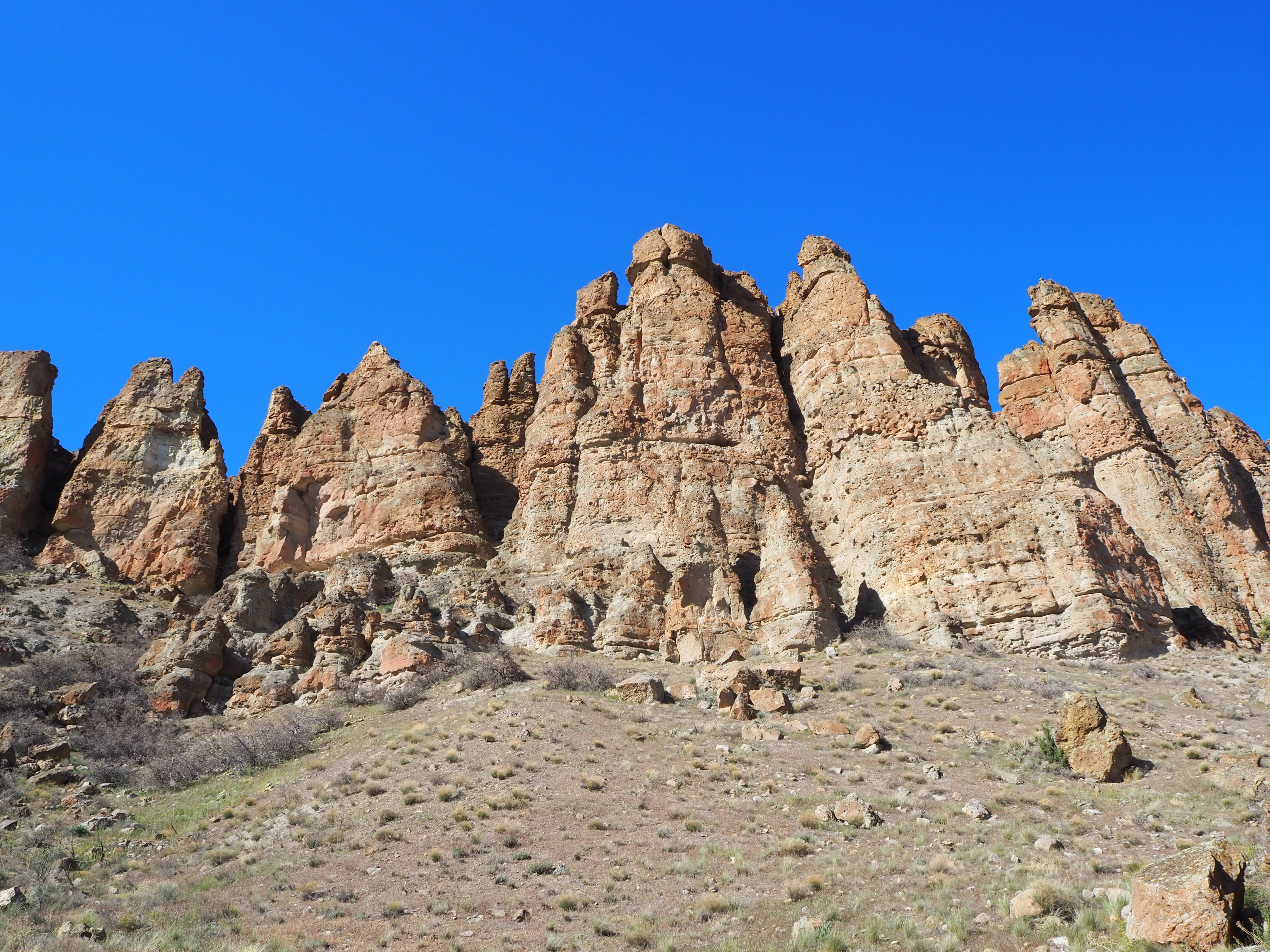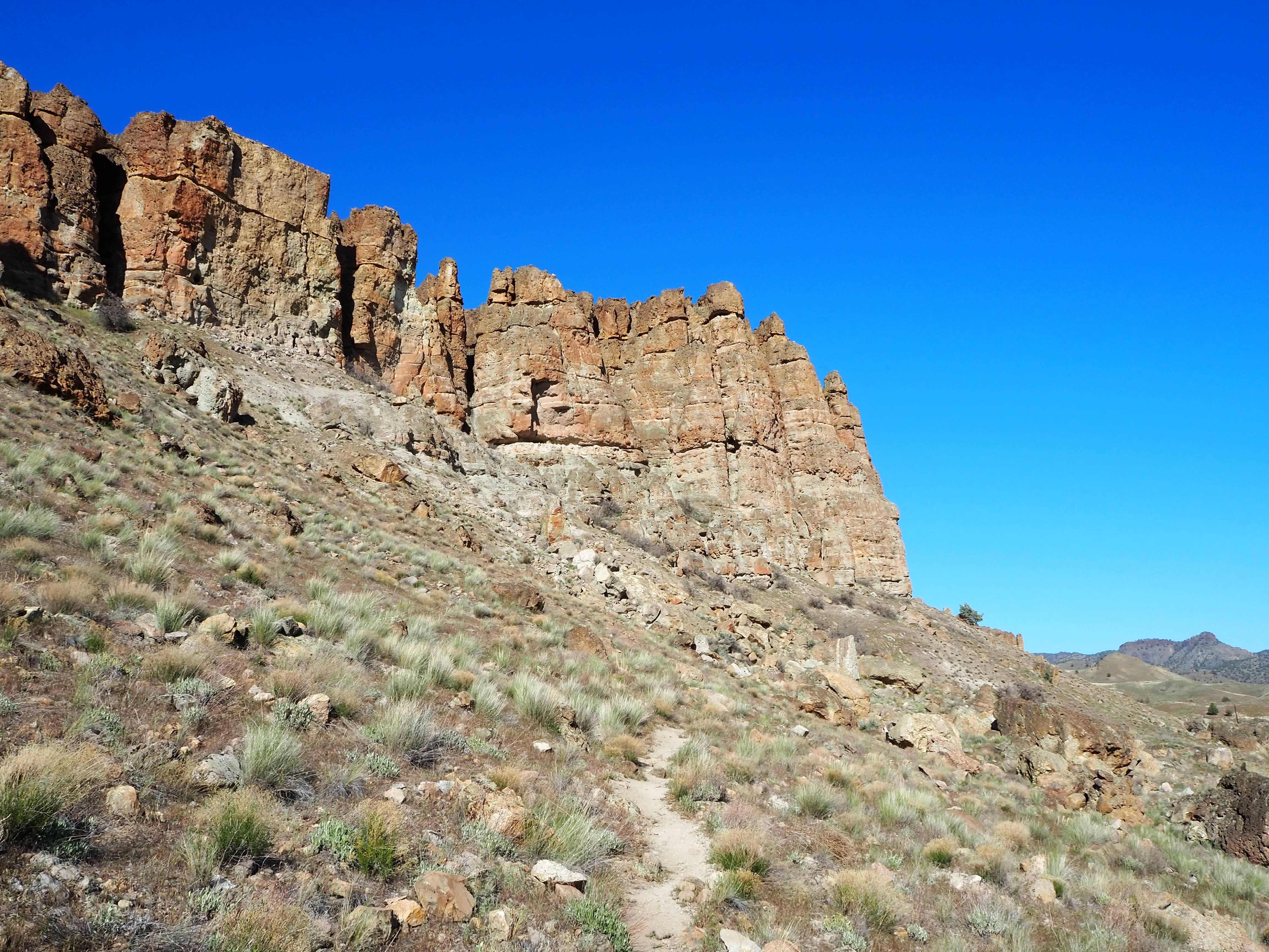 Back in the car, it was time to go to the final unit – Clarno. The least visited, Clarno is the smallest and fairly far from the other two units (2 hours from Sheep Rock and 1.5 hours from Painted Hills). It’s tucked in a canyon alongside a quiet two-lane road that doesn’t seem to see much traffic other than motorcyclists and cyclists out for a ride. The drive from Sheep Rock was beautiful as we followed the John Day River on its journey north to the confluence with its North Fork until we parted ways at Service Creek, then we travelled on quiet tree-lined roads connecting rural communities. By the time we arrived, it was late afternoon and the temperature was at its peak. I had hoped that the car ride would give Truman the rest he needed and then he might be willing to do one of the short trails at the Clarno Unit. As we took the trail that connected the parking lot and rest area to the other two trails, it became clear that Truman was done. Really, we were all done. What remaining zest we’d had was quickly zapped by the heat and sun. The main sight at Clarno are the Palisades, gigantic eroded cliff sides that are leftover from an ancient volcanic mudslide. They were imposing and shone brightly in the afternoon sun. Zach found a shaded bench to sit on with Tru, while I ran up the arch trail to get a better vantage of the Palisades, then perused part of the other path, searching for fossilized leaves embossed in the rock face. Like the other units, the trails here were all less than 0.5 mile in length, but even that couldn’t persuade me to complete one. Tired, but accomplished, we drove back to our campsite.