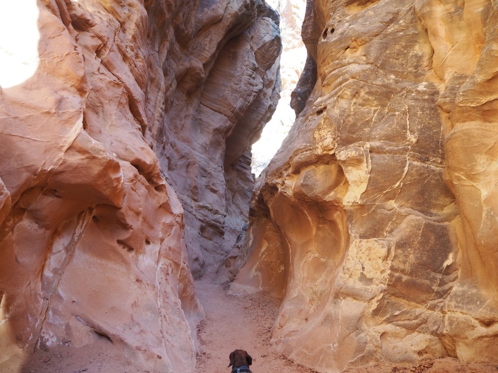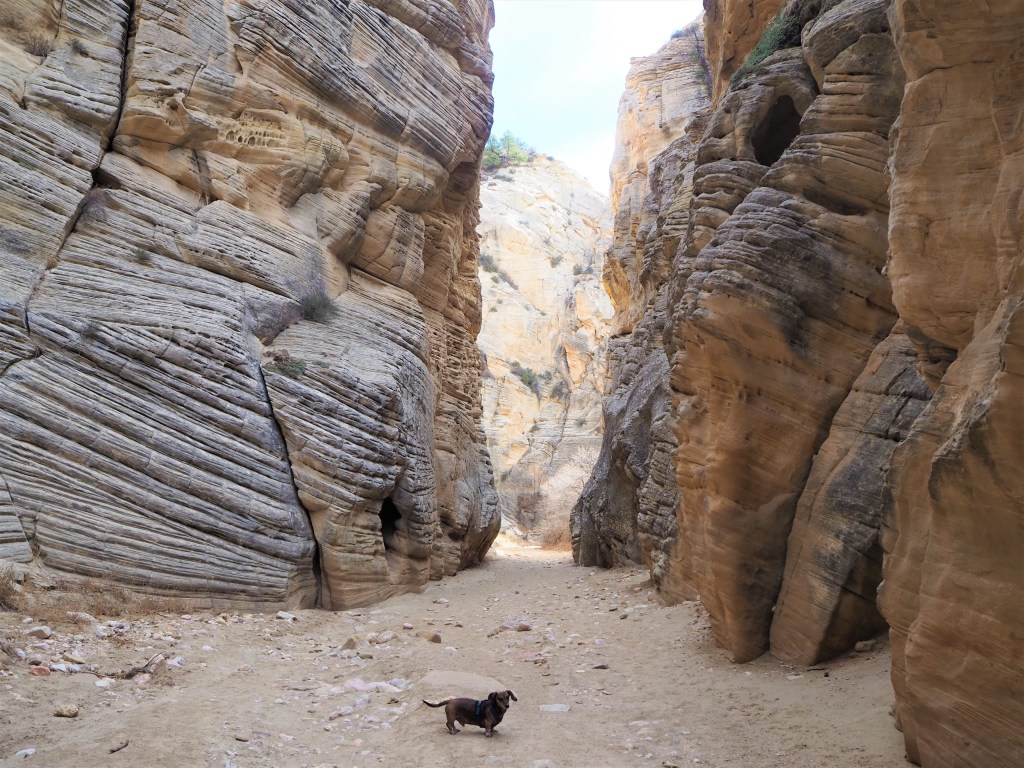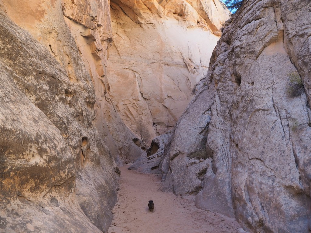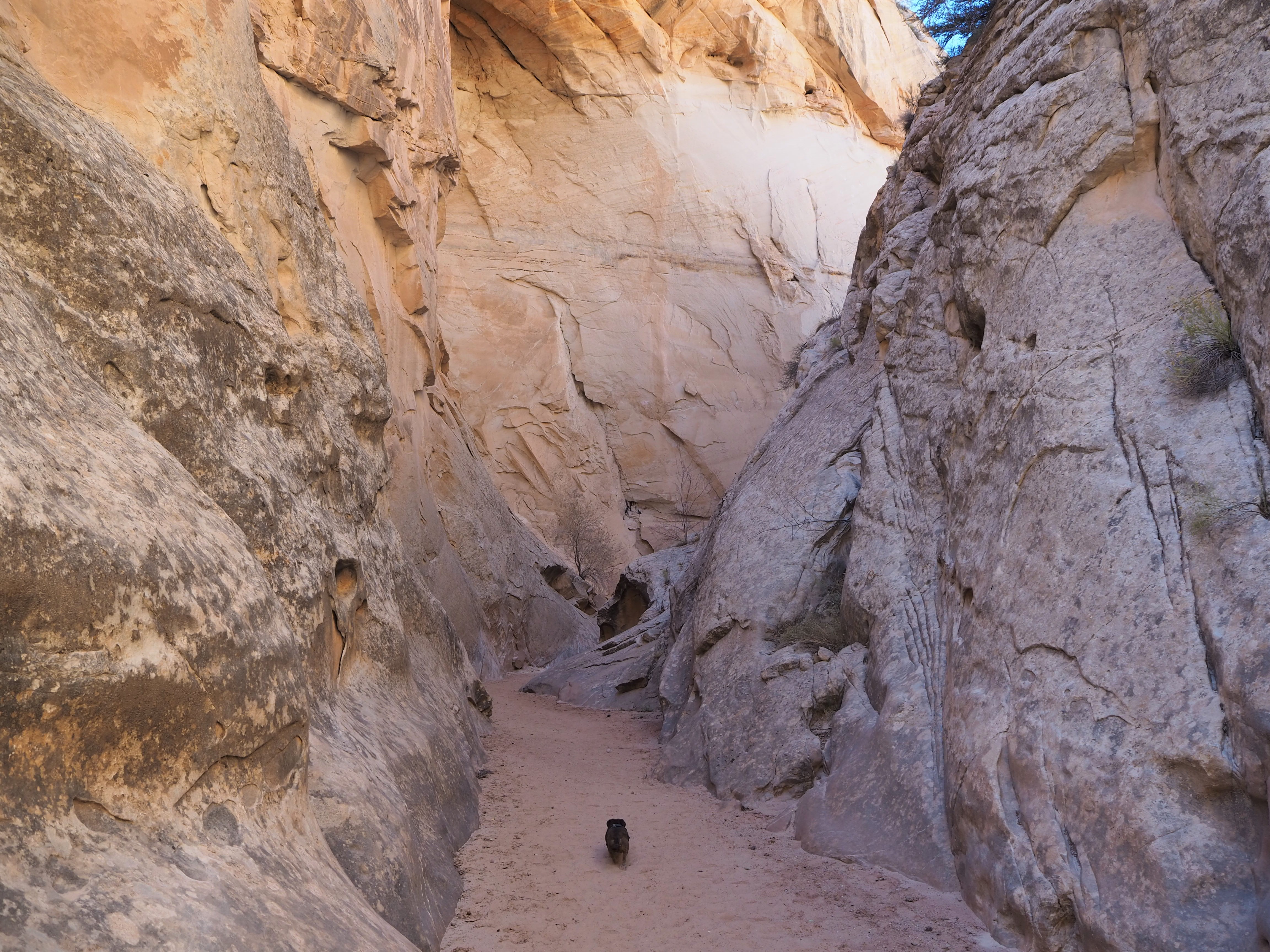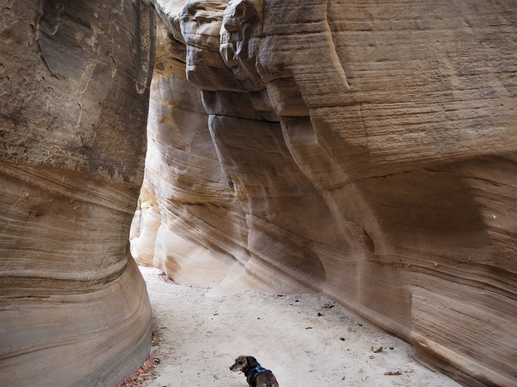 The road begins in a rather unassuming spot between two mile markers. We pulled off the highway and set off across a high plateau with grey badlands rising in the distance. We passed one car parked to the side of the road with several of its occupants peeing – I guess they thought they would be alone! – and continued winding our way toward the Paria River Valley in the distance. Before the road dipped down into the valley, we pulled onto a spur which led to the top of a hill and surveyed the magnificent view of the badlands, river valley, and the immensity of the landscape. The wind was ferocious, whipping around us, but it was the view that was breathtaking. As we continued, we made several stops to admire rock formations and the general scenery. It reminded us a bit of the drive along the Waterpocket Fold, with colorful swirling sandstone creations bordering one side of the road, and the Cockscomb (a ridge of steeply tilted and eroded teeth) on the other. Although I had researched and written down several hikes along the road, we decided we had time for only one. I chose what I imagine is the most popular hike along this route, the Cottonwood Wash Narrows.