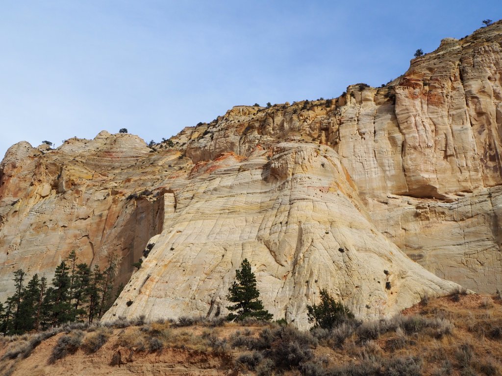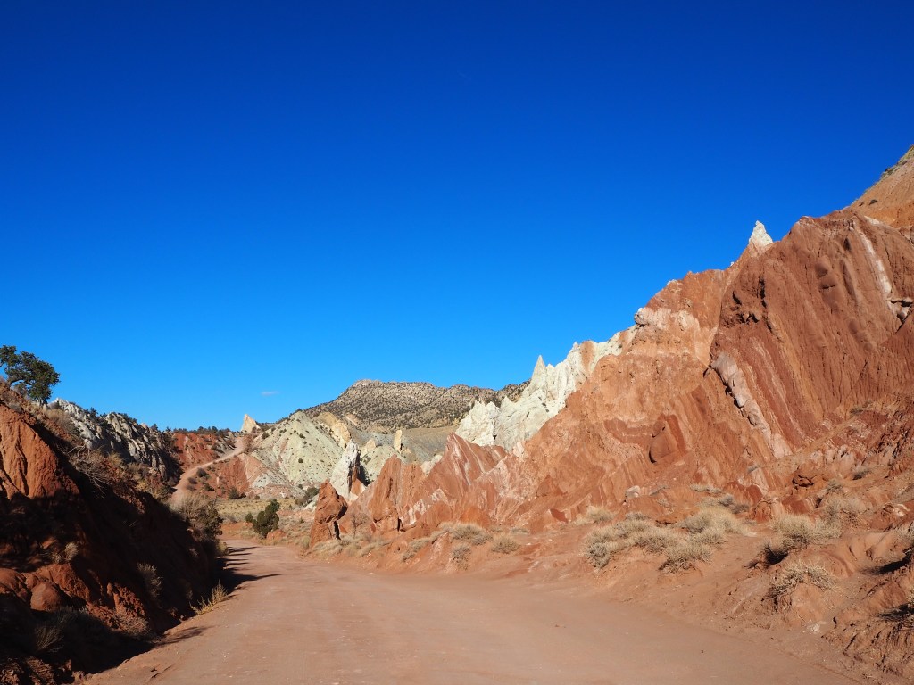 The forecast during our stay was exactly as we’d hoped: mostly sunny with the kind of cool desert temperatures that make hiking in the fall so wonderful; just enough chill to wear a fleece. On Monday, I thought we’d take it easy with a drive up Johnson Canyon to Skutumpah Road where we could stop at Lick Wash and hike as far as we wanted. Johnson Canyon is a paved, scenic drive through a wide canyon of pastures that was once used as the backdrop for several old Hollywood films – most notably, Gunsmoke, (both the movie and some of the tv series). Most of the sites of interest sit on private property, so it felt a little anticlimactic to me, but it was a beautiful drive nonetheless. The road crosses the boundary into Grand Staircase-Escalante National Monument (GSENM) – where it gets a little more scenic – before the pavement runs out. We turned onto Skutumpah (like “Scoot ’em pah”) to follow it another 15 miles before the trailhead for Lick Wash came into view. We encountered Skutumpah Road on a previous trip, starting at its northern terminus and ending at the trailhead for Wilson Creek, a similar wash hike. That section of Skutumpah was a bit more adventurous, taking us up a steep hill and around sharper curves, on a narrow road softened by recent rain. This section was much more tame. It was fairly flat and wide, with lots of room to let faster vehicles pass us while we meandered along.