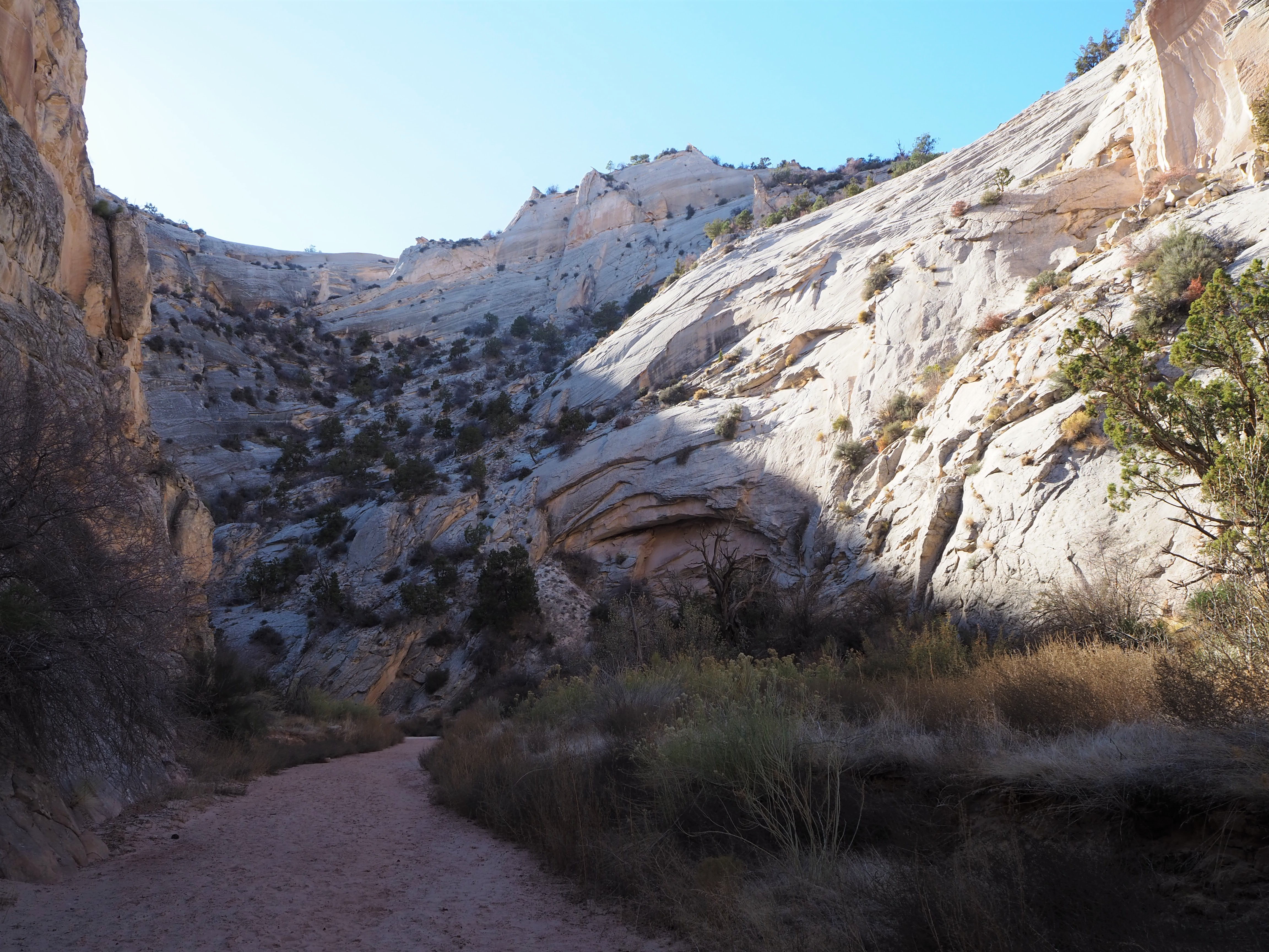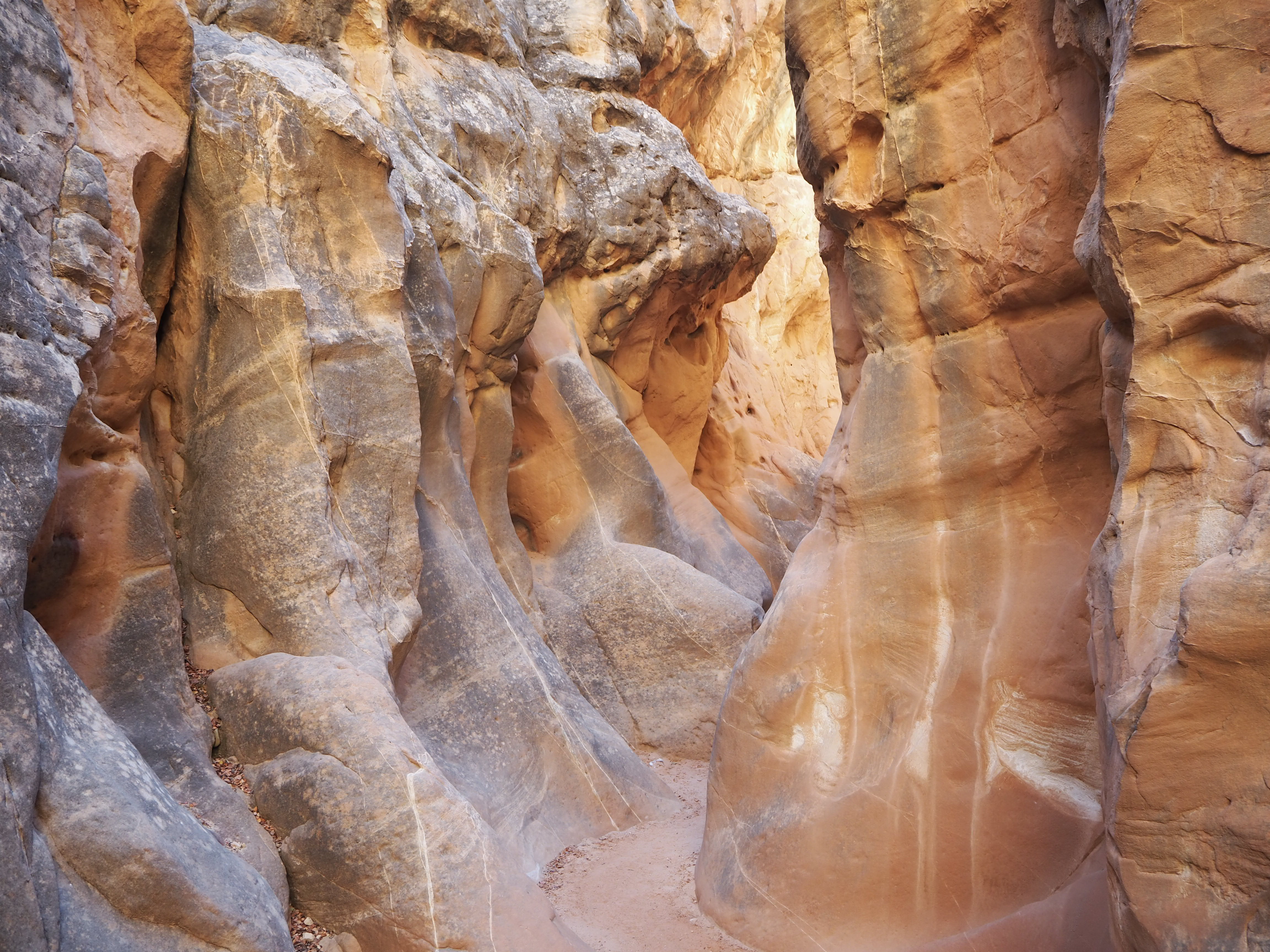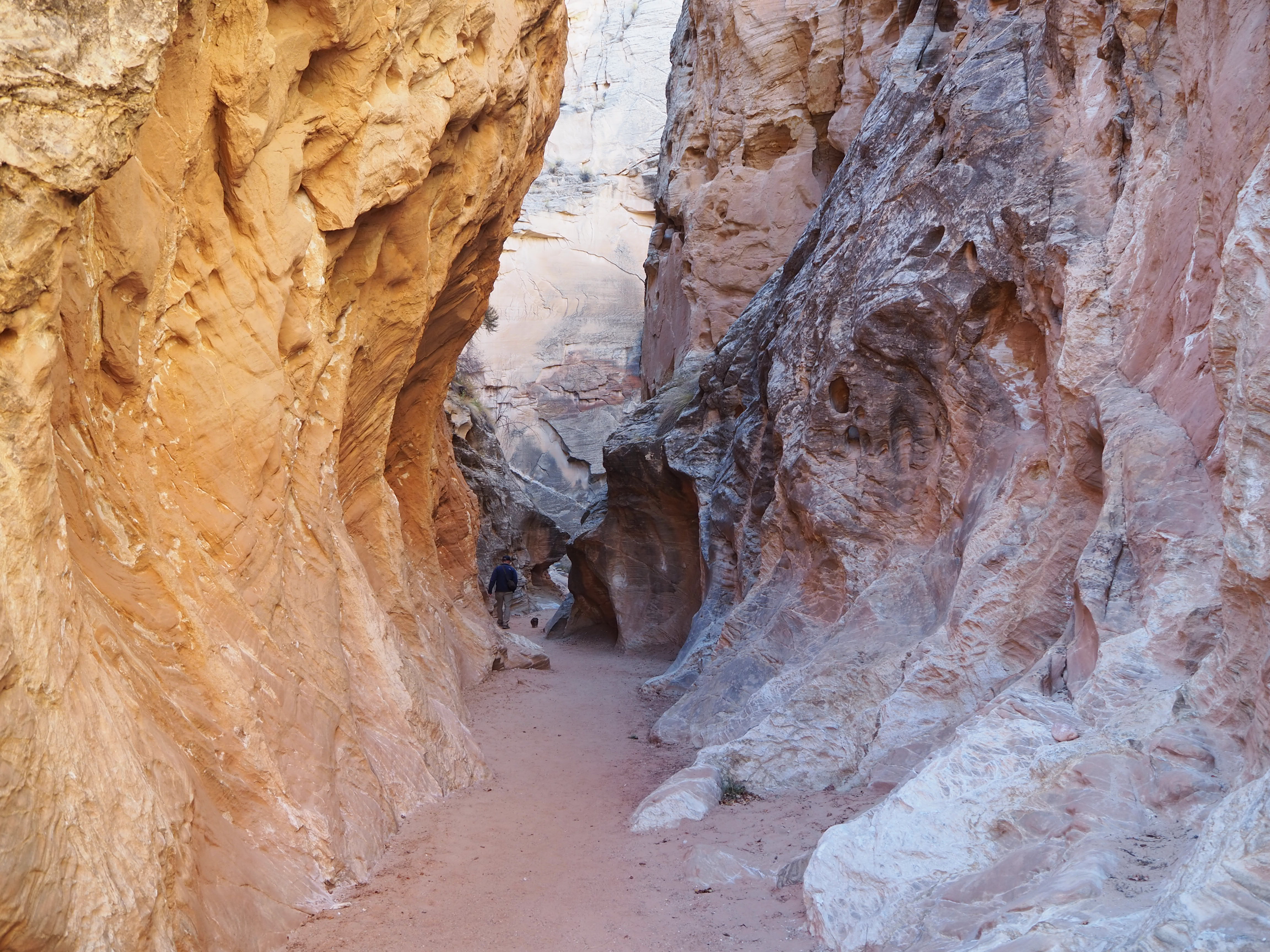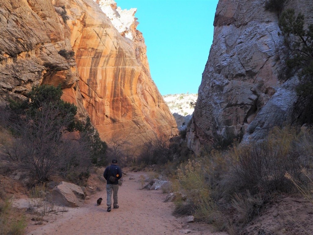 There are two trailheads, a north and south, one at each end of the canyon. Since we were driving the road south to north, we stopped at the southern trailhead to begin the hike. I signed us into the trailhead register, and we set off down the trail to the entrance of the canyon. Not far in we realized there wasn’t a clear path into the canyon due to a collection of flash flood/rockfall debris. However, a quick evaluation showed us an easy way to climb up and over some boulders that would put us on the path above. From there, it was easy walking down the sandy wash hemmed in by towering canyon walls. Warm in the sun on a cool fall day, it could easily become a furnace in the summer. Soon, we reached the first of many narrows, the walls closing in tighter and providing a shady respite from the sun. We let the canyon usher us in and out of its undulating curves, enjoying the spectrum of colors reflected on the sandstone.