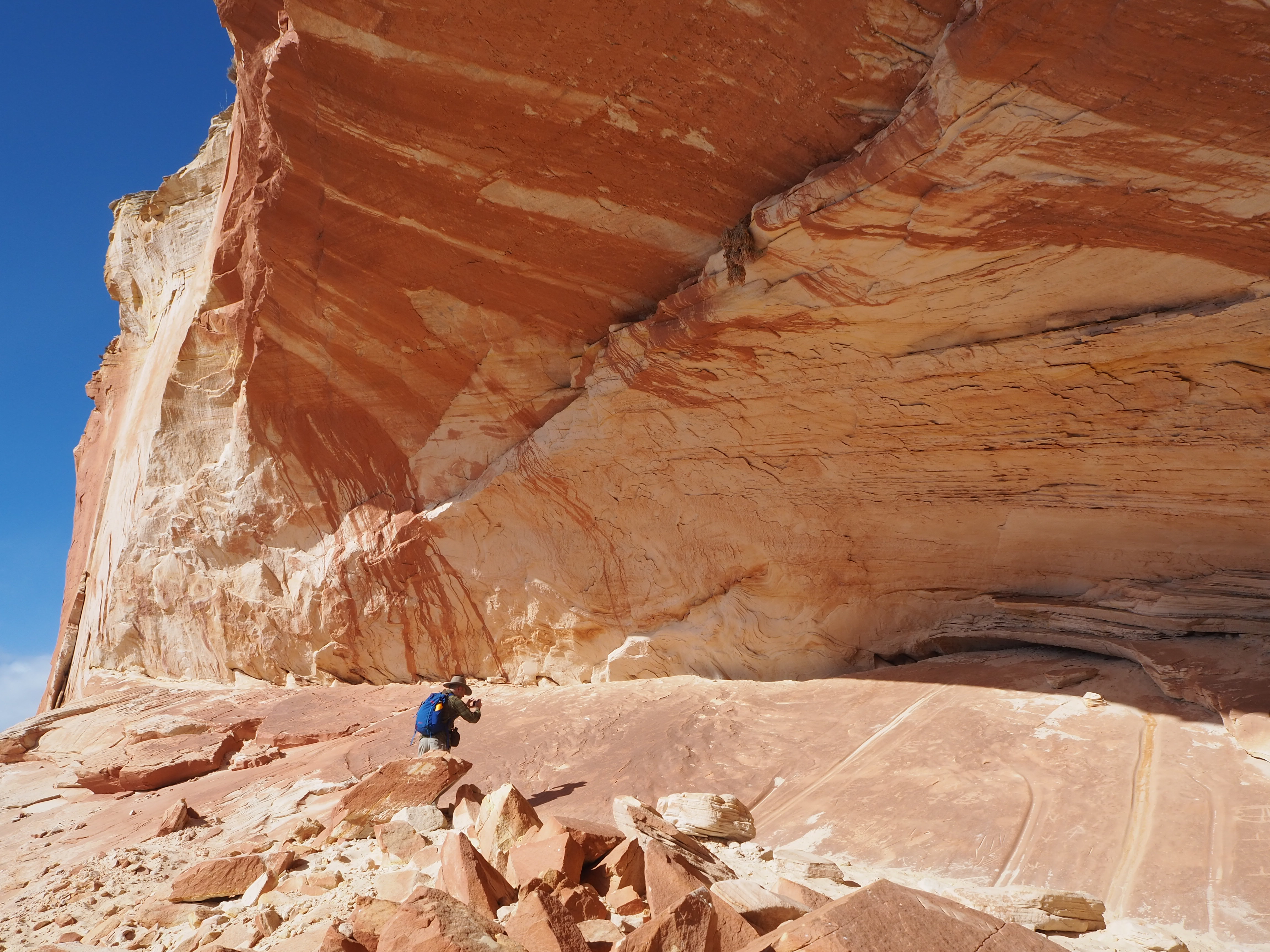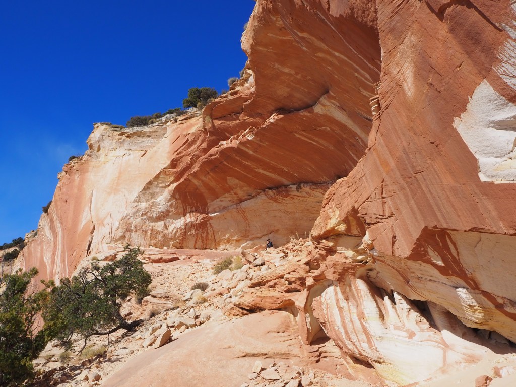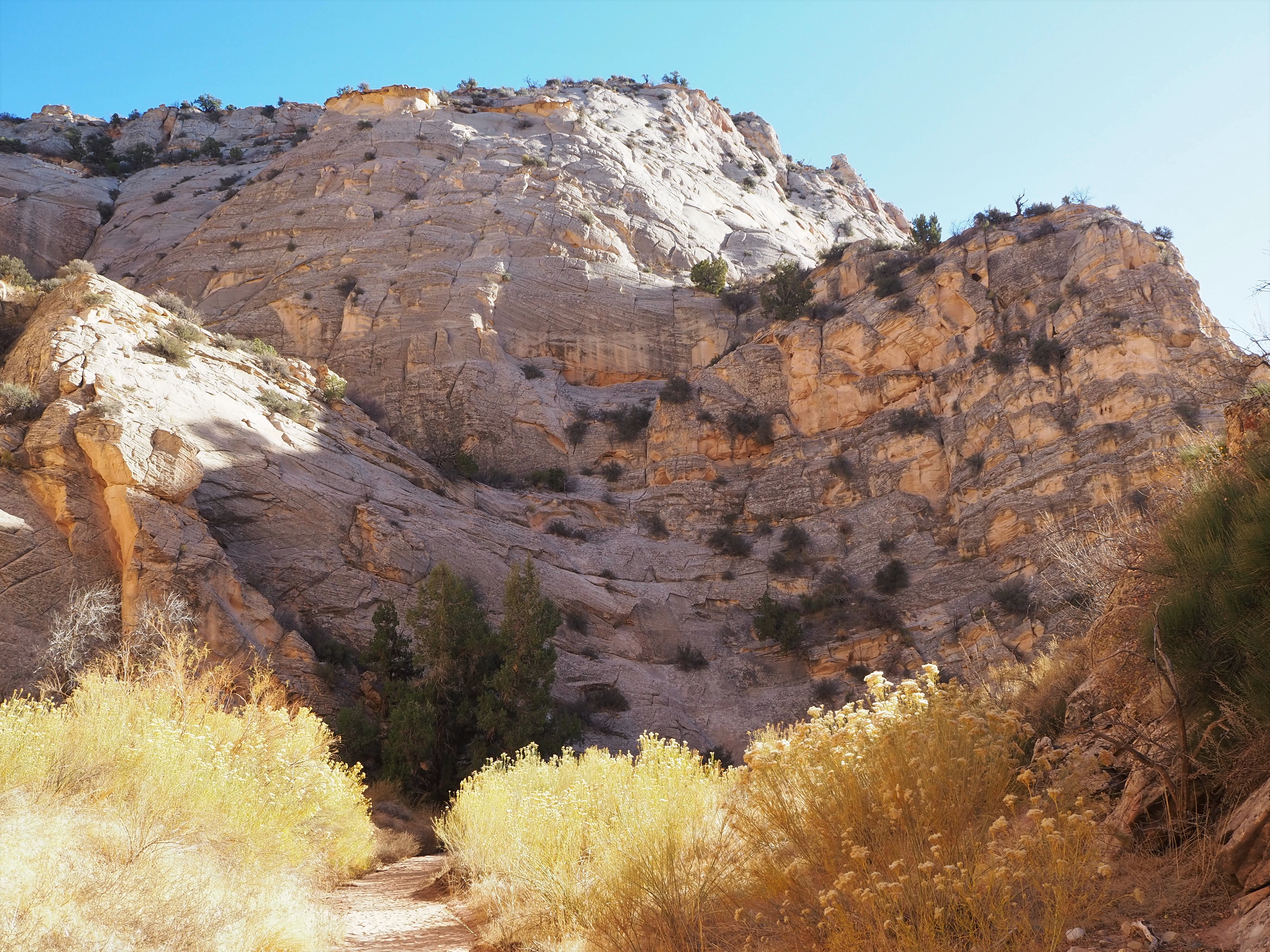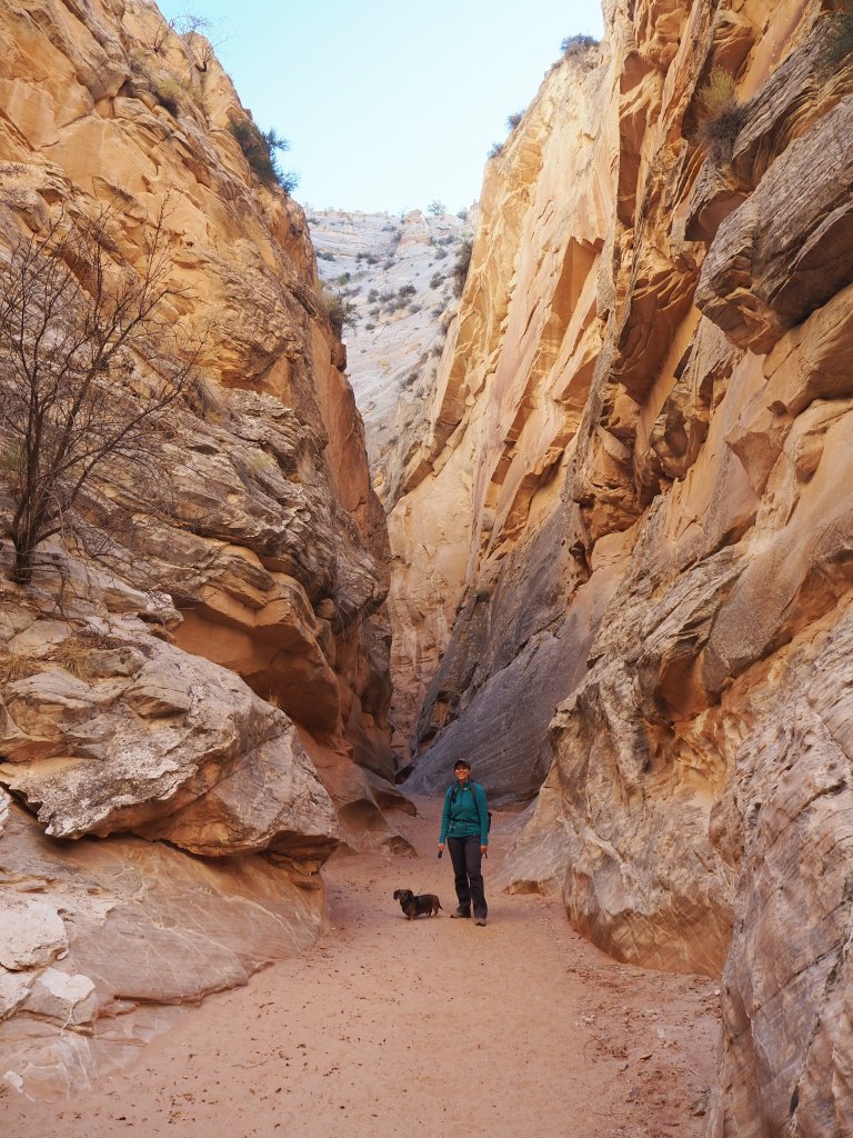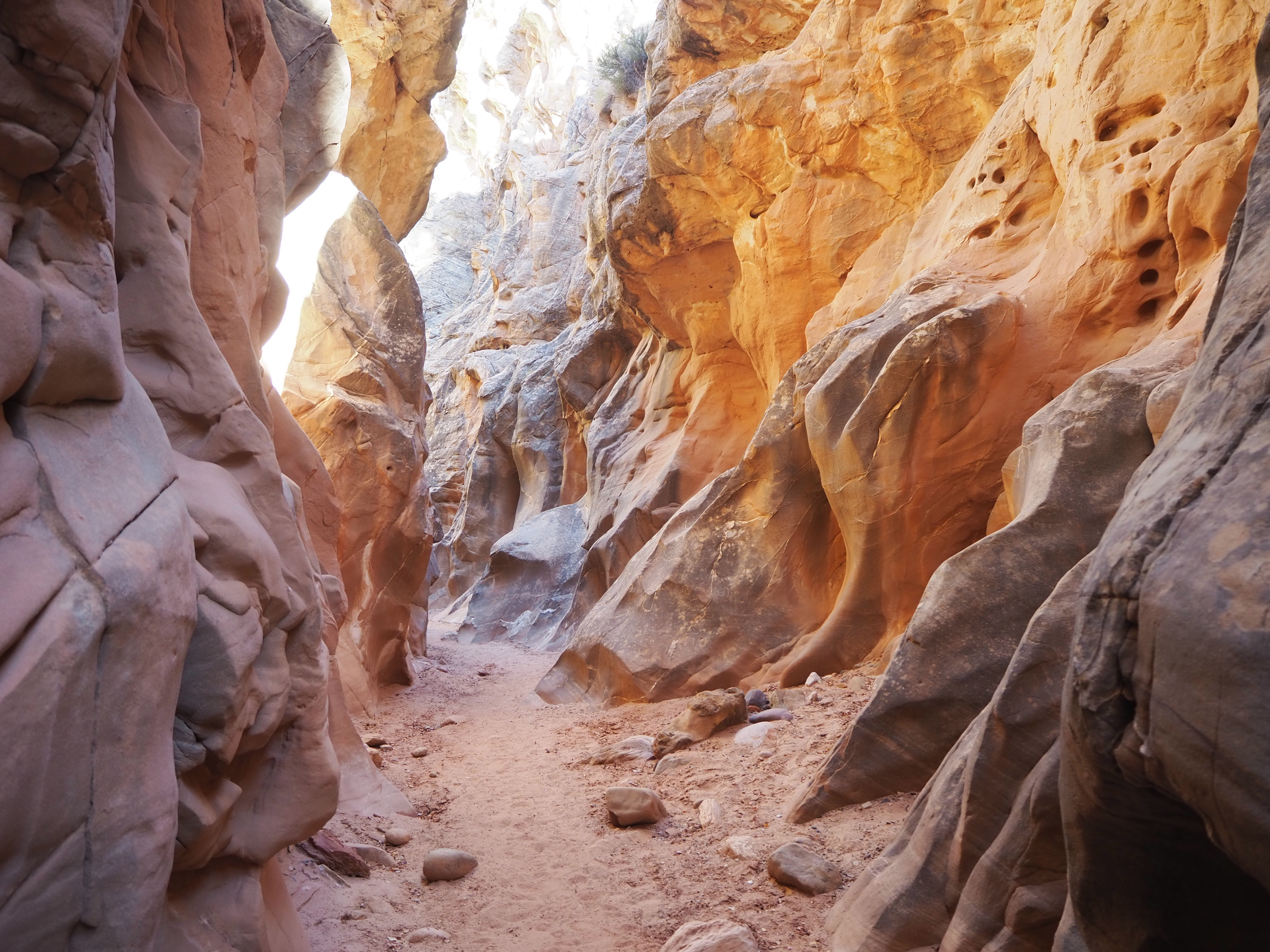 There are two trailheads, a north and south, one at each end of the canyon. Since we were driving the road south to north, we stopped at the southern trailhead to begin the hike. I signed us into the trailhead register, and we set off down the trail to the entrance of the canyon. Not far in we realized there wasn’t a clear path into the canyon due to a collection of flash flood/rockfall debris. However, a quick evaluation showed us an easy way to climb up and over some boulders that would put us on the path above. From there, it was easy walking down the sandy wash hemmed in by towering canyon walls. Warm in the sun on a cool fall day, it could easily become a furnace in the summer. Soon, we reached the first of many narrows, the walls closing in tighter and providing a shady respite from the sun. We let the canyon usher us in and out of its undulating curves, enjoying the spectrum of colors reflected on the sandstone.