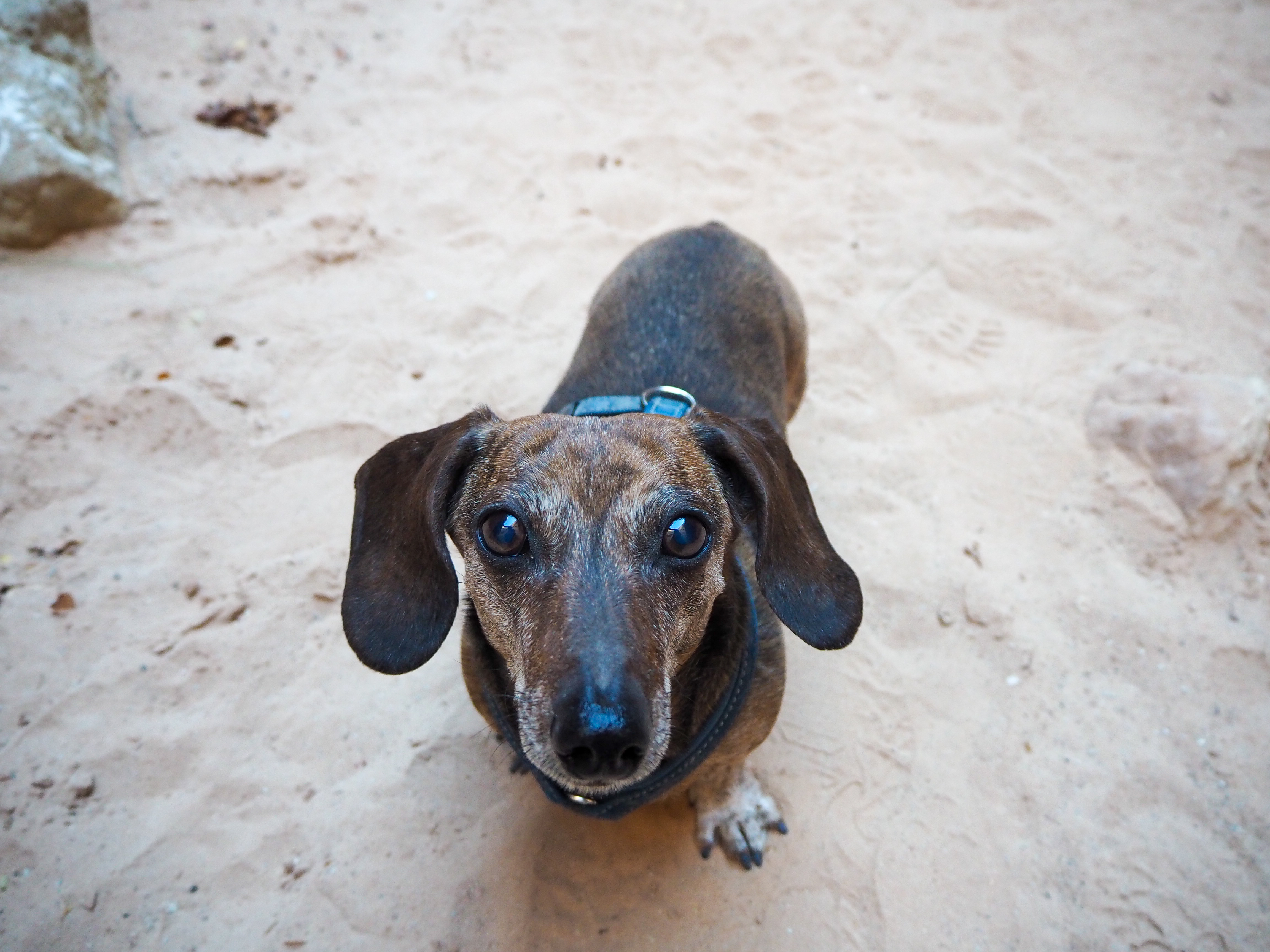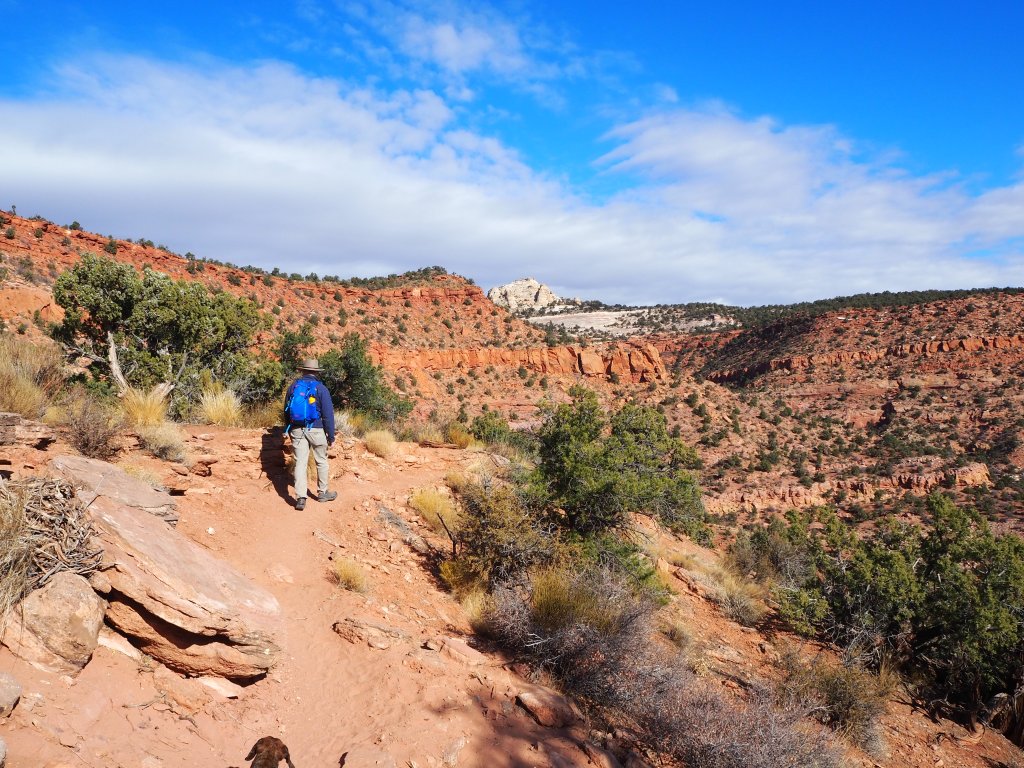 We wanted to get a relatively early start since the hike would be fully exposed. Knowing this is a popular local hike, we weren’t surprised to spot several cars in the lot when we arrived at the trailhead before 10:30am. We made sure we had sufficient water, along with treats for Tru and got started. The initial part of the hike is a series of long ascending switchbacks cut into the red sandstone, stretching to the top of the plateau. This is where most of the elevation gain is found. At times the trail is fairly narrow, but as we climbed I was more focused on the expansive vista we gained with each new level. We could see far south toward the Vermillion Cliffs (where we hiked Wire Pass) and the Kaibab Plateau (which extends to the North Rim).