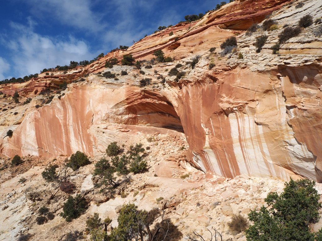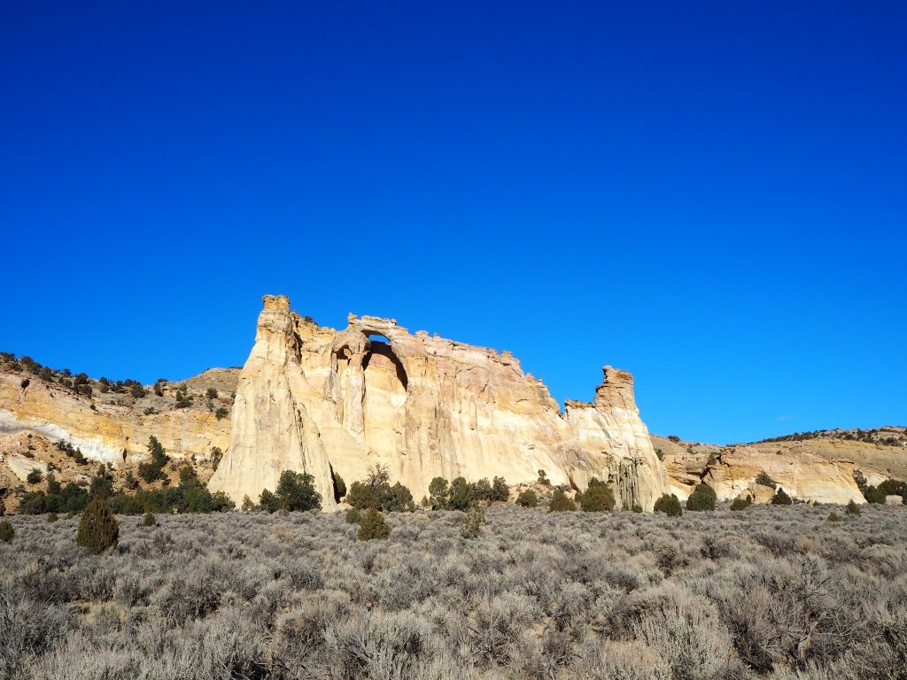 We took some time after our hike to eat our packed lunch back at the car, then continued our tour of Cottonwood Canyon Road. We passed through a particularly cool section of the Cockscomb, jagged teeth of red and orange, lined the roadside. Soon thereafter, the road began to emerge back into familiar scenery: a large open sagebrush plain, bordered in the distance by cliffs and alcoves of red Navajo sandstone. We had one final stop before hitting the pavement: Grosvenor Arch. The arch is the most developed of any stop along Cottonwood Canyon Road. A vault toilet, picnic tables, and an accessible concrete path to the arch invite more than hardy backcountry visitors. Grosvenor Arch is a towering white sandstone formation, striking from a distance and imposing up close. There are several social trails that litter the sagebrush once the paved sidewalk runs out, and we followed a few to get closer to the arch. Again, we were alone to drink in the spectacular scenery before us.