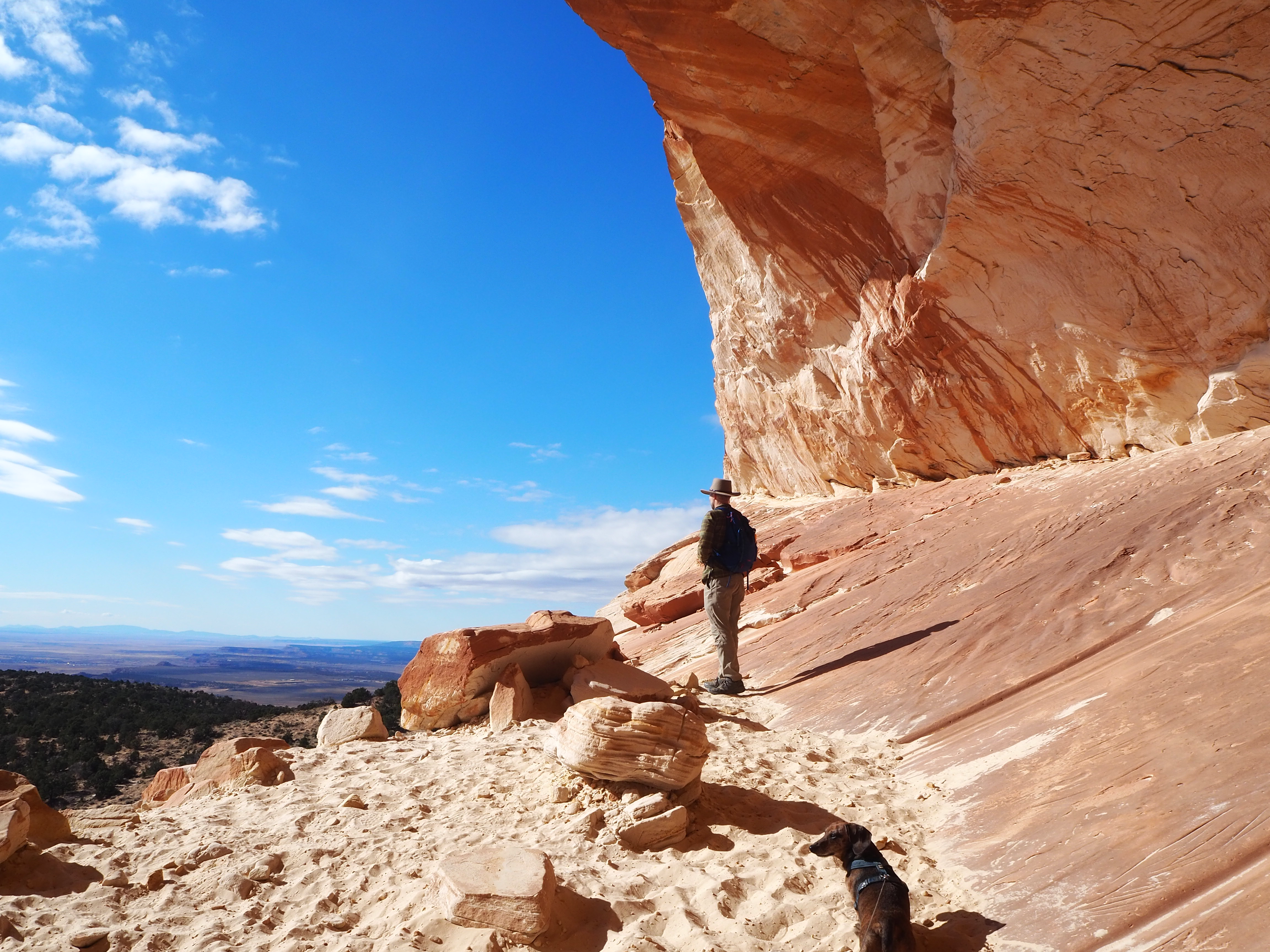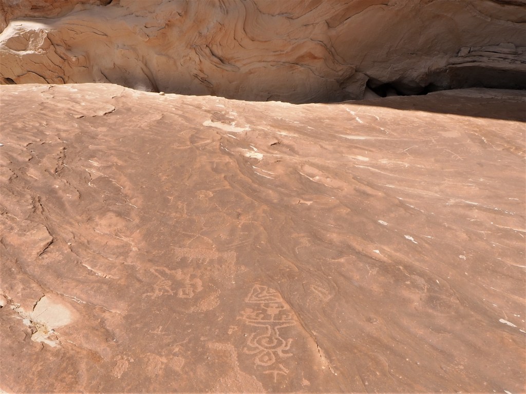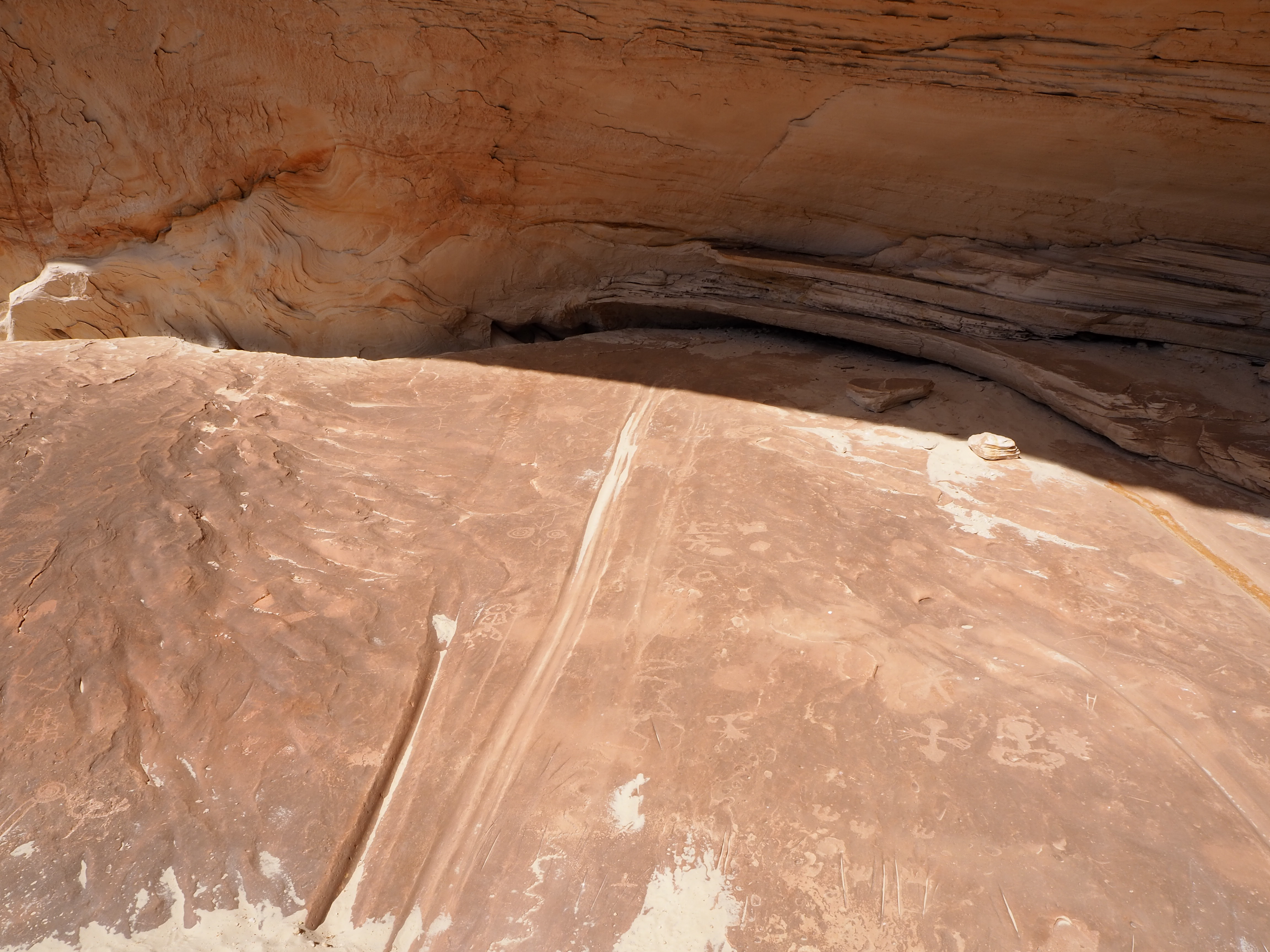 We were delighted to find that we had the alcove to ourselves, though it took us a little time to ascertain the best route to it. In the Kanab tourism description of the hike, they mentioned that the the site was unusual. Thought to date to the Anasazi period, there are deep grooves in addition to the petroglyphs that cover the floor of the alcove. The grooves have not been seen at any other site so far. We took our time surveying the markings, taking care not to step on any as we crossed the cave. In addition to the rock art, the view from the alcove was spectacular. When another couple entered the alcove, we ceded our time and retreated to the shade of a juniper for our lunch. The return was even more pleasant as we scaled back down the plateau to the car, grateful we had the fortune to do most of the trek in solitude.