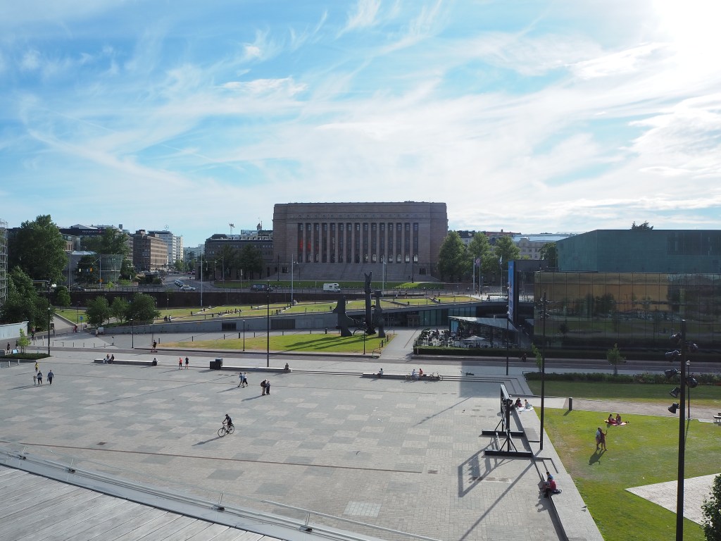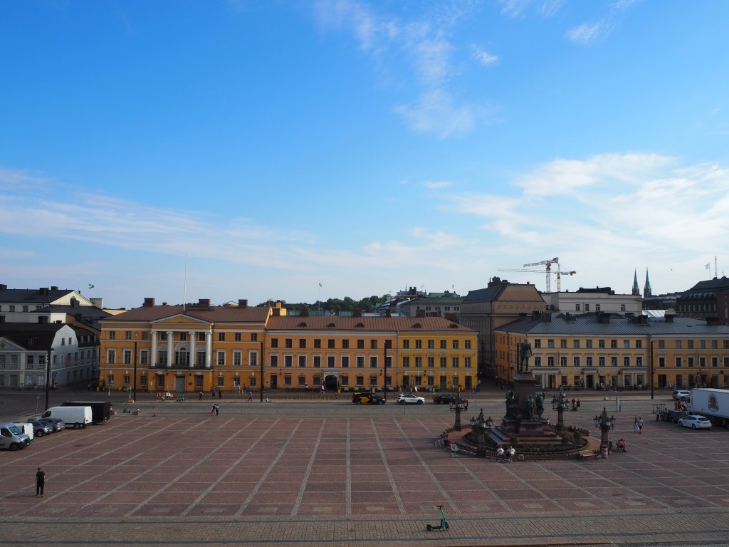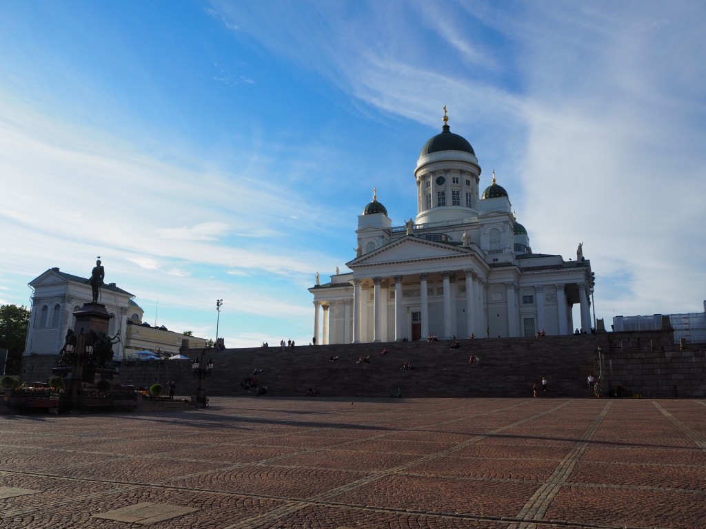 The Square was bathed in a harsh glow illuminating the neoclassical buildings at its eastern edge. Four buildings flank the square, all designed by the same man, Carl Ludvig Engel. The Helsinki Cathedral rests prominently above the Square, while the Government Palace, the main building of the University of Helsinki, and the National Library of Finland enclose its other sides. (At the time of our visit, the university’s main building was under renovation.) In the center of the square, a statue of Russian Tsar Alexander II commands attention.