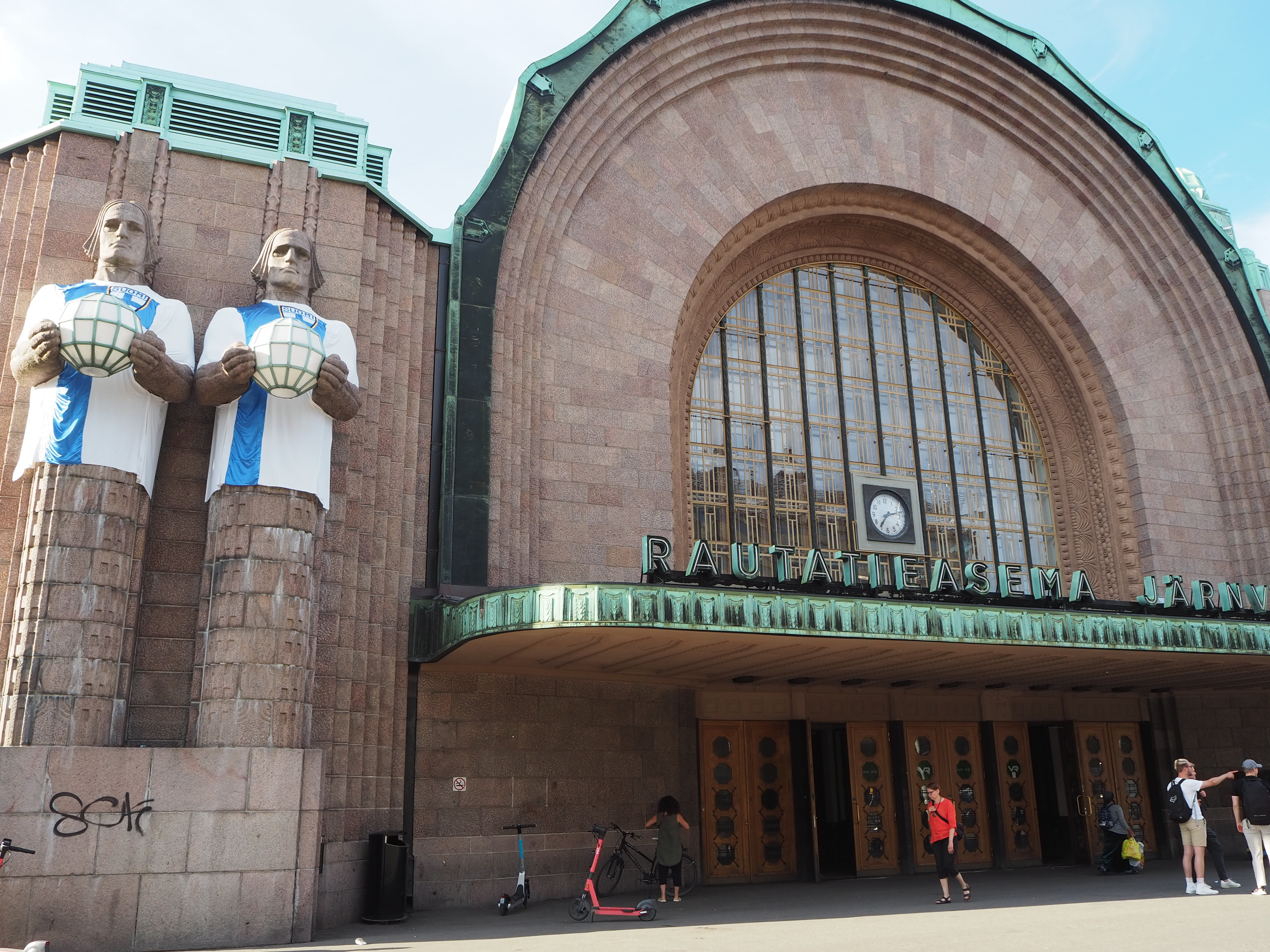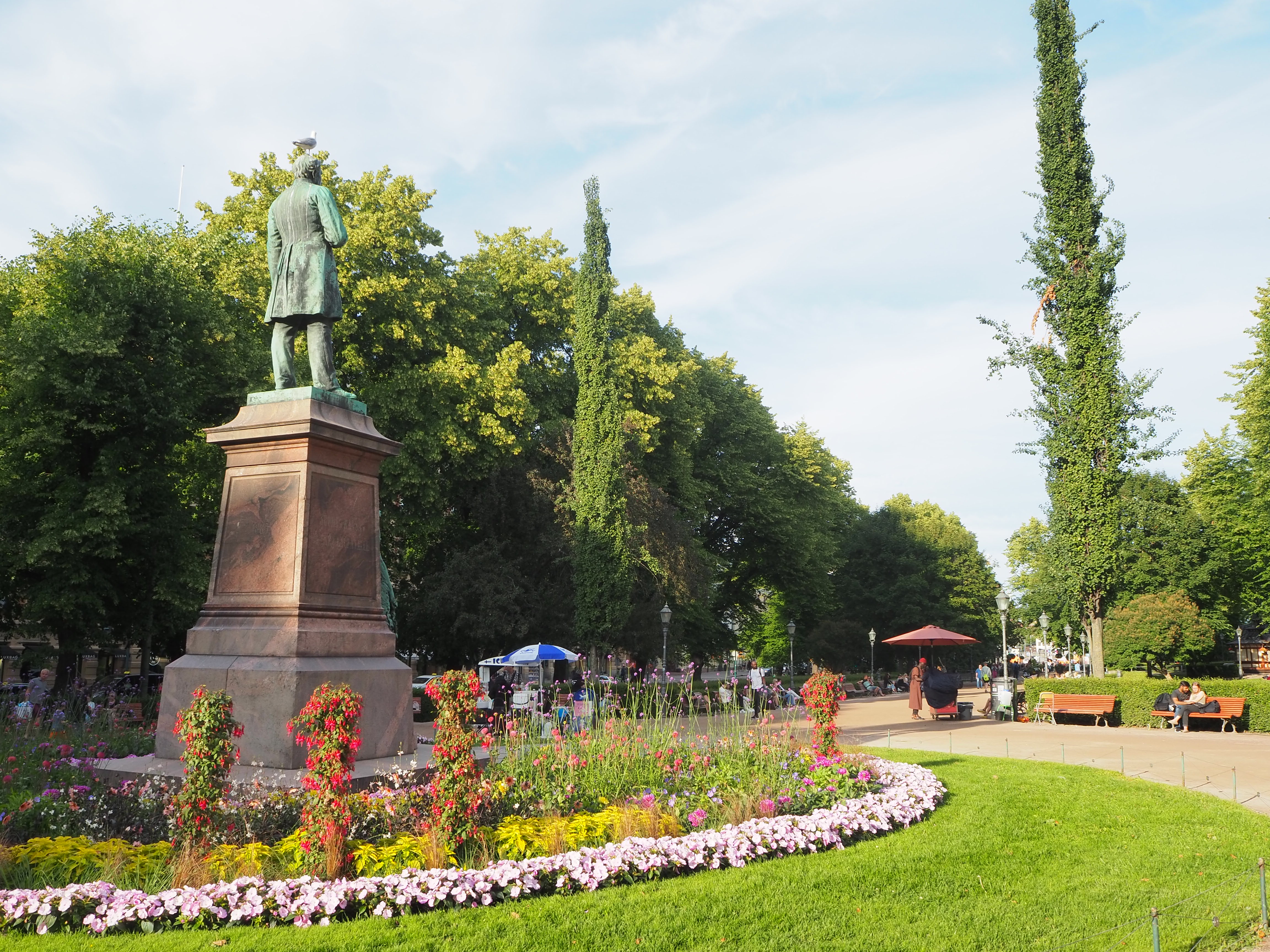 From Oodi, we continued our walking tour passing Helsinki Central Station where we had arrived earlier in the day, and navigating the wide boulevards to Esplanadi Park. Espa, as it’s called, originated as a park for the gentry but eventually became a place for anybody and everybody to be seen. The park and surrounding streets were alive with people walking, lounging, eating ice cream, or enjoying a drink on a cafe terrace. It was buzzing. The park is narrow with a wide gravel path bordered by benches and lime trees and a grass lawn flowing toward its street enclosure. We followed the park down to Market Square where the vendors were packed up for the day and turned back up toward Senate Square.
