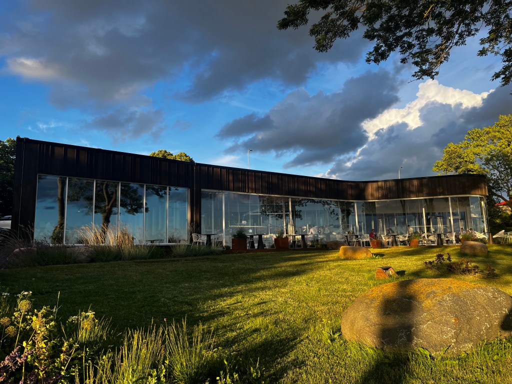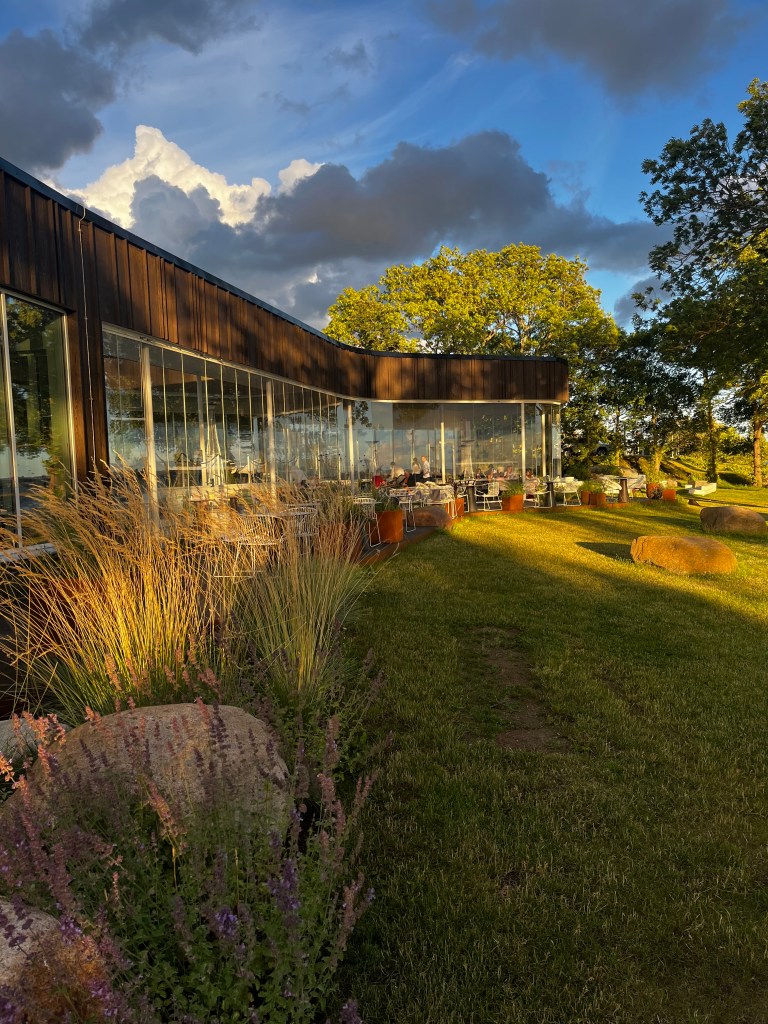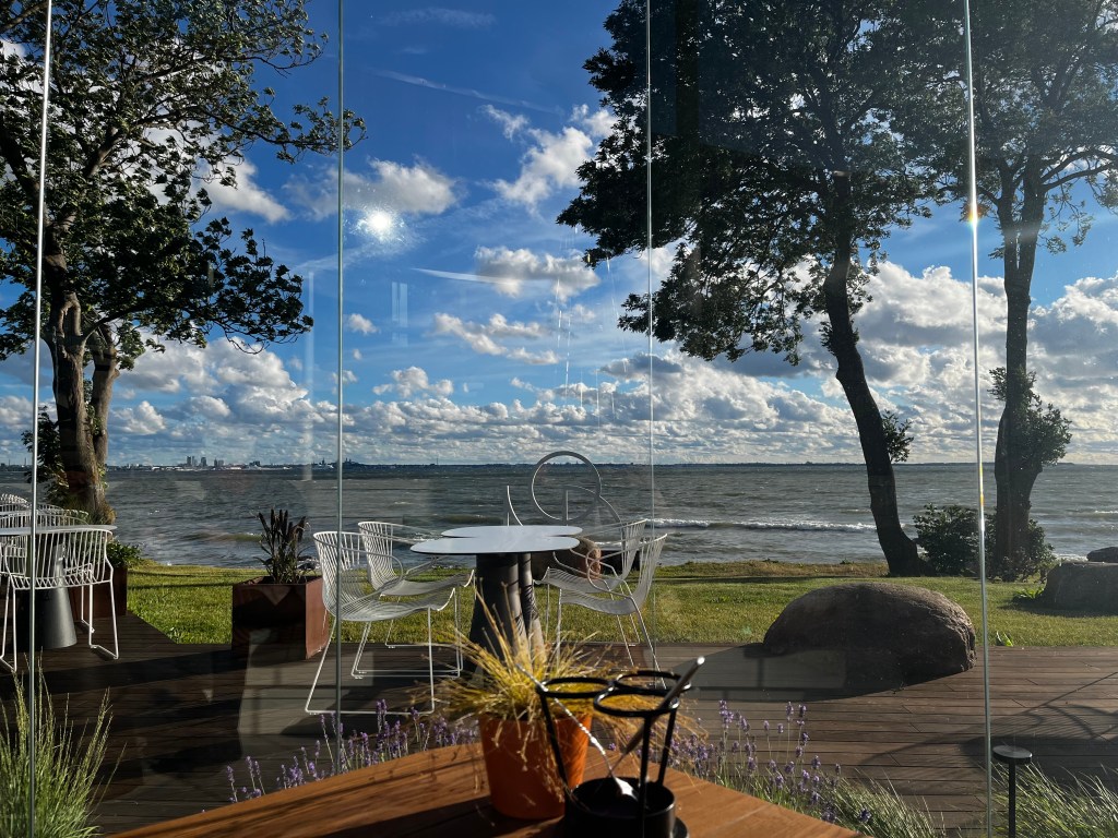 When we had lunch with Pasi in Helsinki, he recommended a restaurant on the outskirts of Tallinn: Noa. We made reservations for dinner and a 20-minute bus ride brought us to the restaurant nestled up against the sea with a view of Tallinn in the distance. Since we were seated on the terrace on a rather windy day – we watched as the sea was whipped continually by the wind – the terrace was enclosed with a series of glass panels, allowing for the full effect of the terrace view to remain unbroken, but for the diners to be more comfortable. An opening in the ceiling allowed the air to circulate and the wind could even be felt from time to time. From our seats, we could see across the bay to Tallinn and many of the Old Town landmarks rose familiarly out of the skyline. We each had a drink and an entree and shared cheesecake for dessert. They also served us black bread with sea salt butter, herbed butter, beetroot hummus, and gherkins. It was all incredibly decadent and delicious, and I imagine we were the only diners to arrive by bus.
